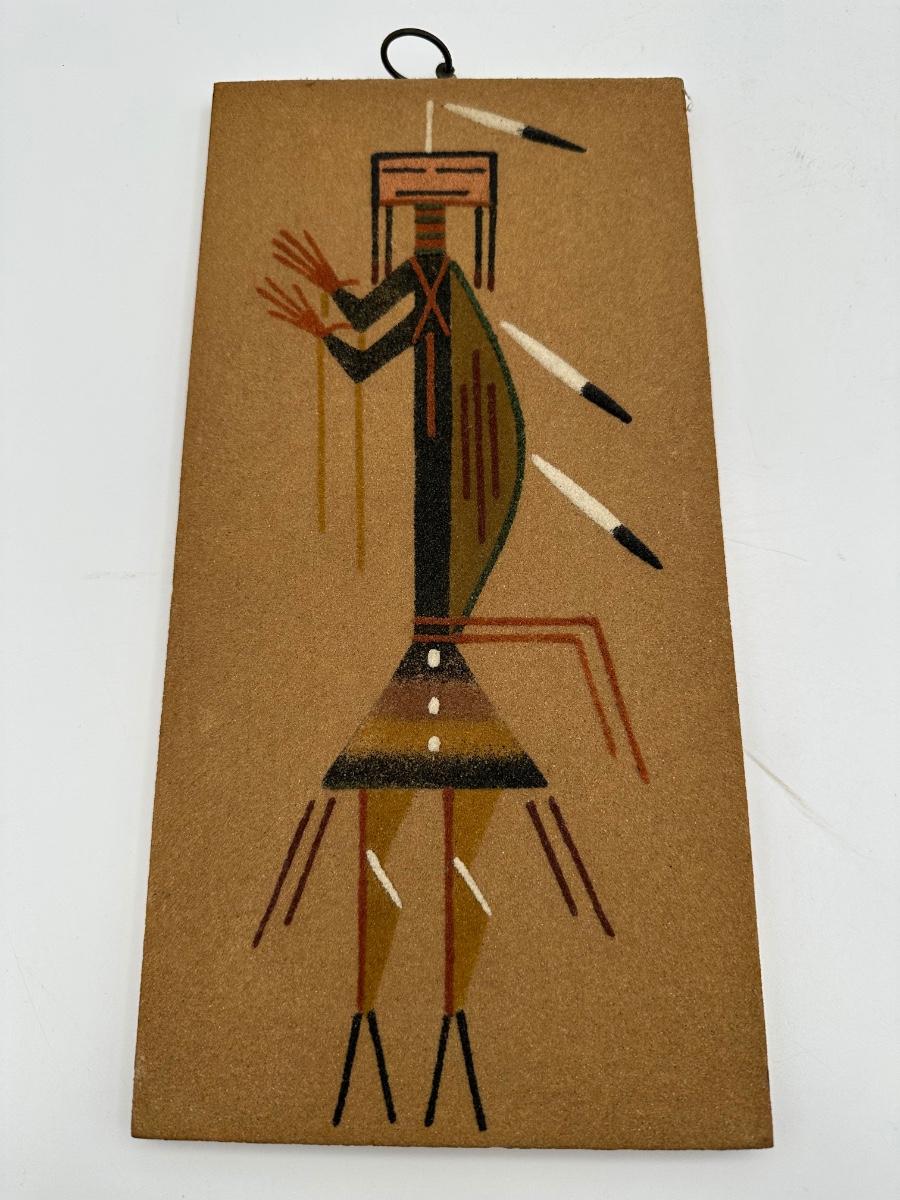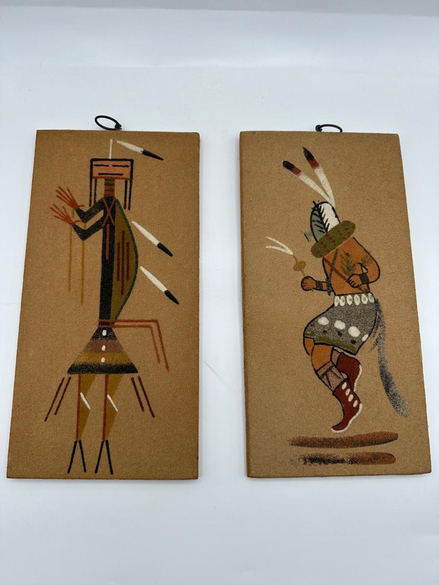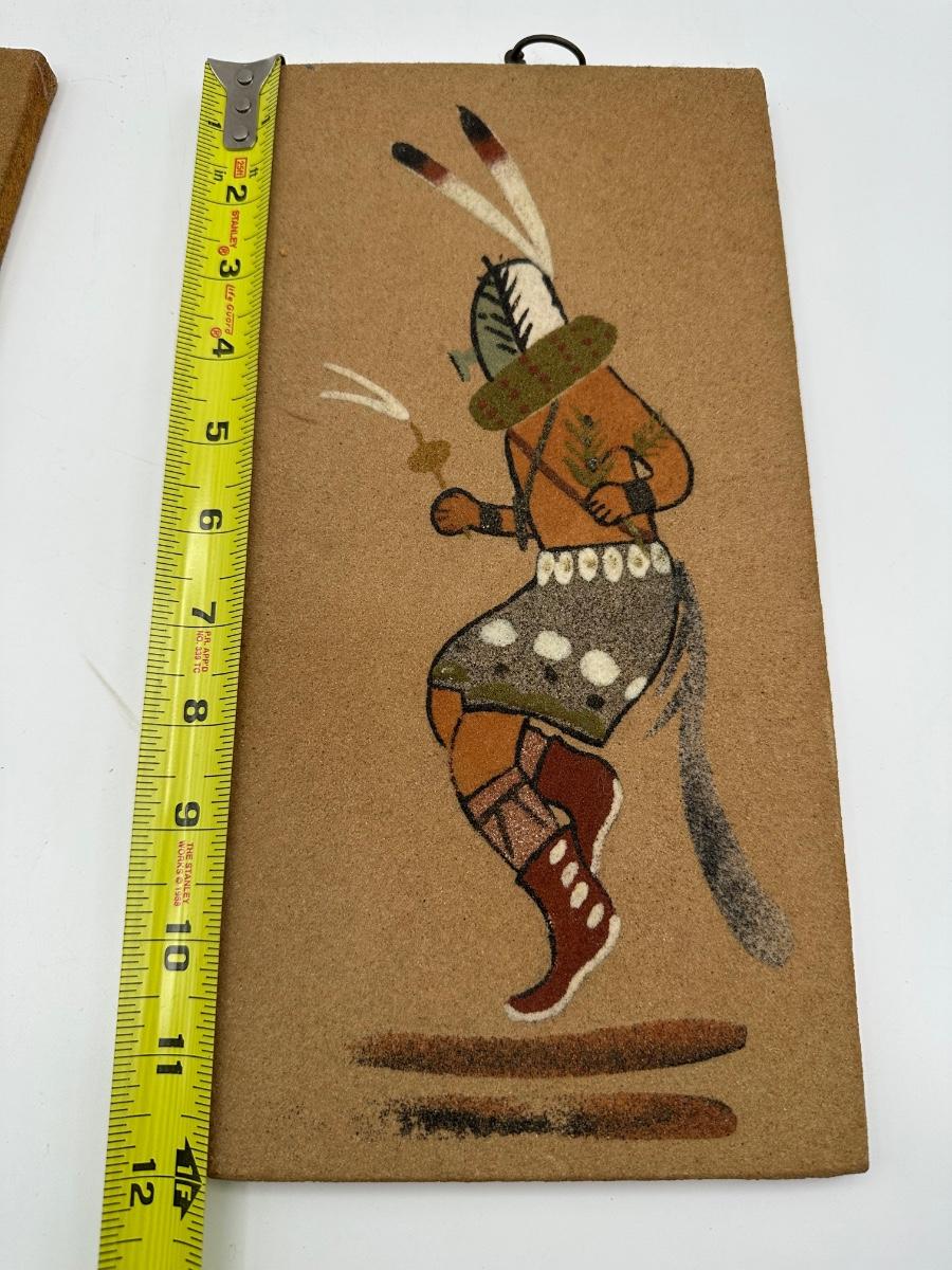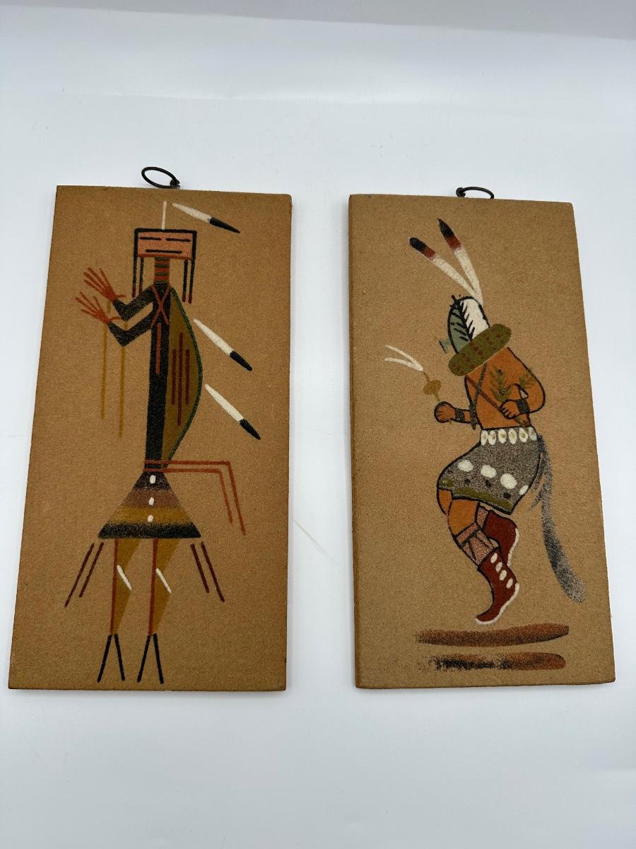 Pair of vintage Indonesian sand art panels featuring a tribal dancer and shaman figure. Handcrafted with colored sand on wood, each piece includes a built-in hanger for easy wall display. Unique mid-century folk art with bold, cultural style.