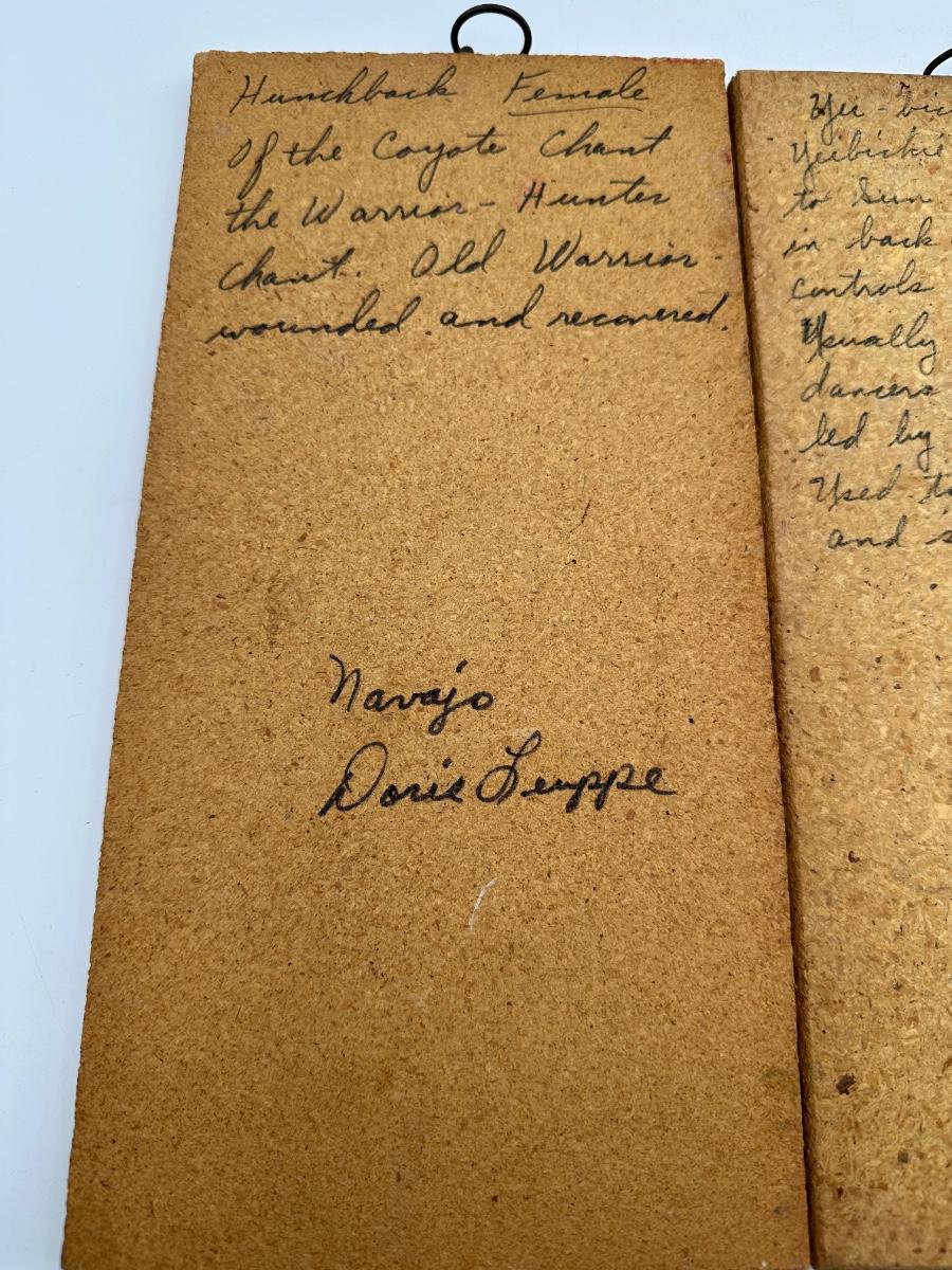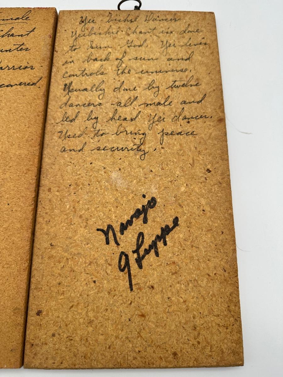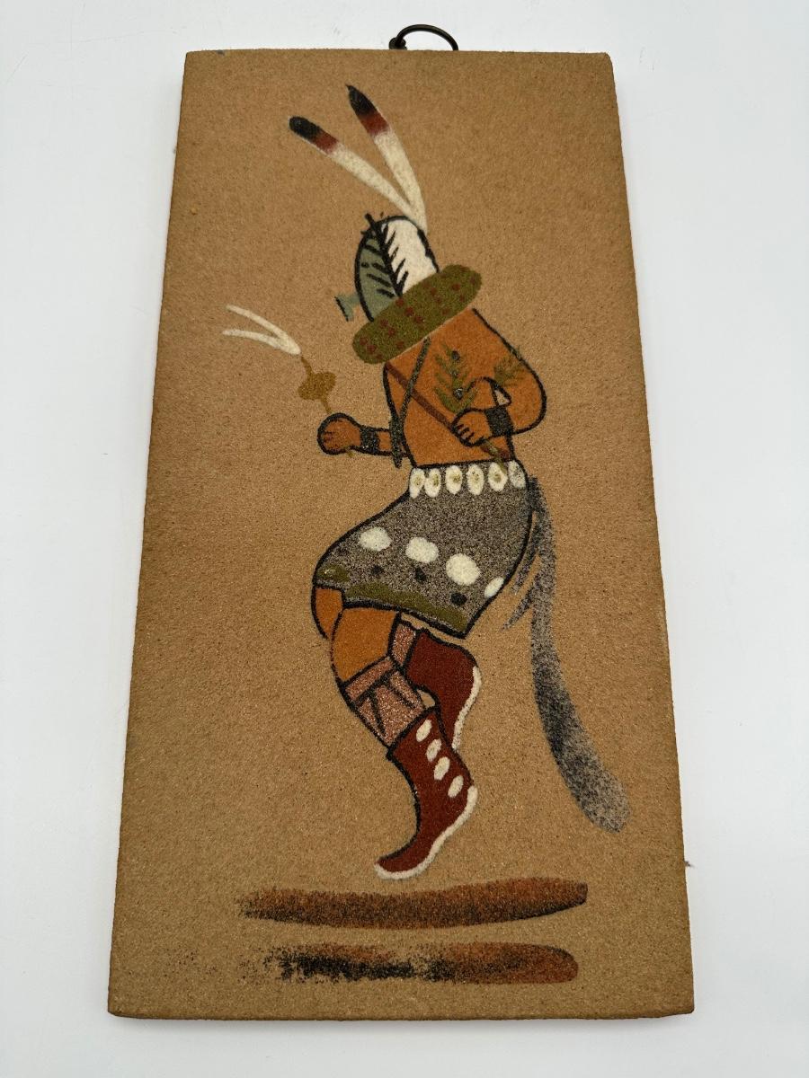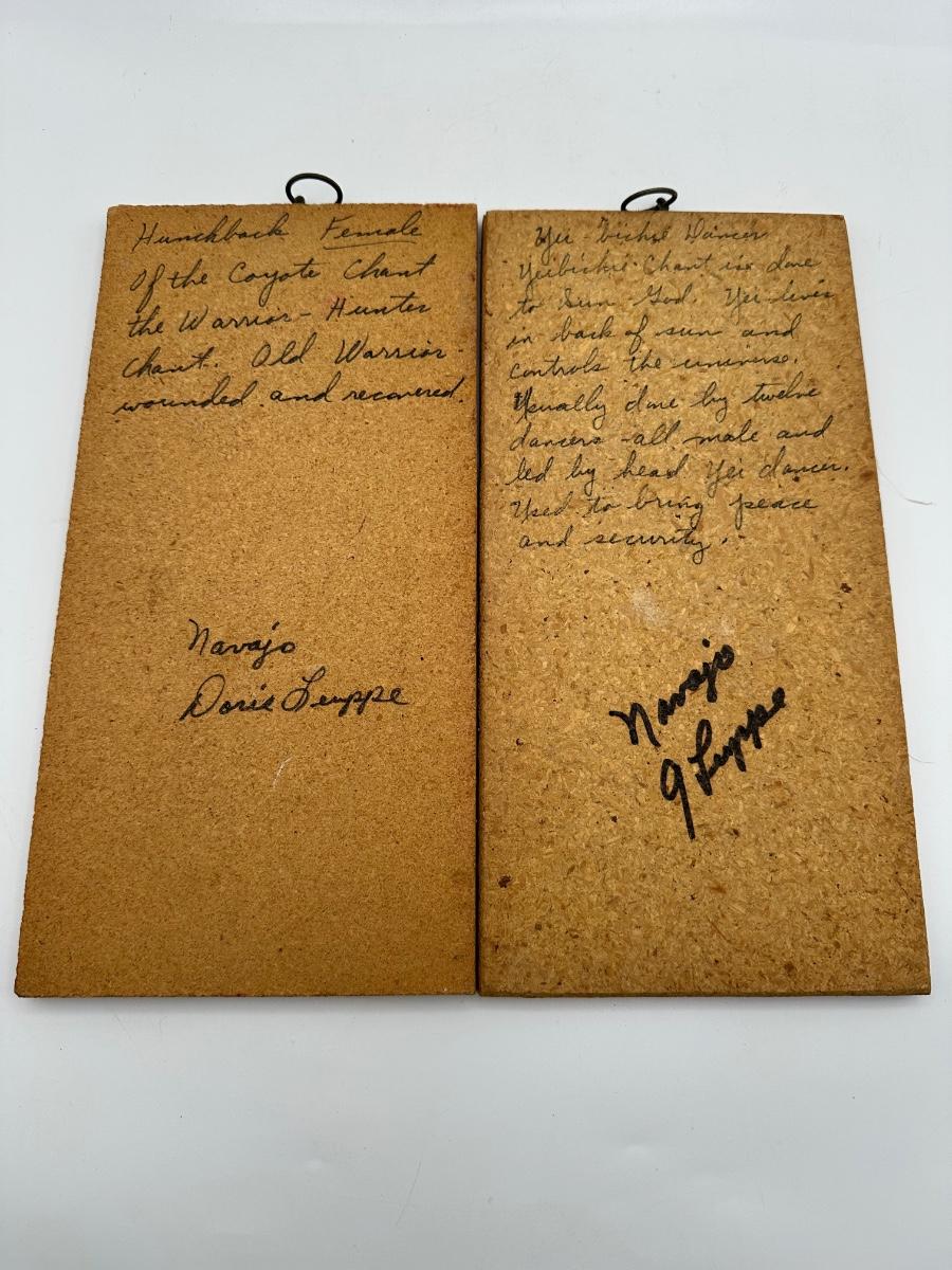 Pair of vintage Indonesian sand art panels featuring a tribal dancer and shaman figure. Handcrafted with colored sand on wood, each piece includes a built-in hanger for easy wall display. Unique mid-century folk art with bold, cultural style.