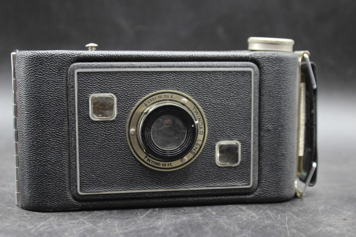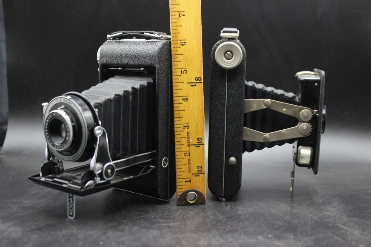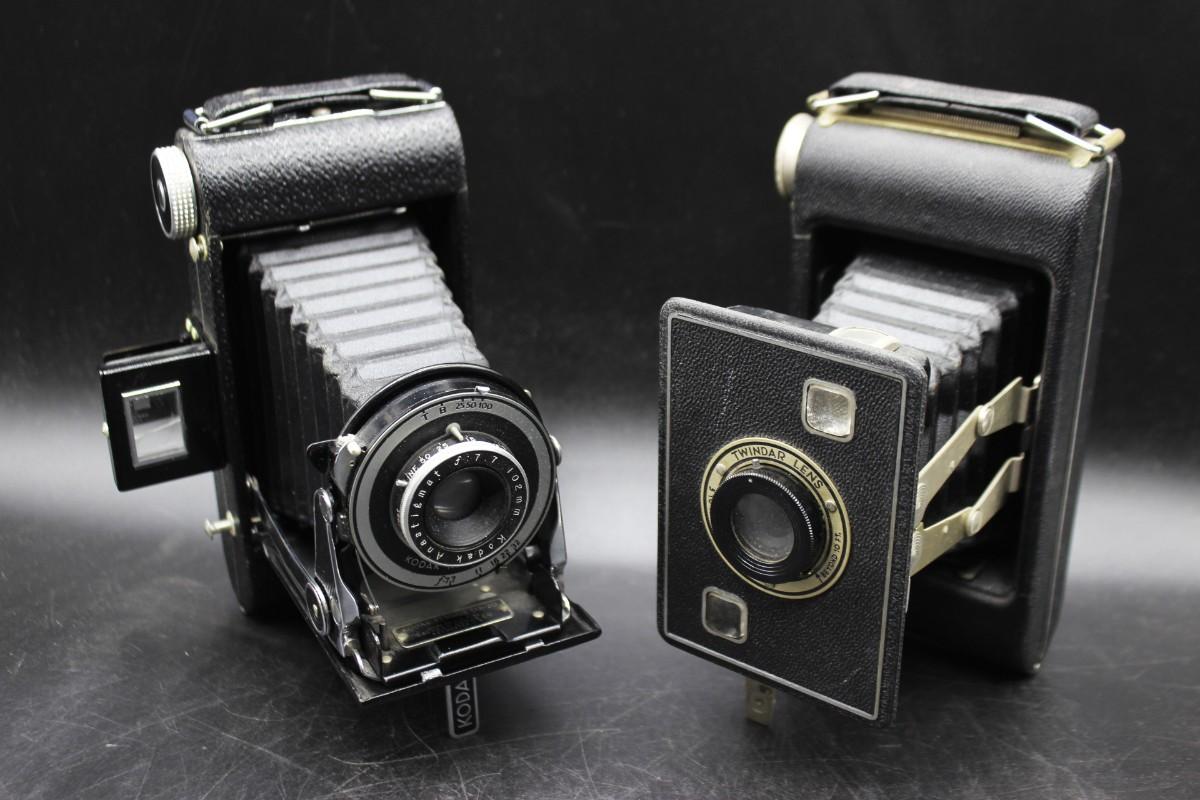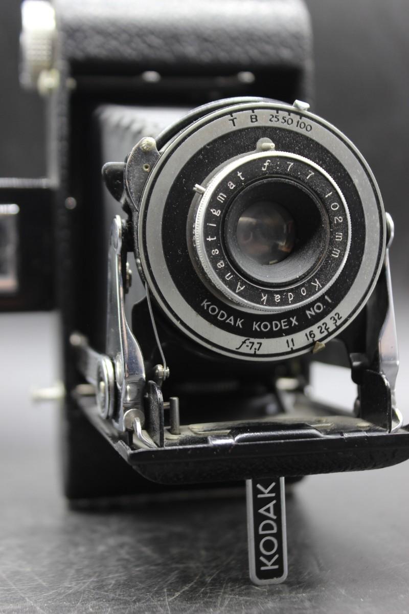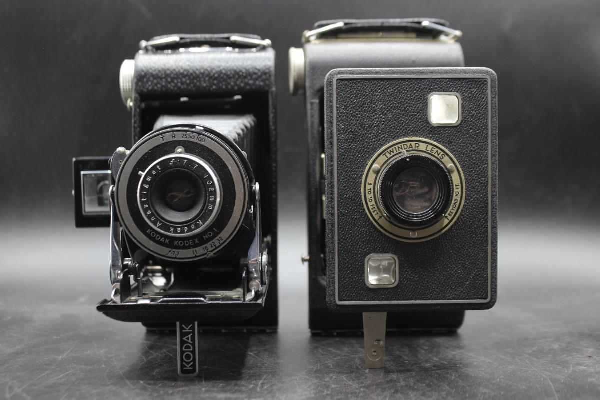Pair of Vintage Kodak Film Cameras Kodak Kodex No. 1 & Kodak Tindar Lens, the hinges are a little bent on the Kodex camera, but there is no other significant damage to the cameras and is good vintage condition. Has not been tested, check pictures for more details and for sizing.