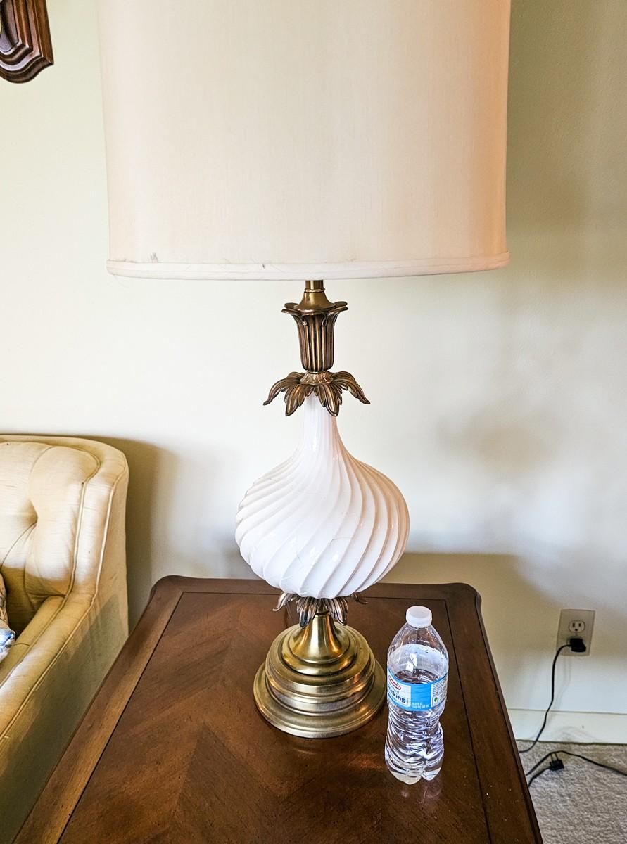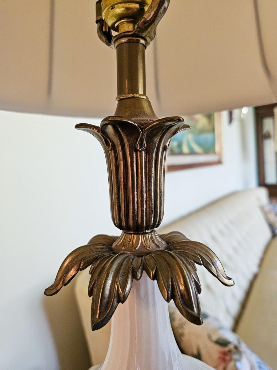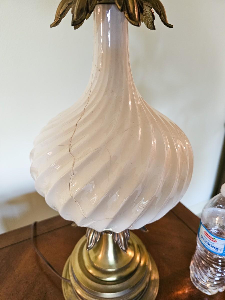 Vintage white lamps with brass details. One lamp has been repaired, please see photos to note condition.