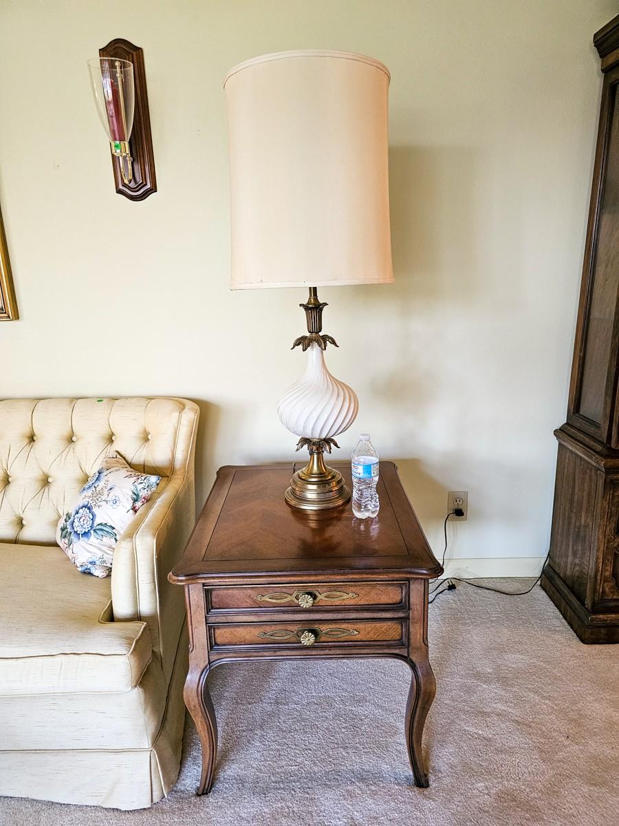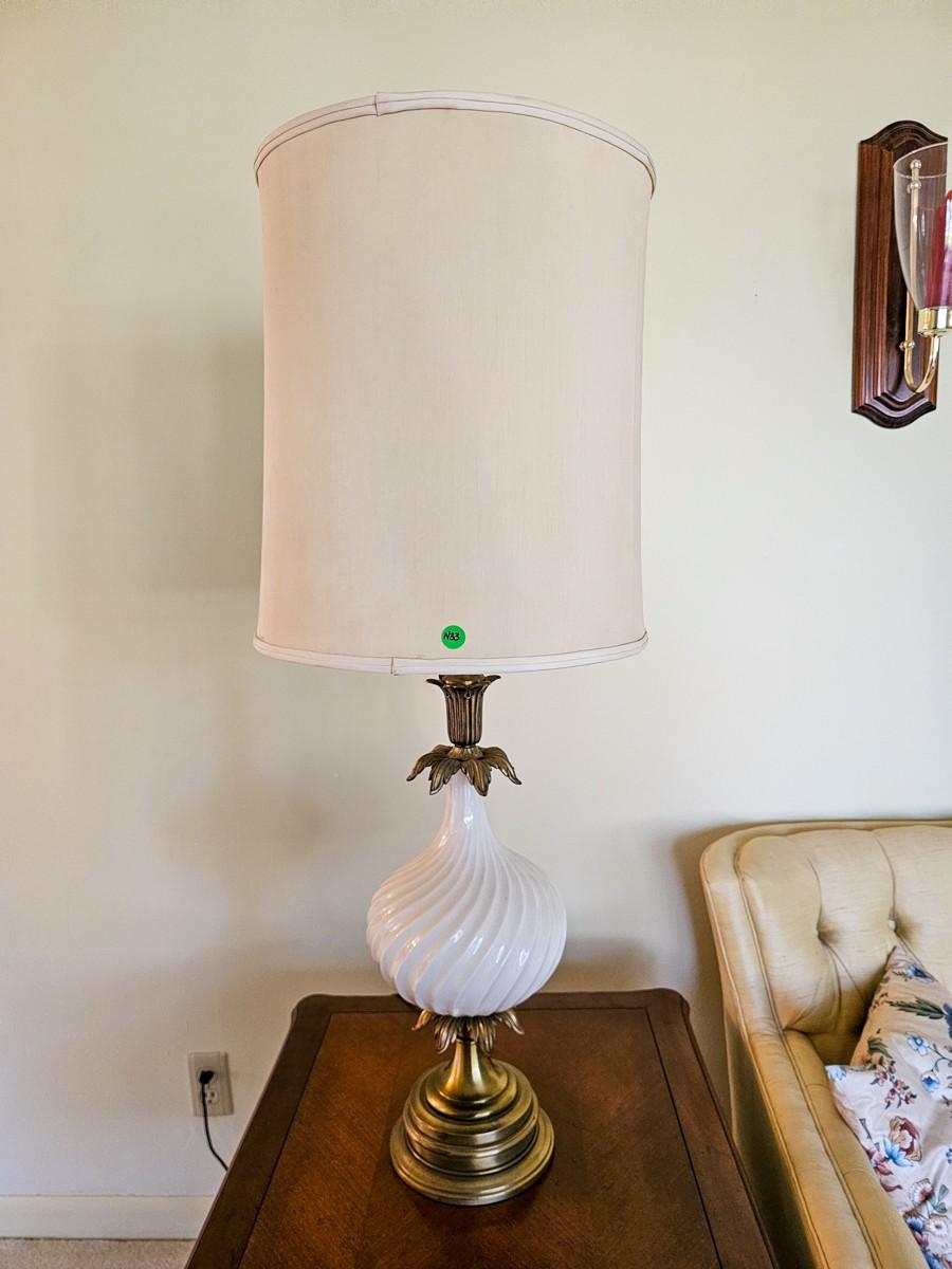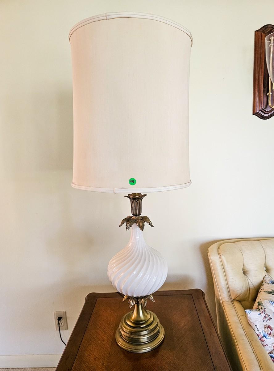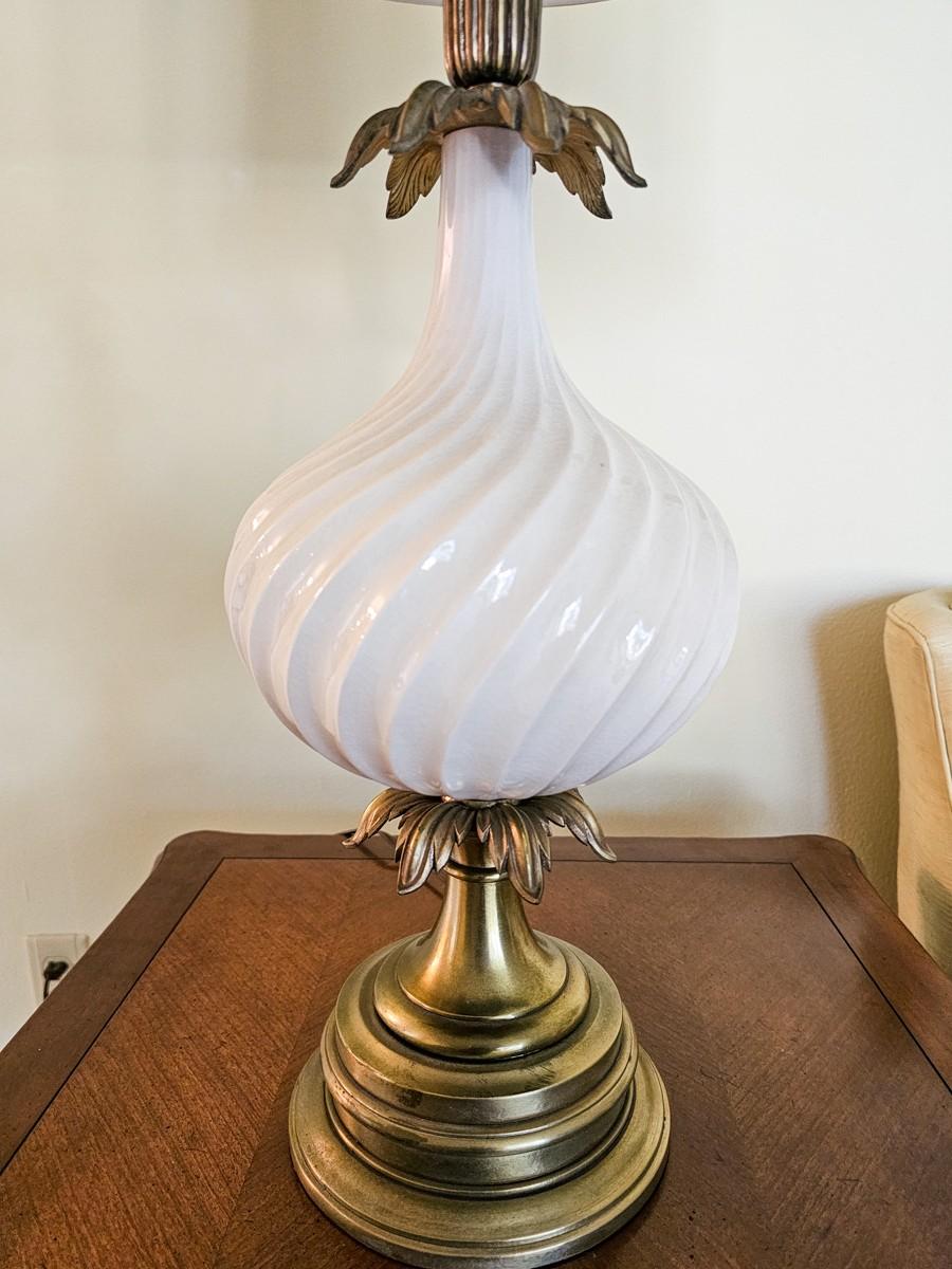 Vintage white lamps with brass details. One lamp has been repaired, please see photos to note condition.