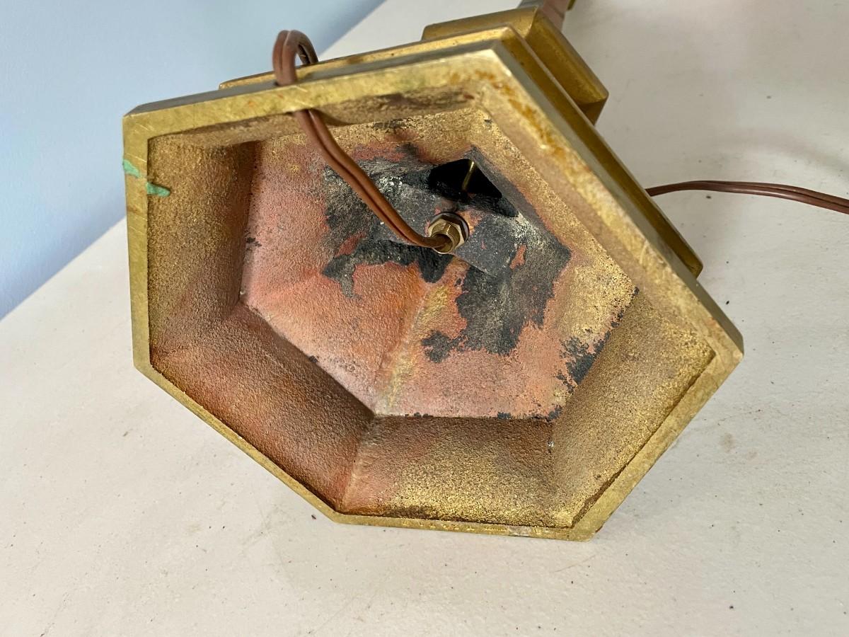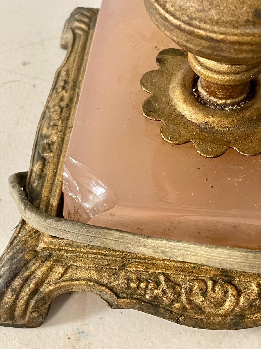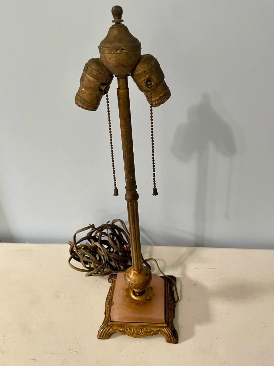 Glass base is chipped, needs rewiring. The brass lamp works.