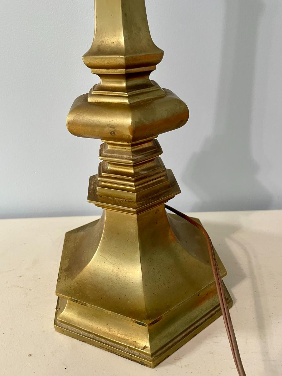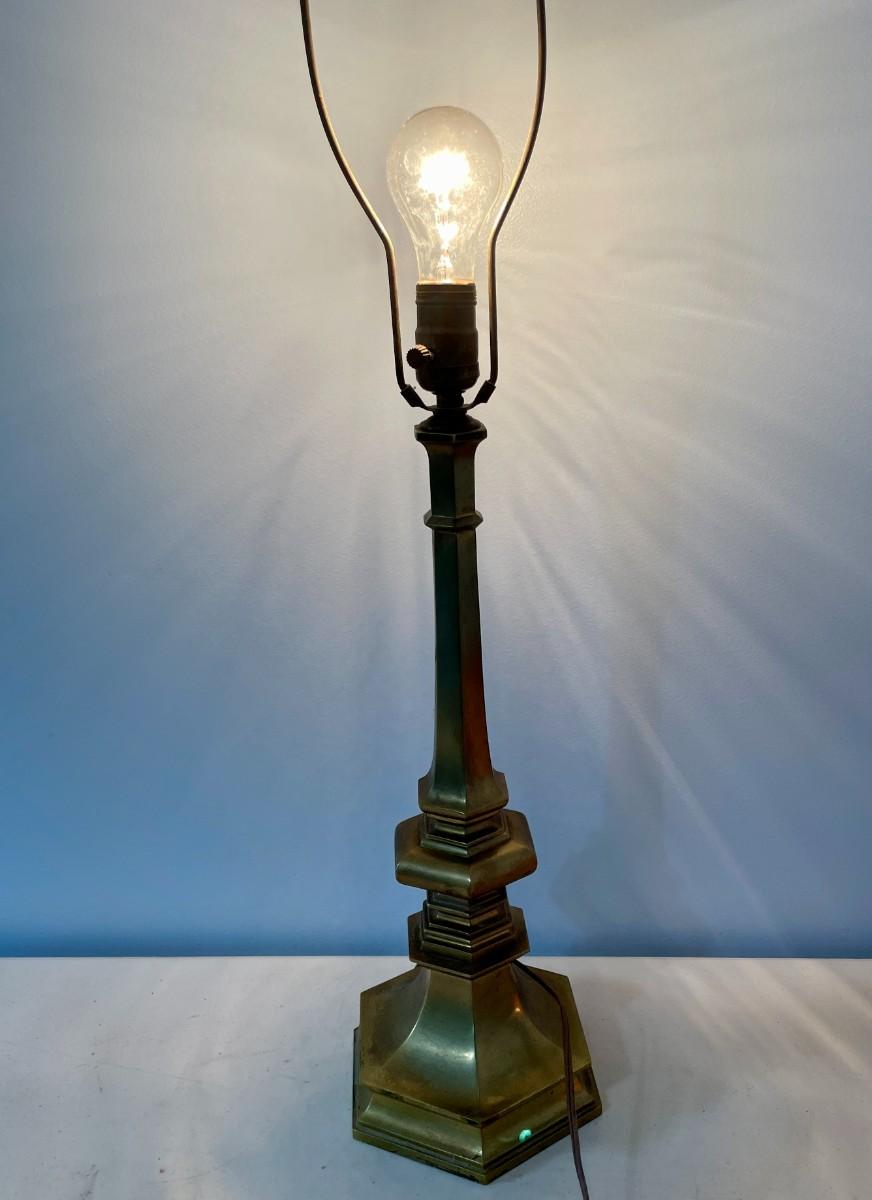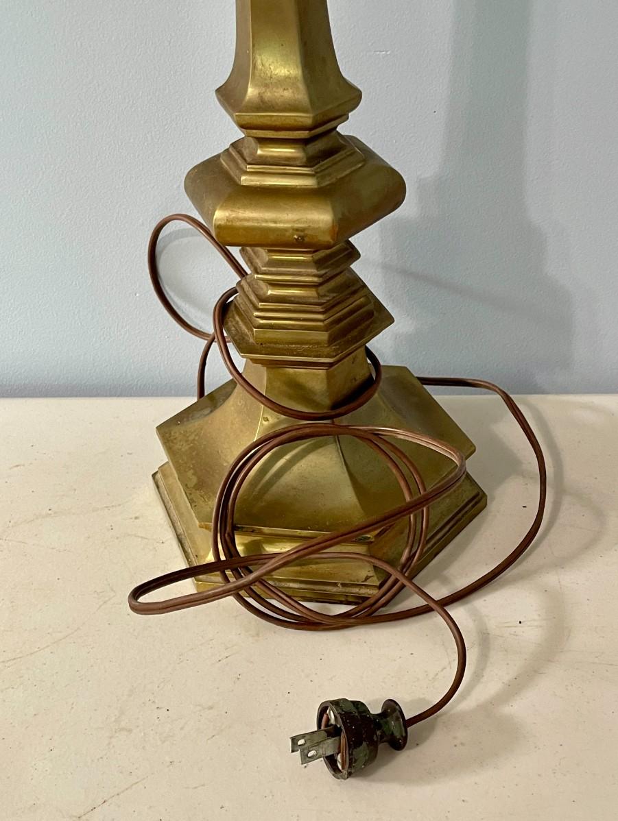 Glass base is chipped, needs rewiring. The brass lamp works.