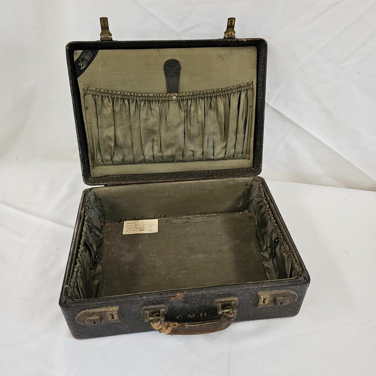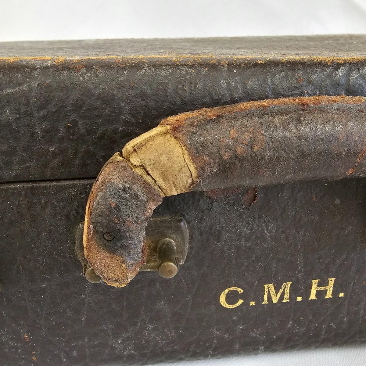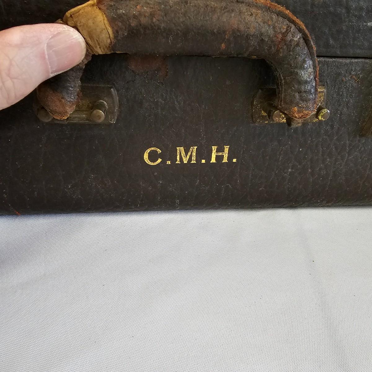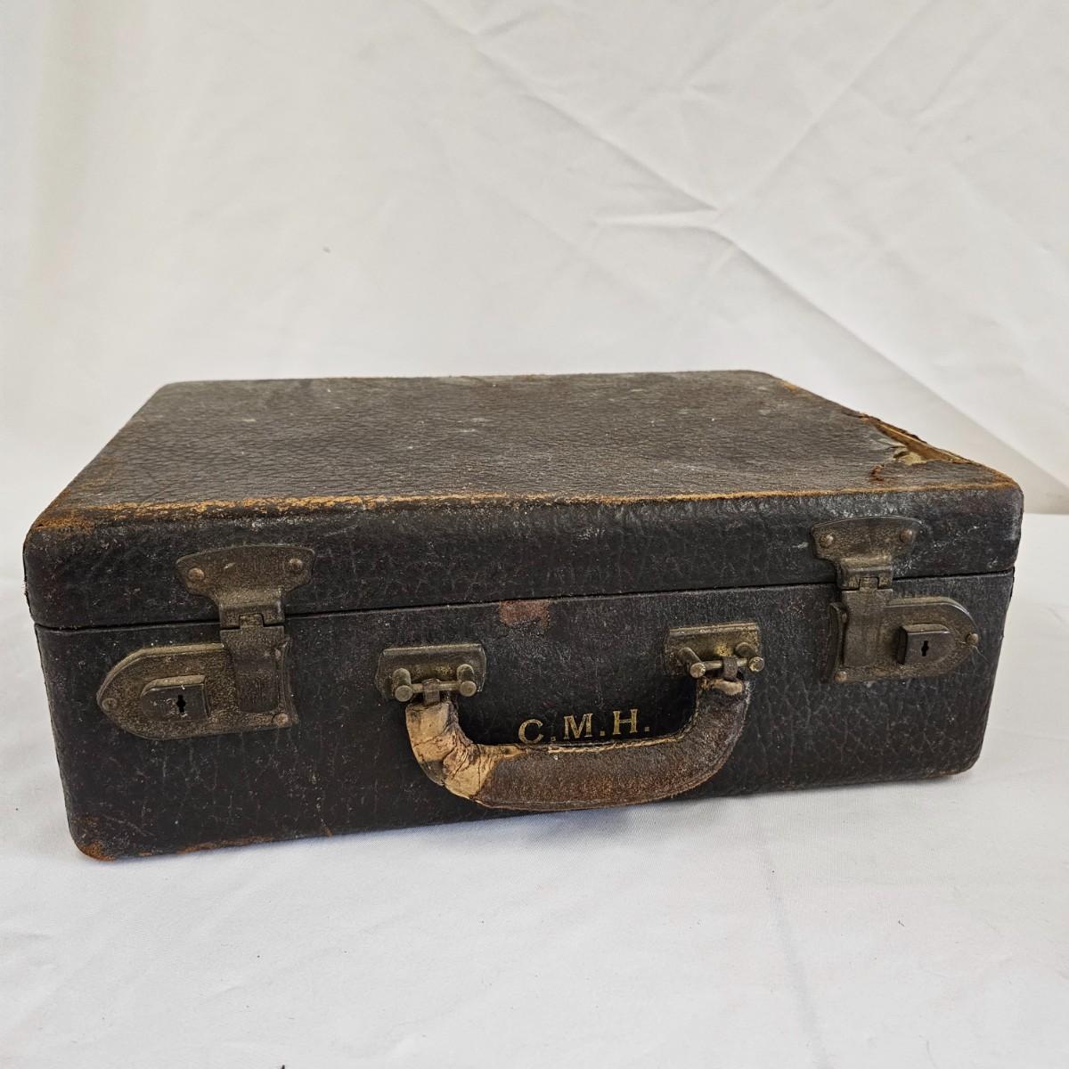 A pair of vintage leather suitcases/luggage. Well worn and patinaed, these pieces have all metal hardware and all latches function. No keys included. The handles on each piece are worn as are the edges of the cases. Small case measures 15" x 11" x 5"H, has initials C.M.H. Large case is 22" x 12.5" x 5"H. See photos for details. Shipping available.