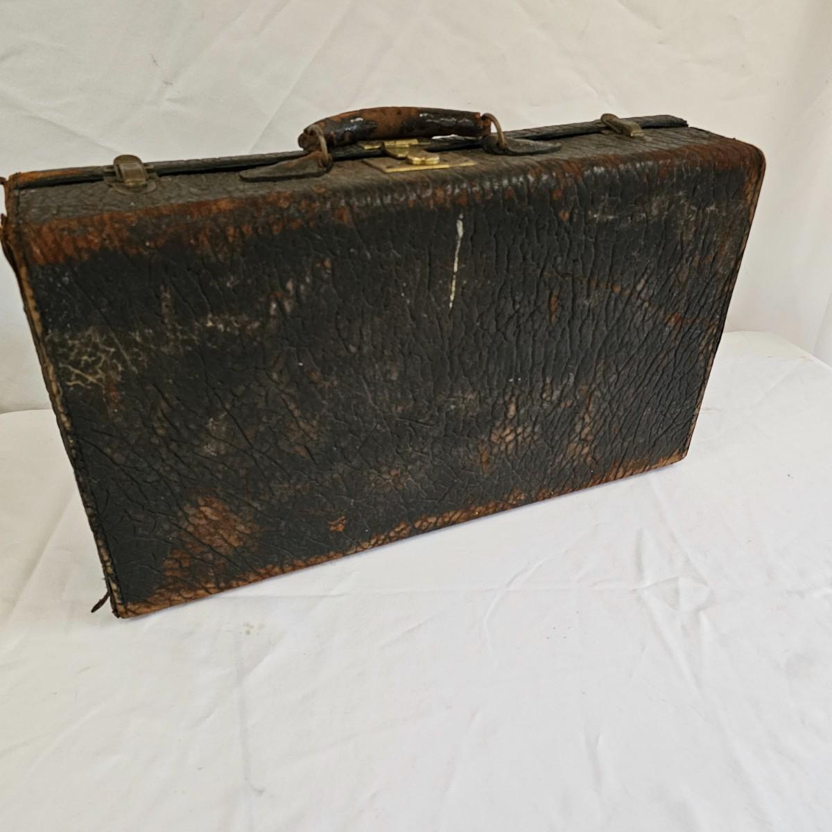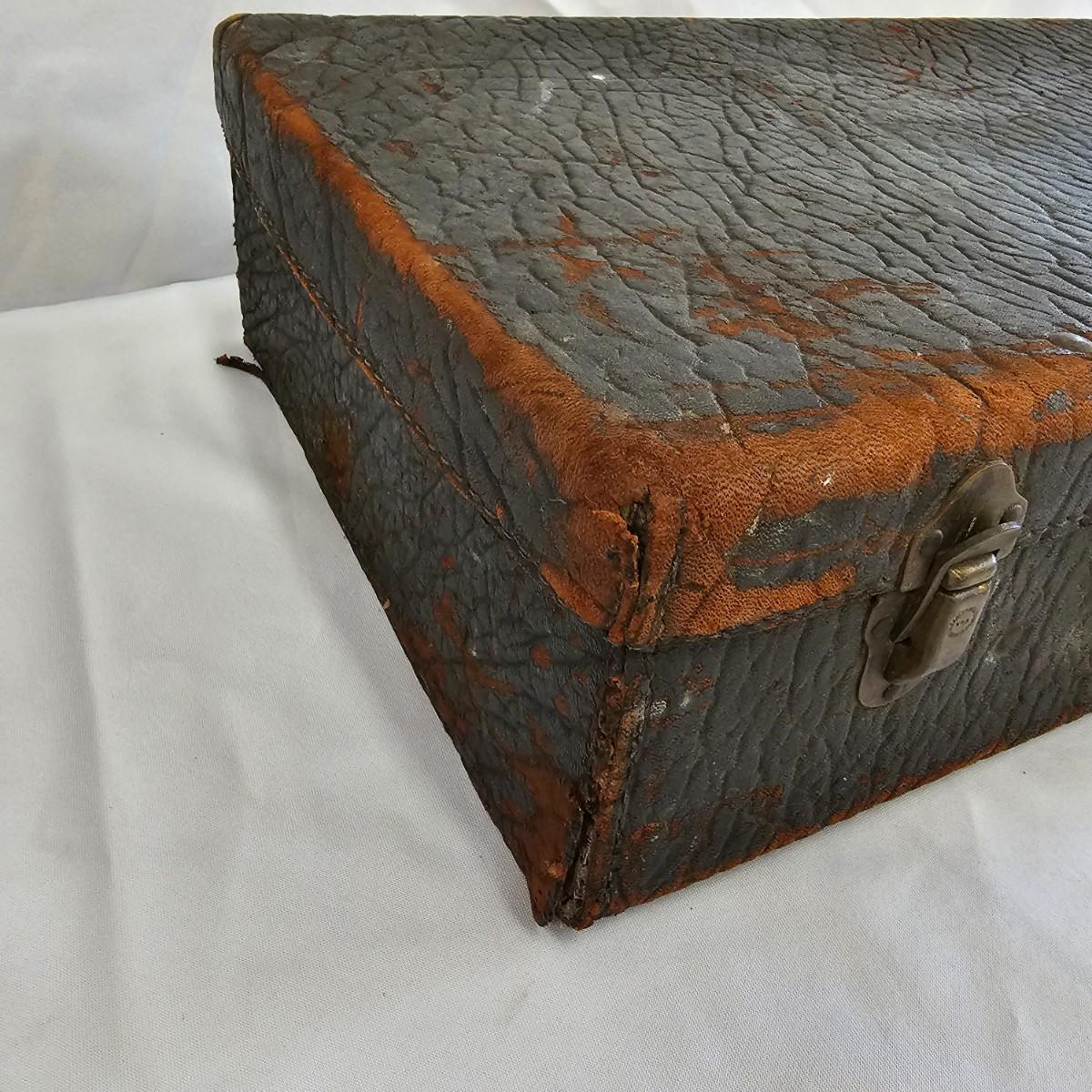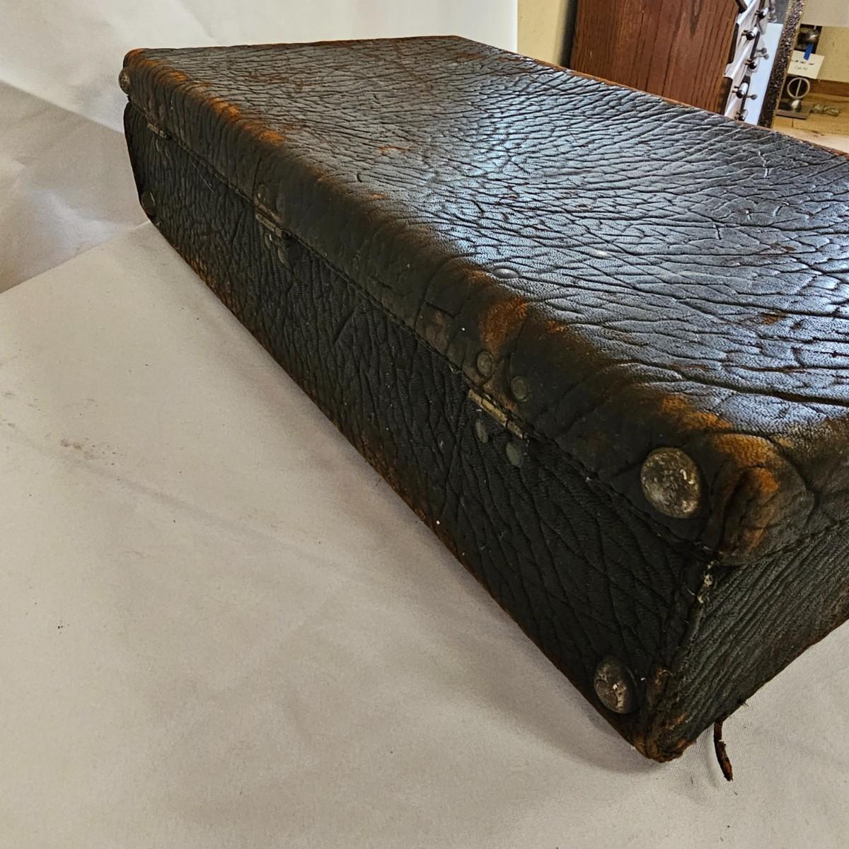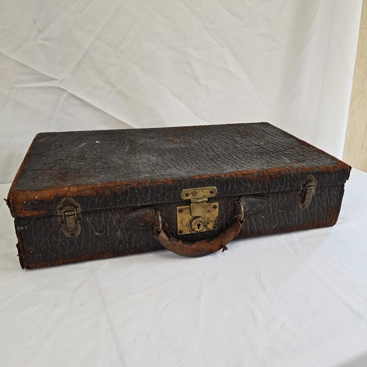 A pair of vintage leather suitcases/luggage. Well worn and patinaed, these pieces have all metal hardware and all latches function. No keys included. The handles on each piece are worn as are the edges of the cases. Small case measures 15" x 11" x 5"H, has initials C.M.H. Large case is 22" x 12.5" x 5"H. See photos for details. Shipping available.