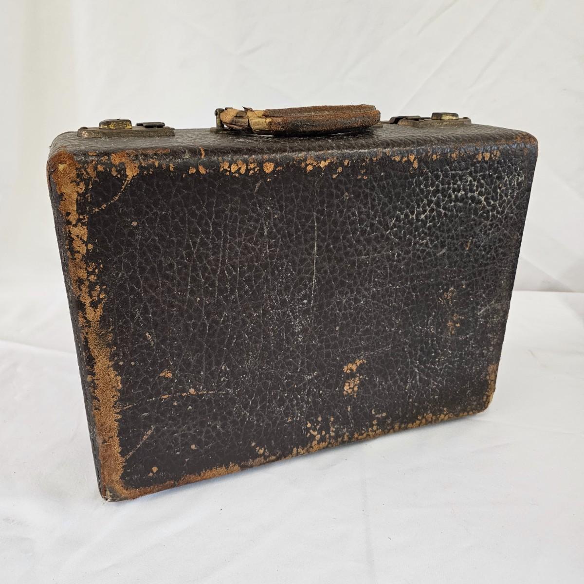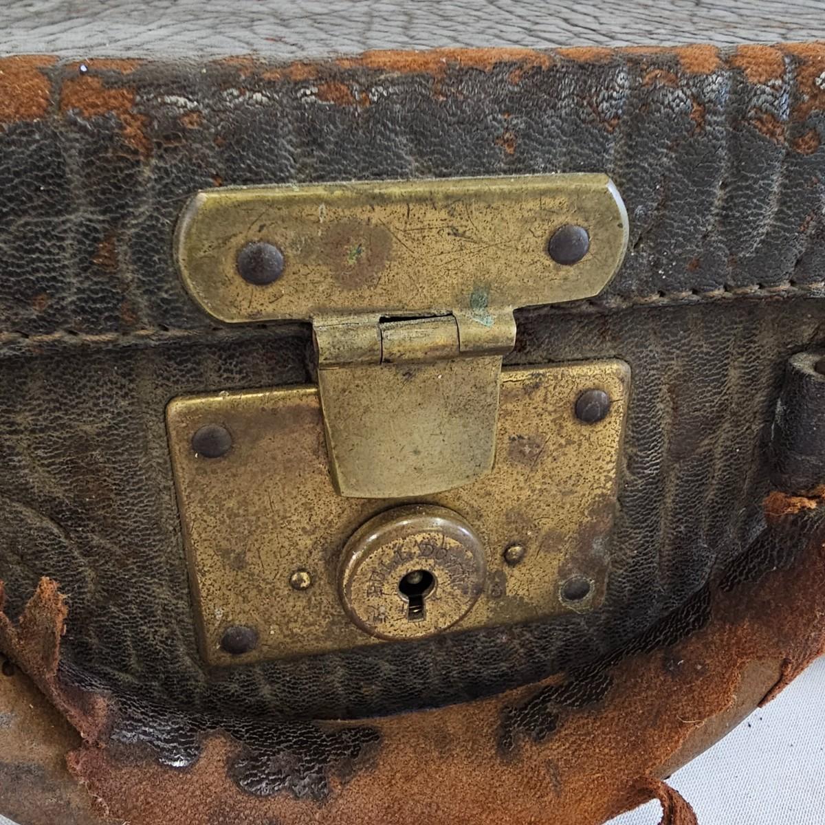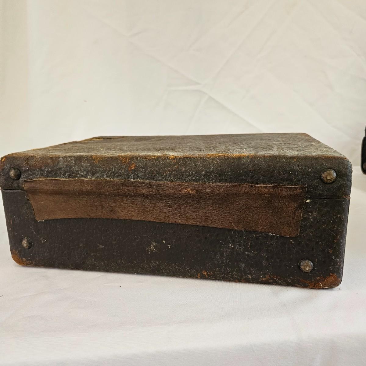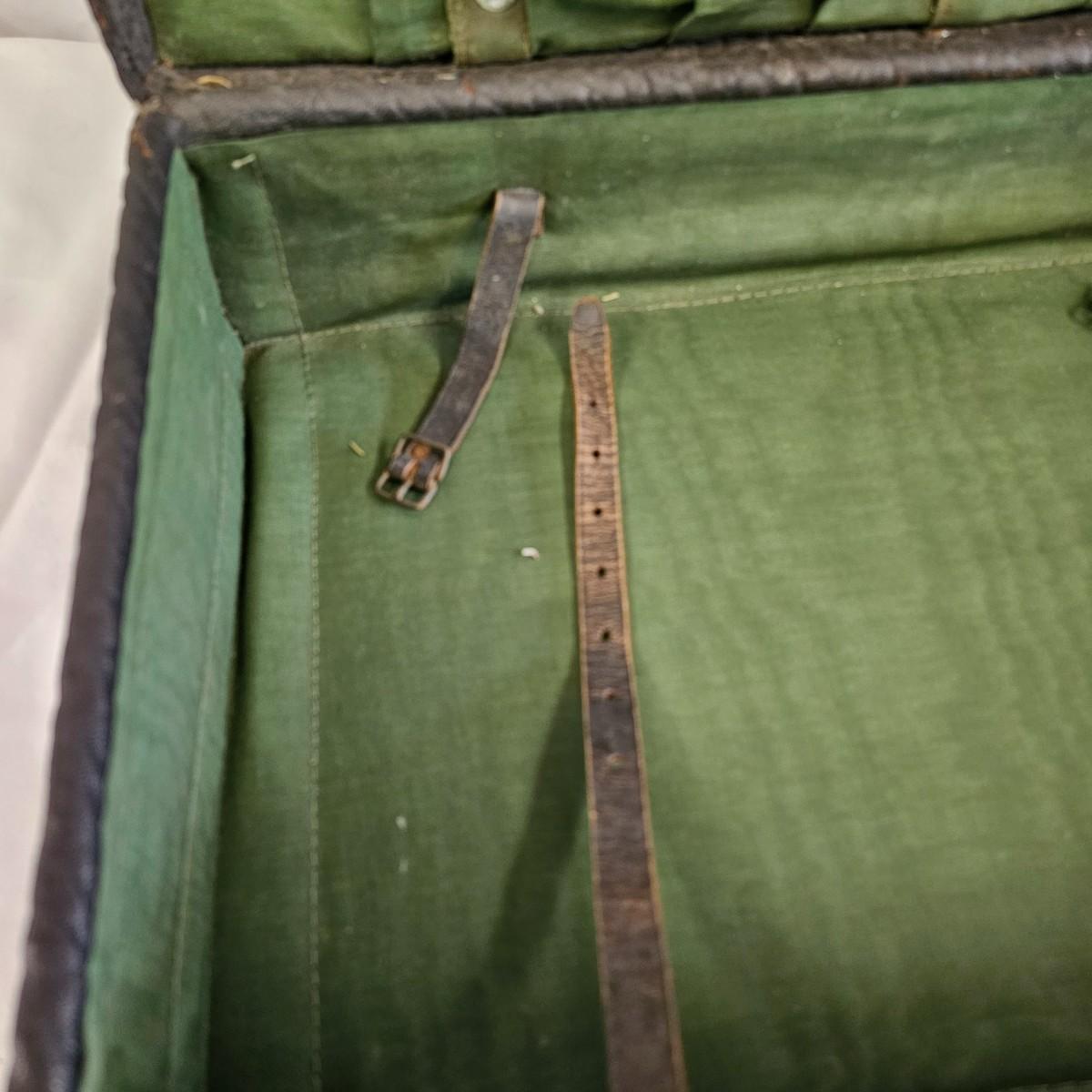A pair of vintage leather suitcases/luggage. Well worn and patinaed, these pieces have all metal hardware and all latches function. No keys included. The handles on each piece are worn as are the edges of the cases. Small case measures 15" x 11" x 5"H, has initials C.M.H. Large case is 22" x 12.5" x 5"H. See photos for details. Shipping available.