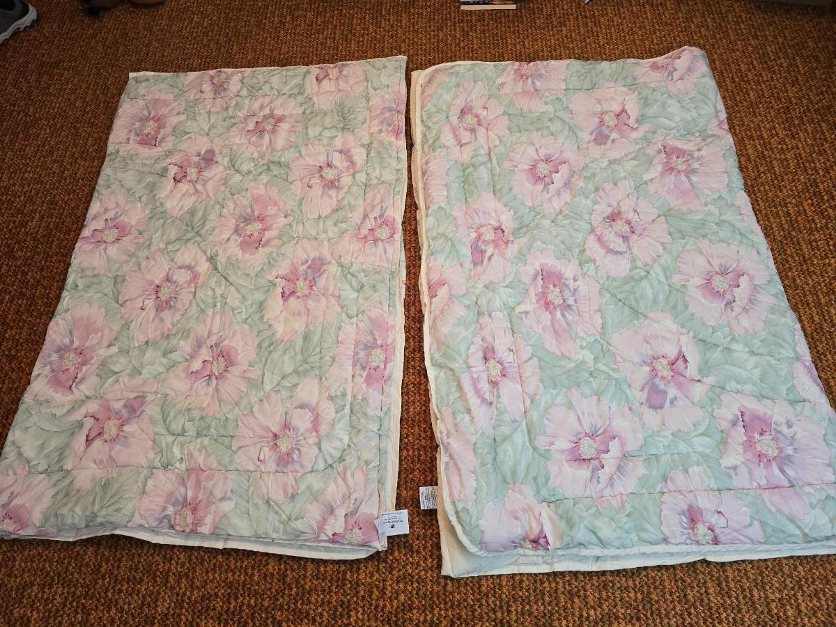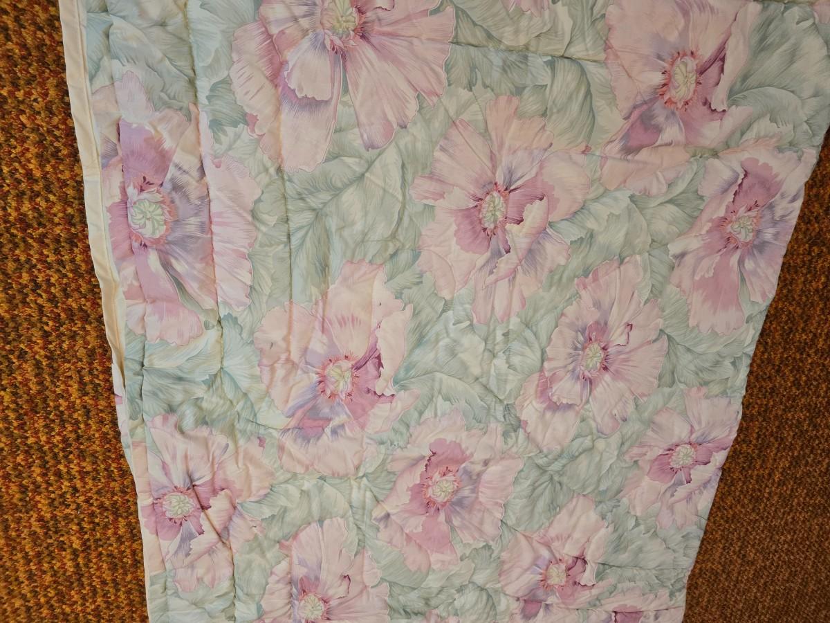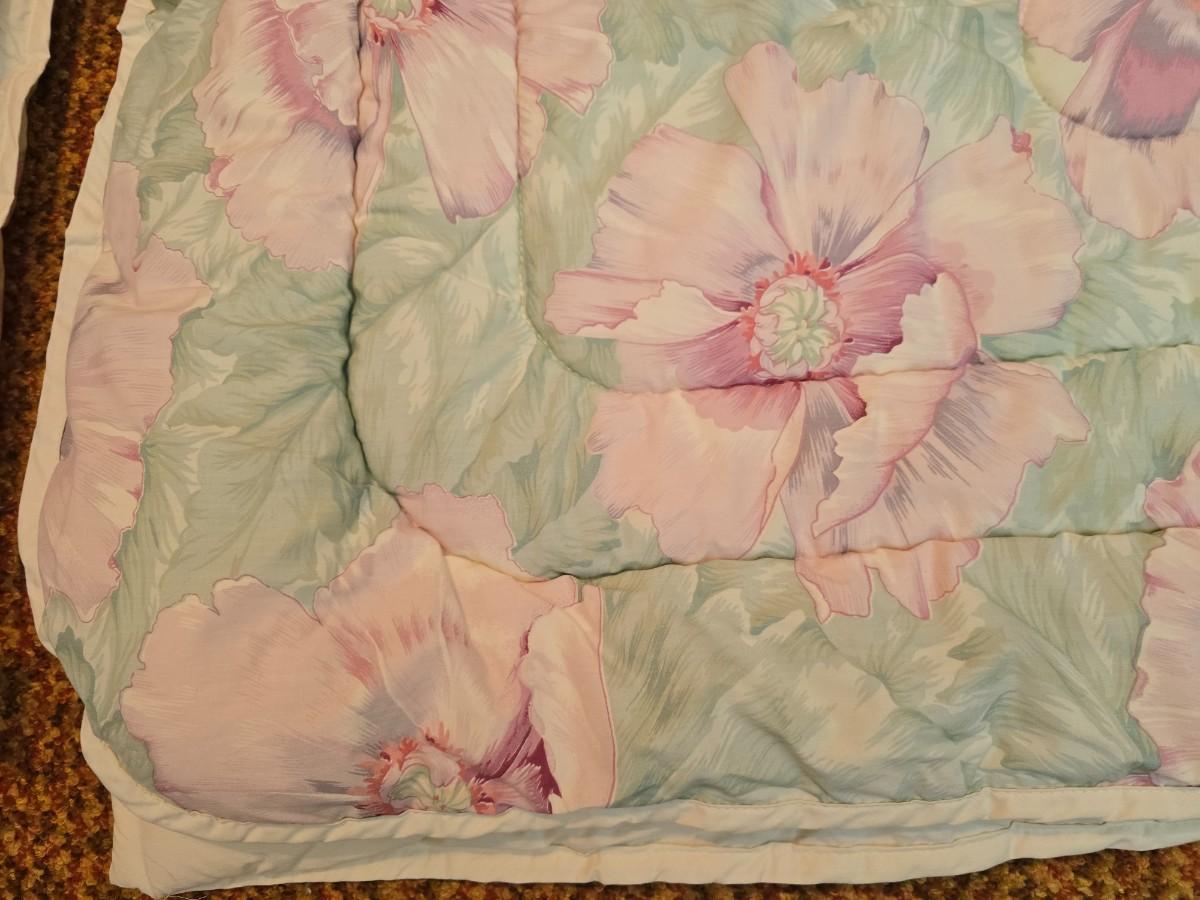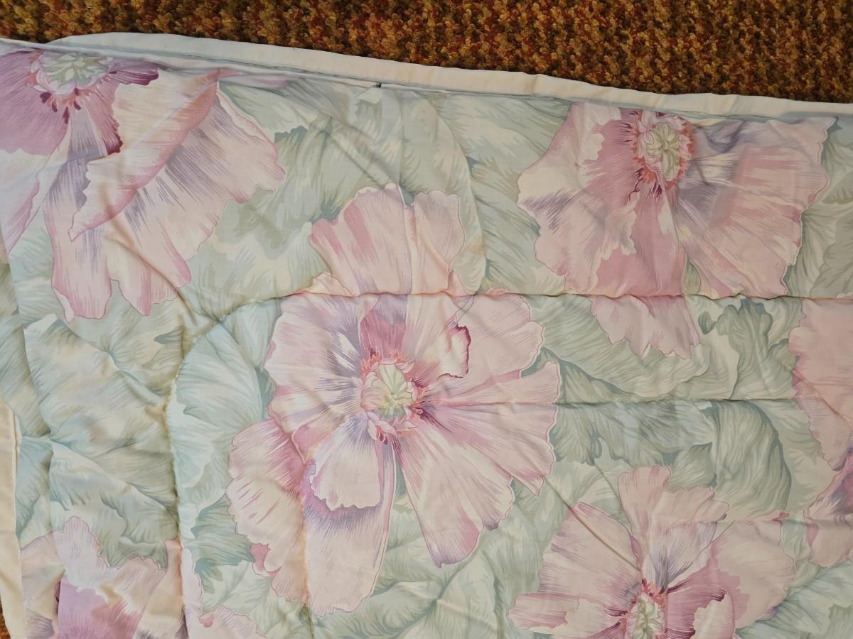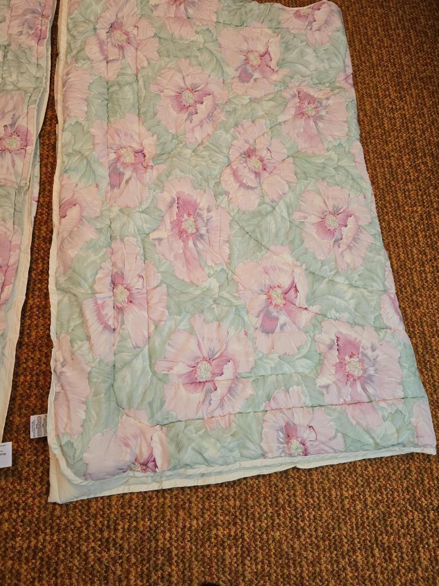 Pair of vintage Martex "Beau Rivage" full/queen comforter featuring a large-scale floral print with pink and green poppies.