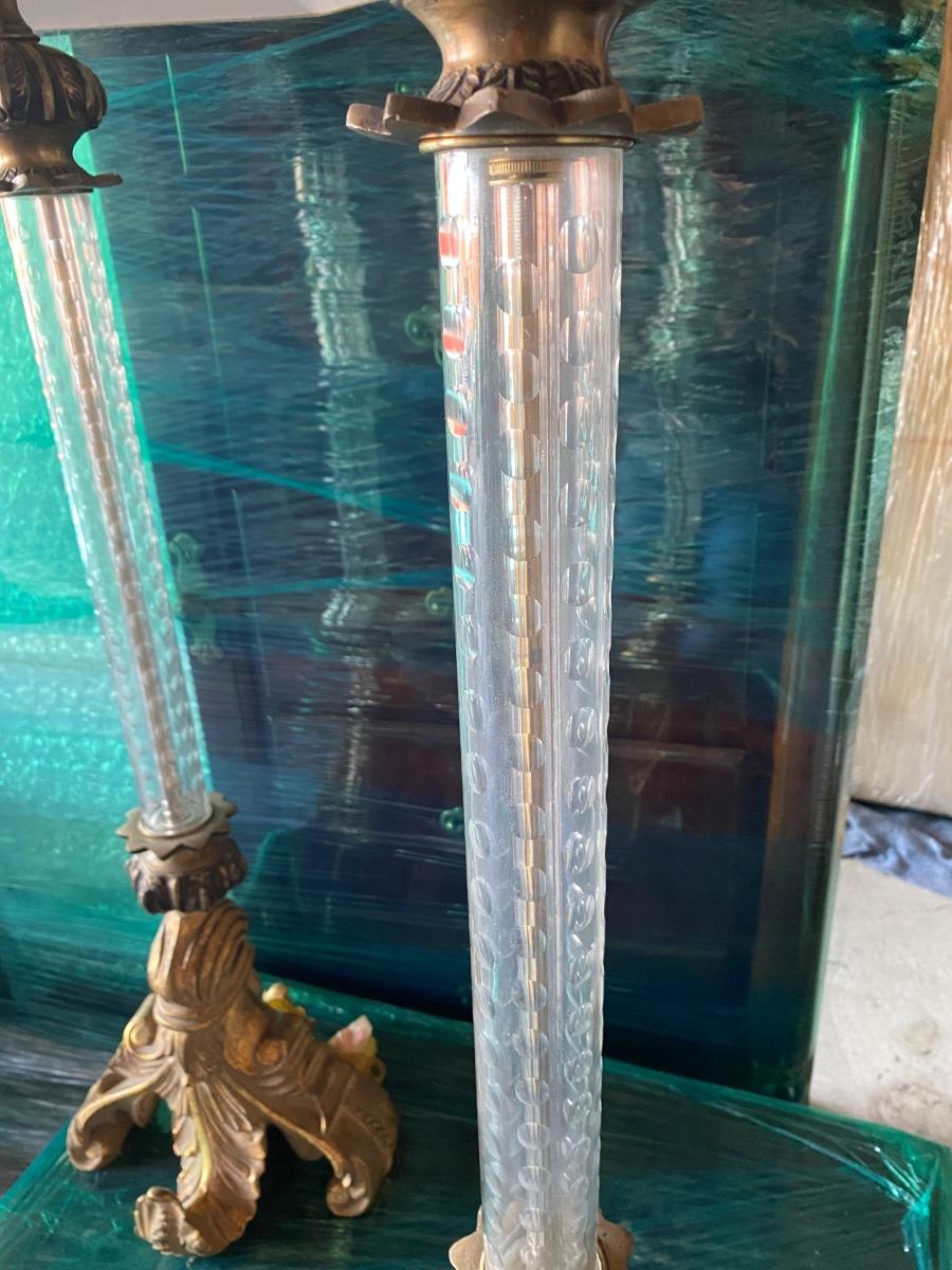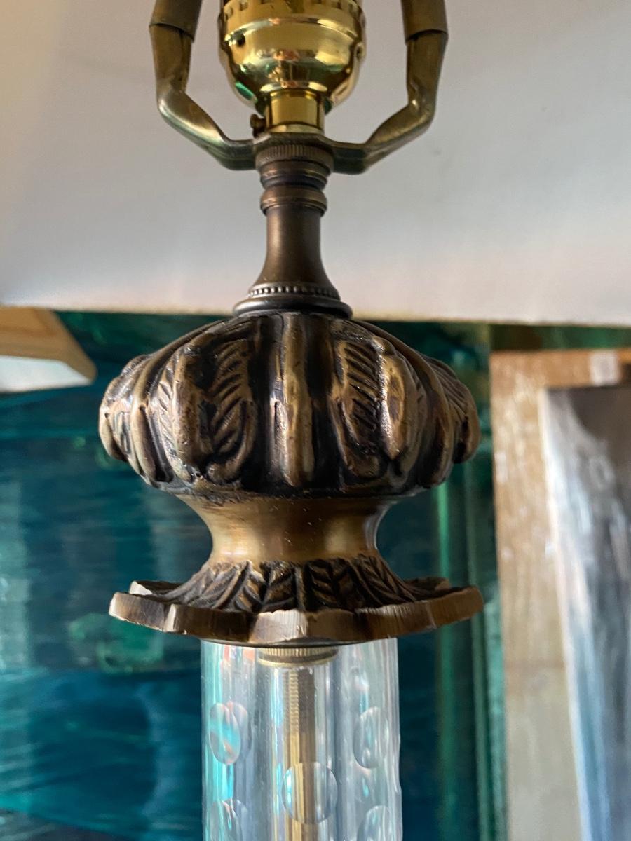 Pair of Vintage MCM Hollywood Regency Gold & Crystal Table Lamps. In good condition. Gold leaf base with cut crystal center. About 42" tall.