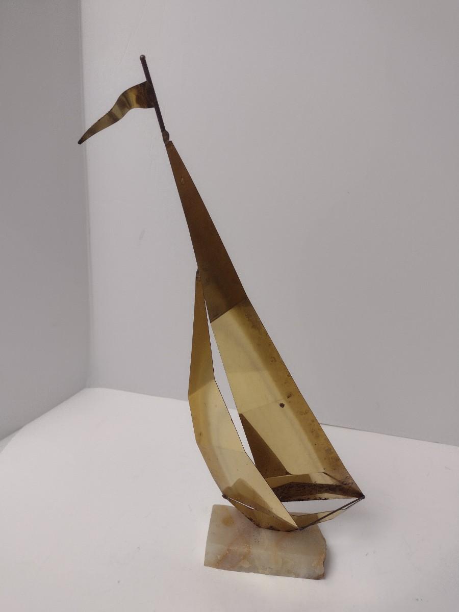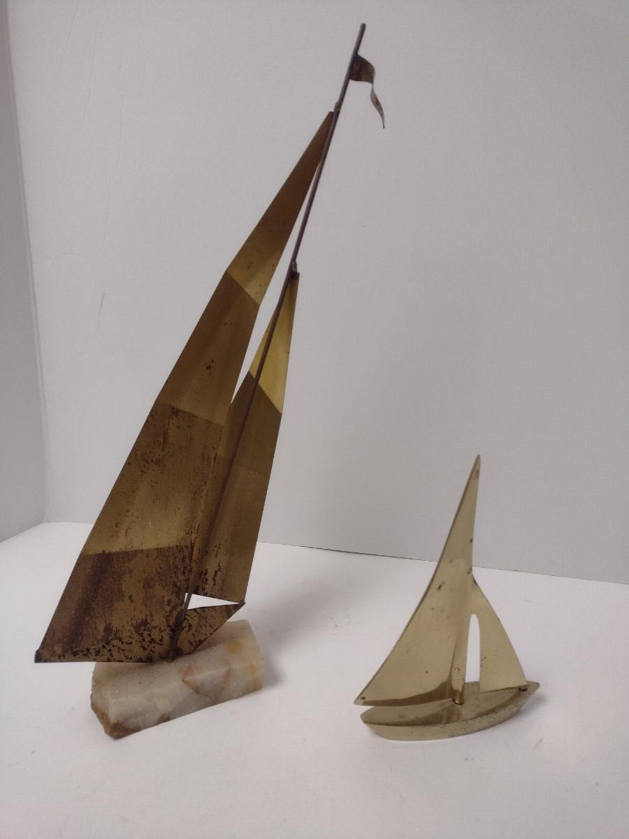 Pair of Vintage Metal Brass Sailboat Yachts Large One Signed by Artist