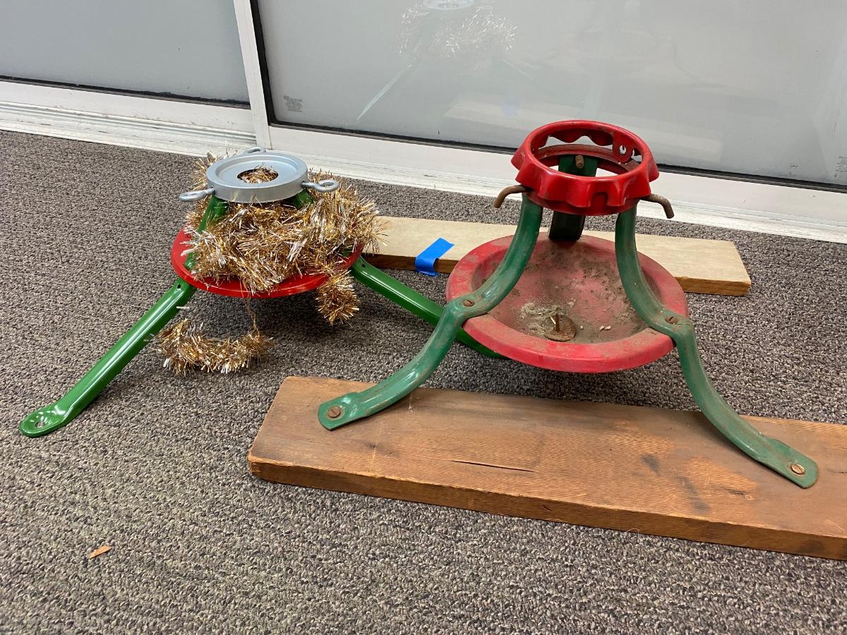 Pair of Vintage Metal Christmas Holiday Tree Stands. One is stuck to a couple wood boards for more stability. In vintage conditions.