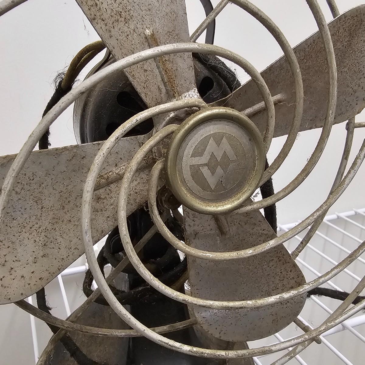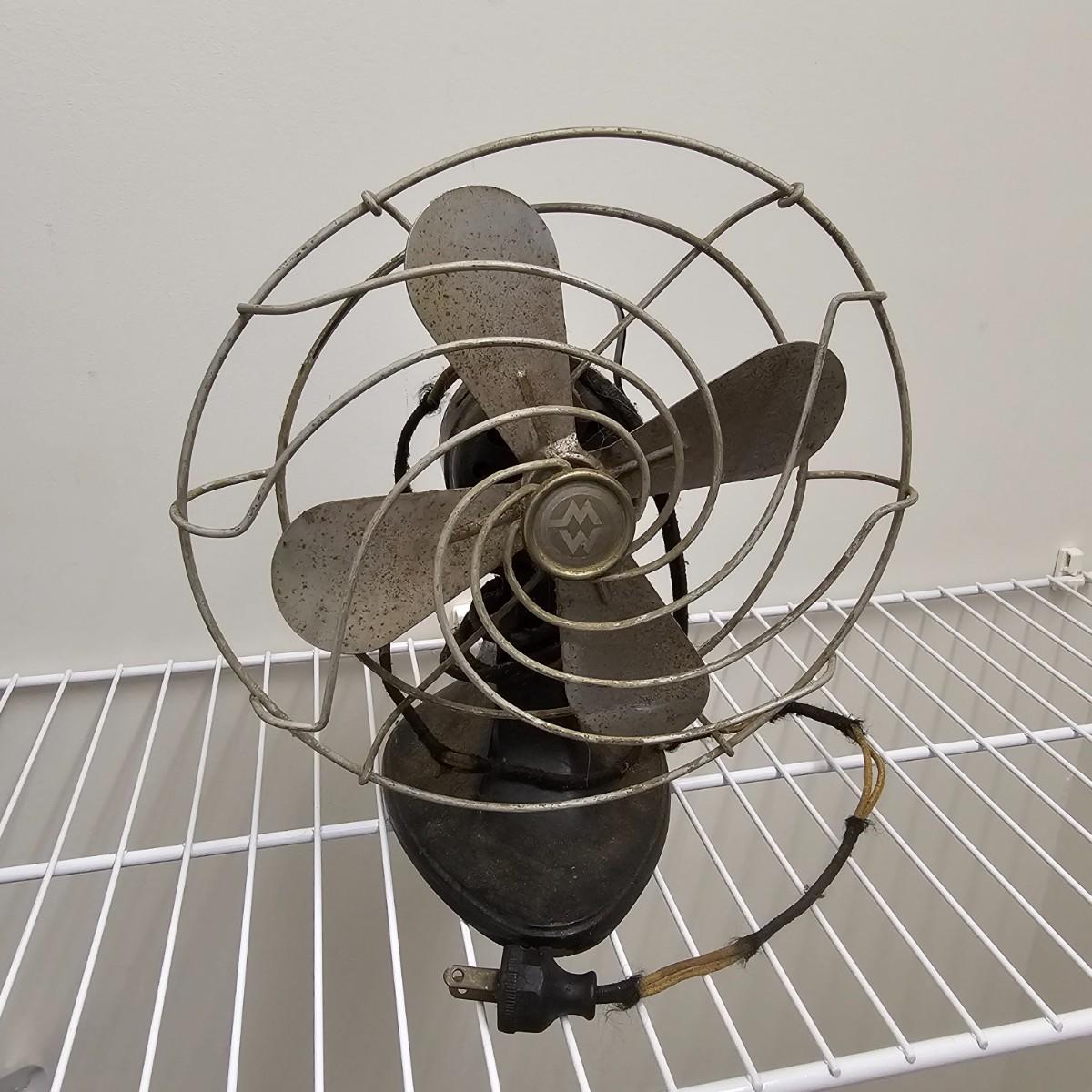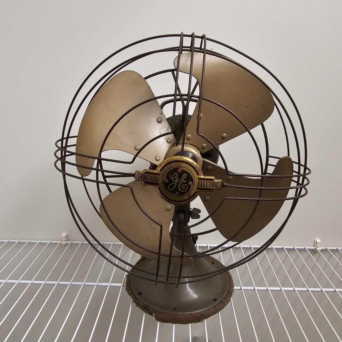 Two older style tabletop fans with all metal construction, wire cages and more. Smaller unit is from Montgomery Ward, measures 10" x 7" x 10.5"H. Cord is old cloth covered style, but fan did power on when plugged in. Some rust and discoloration on base and blades. Larger piece is a General Electric Vortalux model with gray/gold coloring. Has variable speed on switch and also an oscillating mechanism. Unable to test as there is no plug cord. Measures 10" x 7" x 10.5"H. Usual dirt and dust for these items. See photos for details. Shipping available. Shipping can be costly. We suggest contacting our preferred local shipping provider, Postage Express, with dimensions and getting an estimate before bidding: (828) 255-9250 or email shipping@postageexpressnc.com