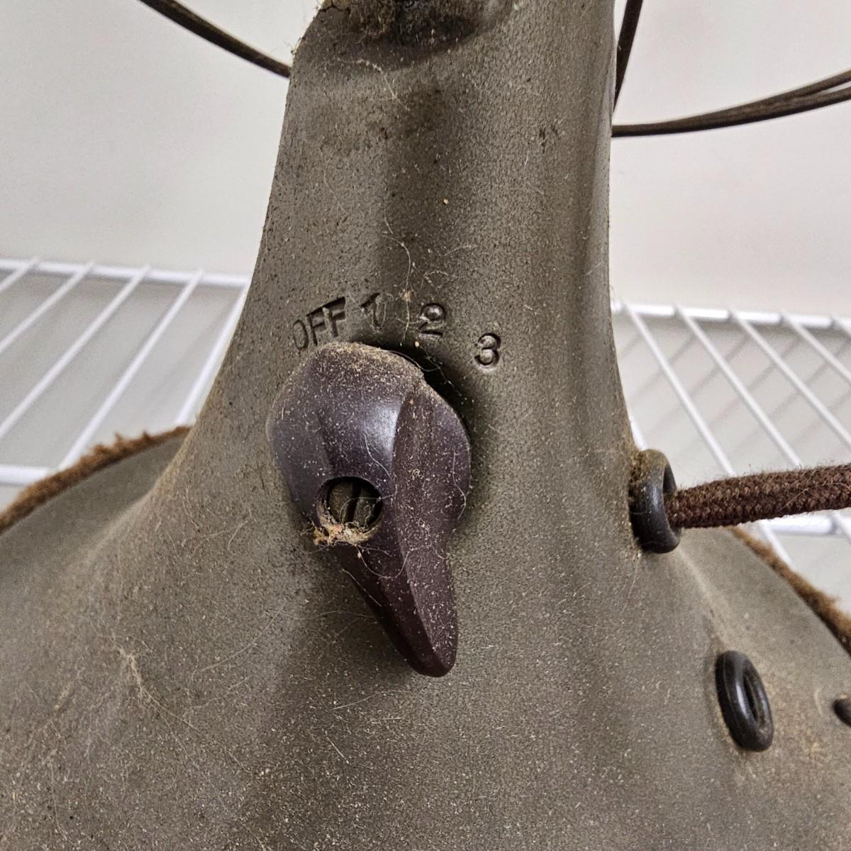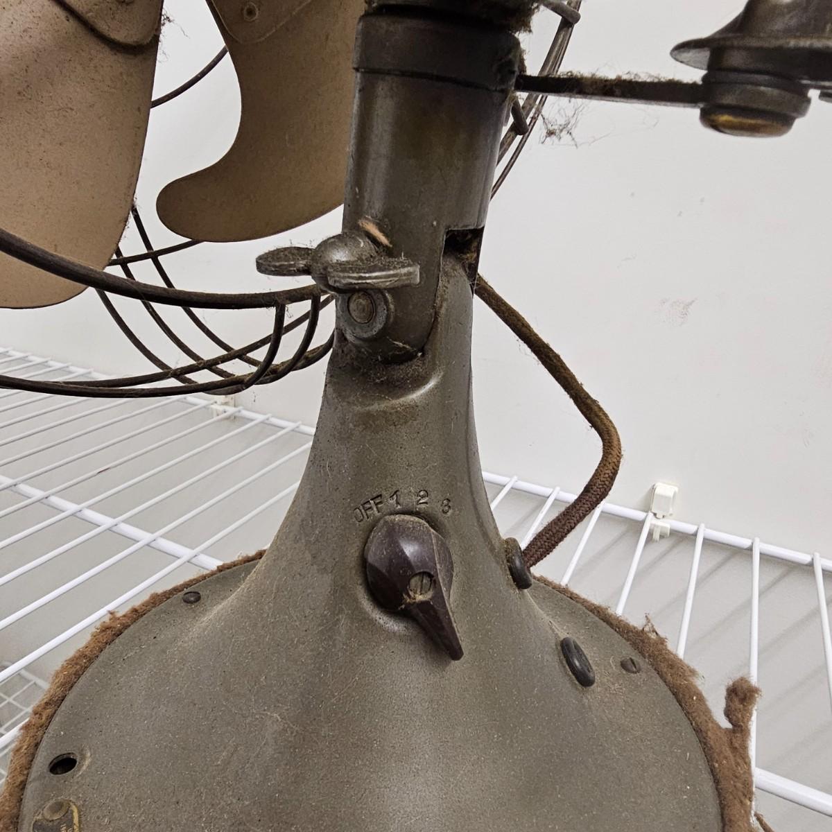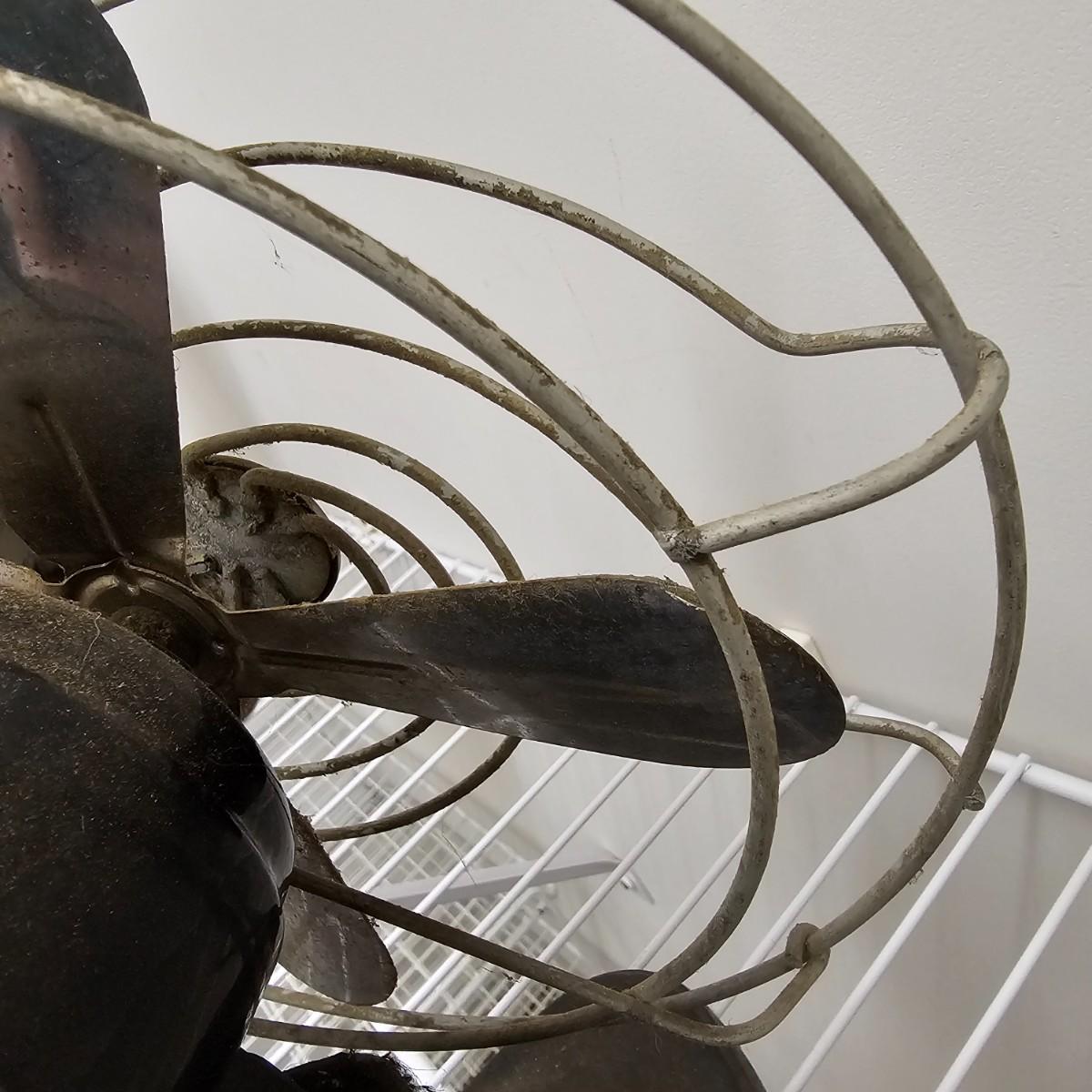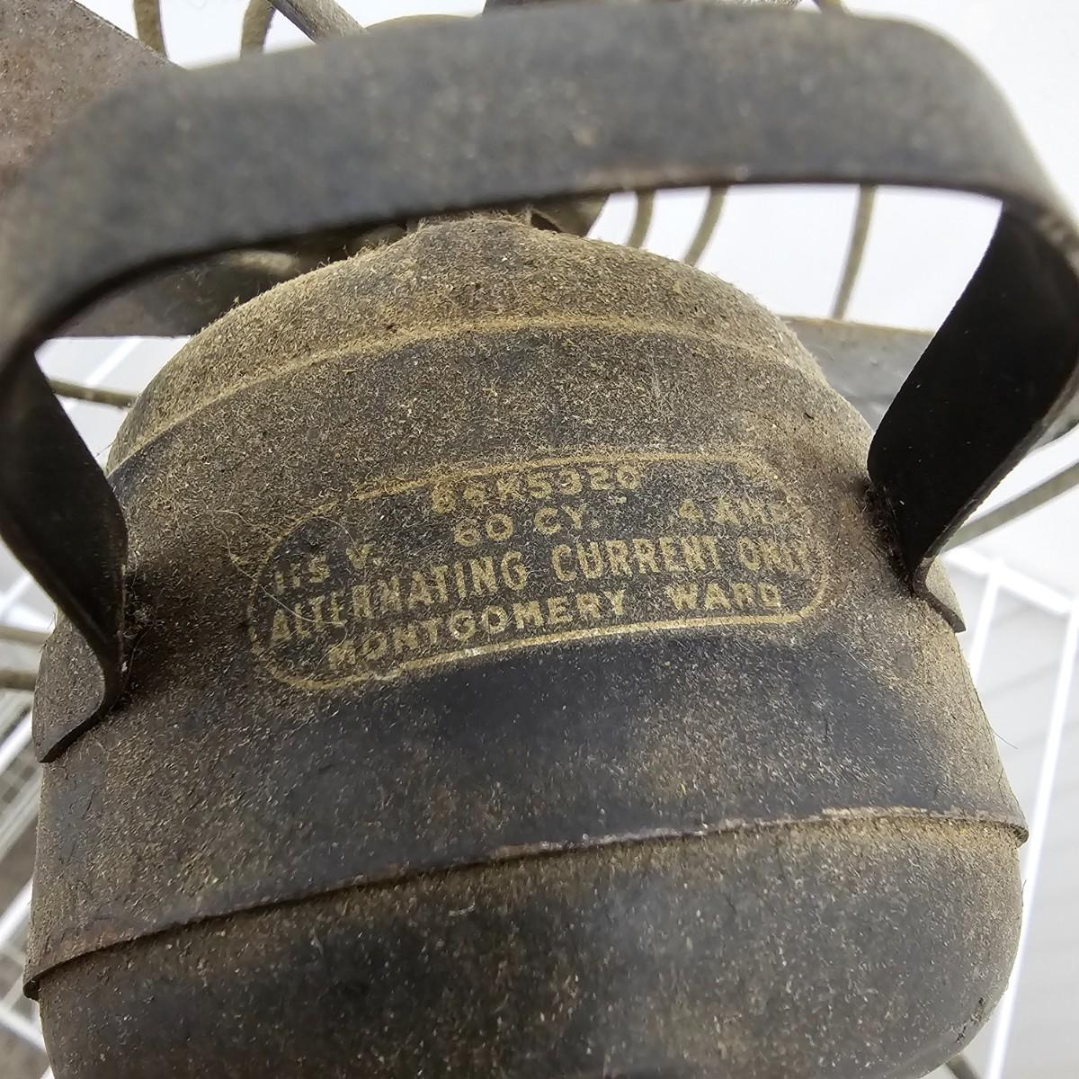 Two older style tabletop fans with all metal construction, wire cages and more. Smaller unit is from Montgomery Ward, measures 10" x 7" x 10.5"H. Cord is old cloth covered style, but fan did power on when plugged in. Some rust and discoloration on base and blades. Larger piece is a General Electric Vortalux model with gray/gold coloring. Has variable speed on switch and also an oscillating mechanism. Unable to test as there is no plug cord. Measures 10" x 7" x 10.5"H. Usual dirt and dust for these items. See photos for details. Shipping available. Shipping can be costly. We suggest contacting our preferred local shipping provider, Postage Express, with dimensions and getting an estimate before bidding: (828) 255-9250 or email shipping@postageexpressnc.com