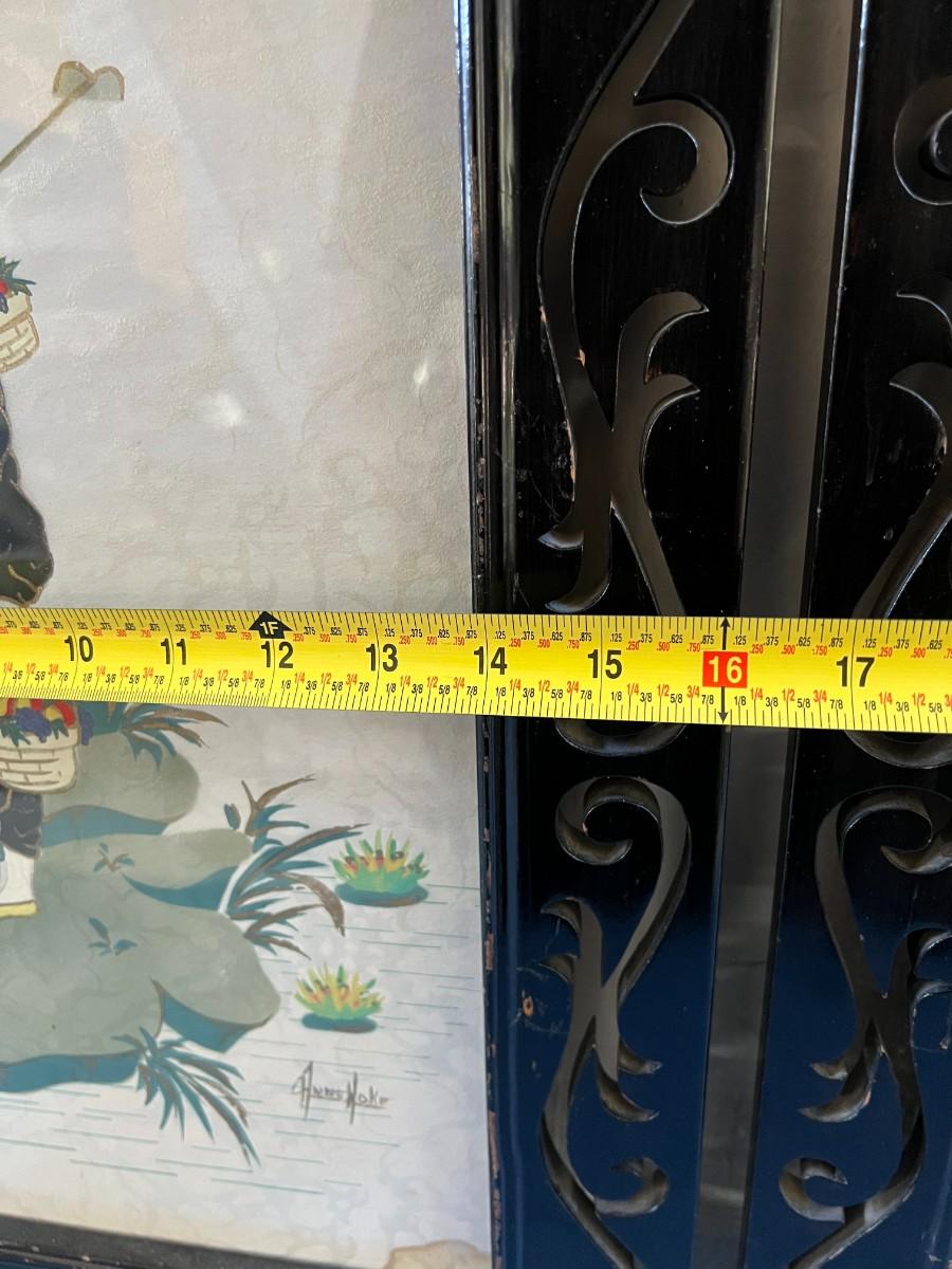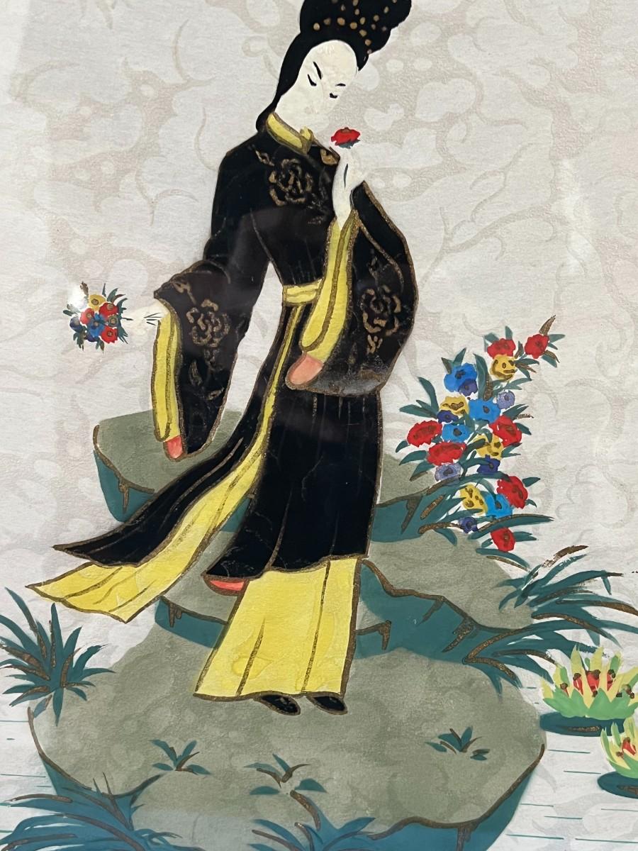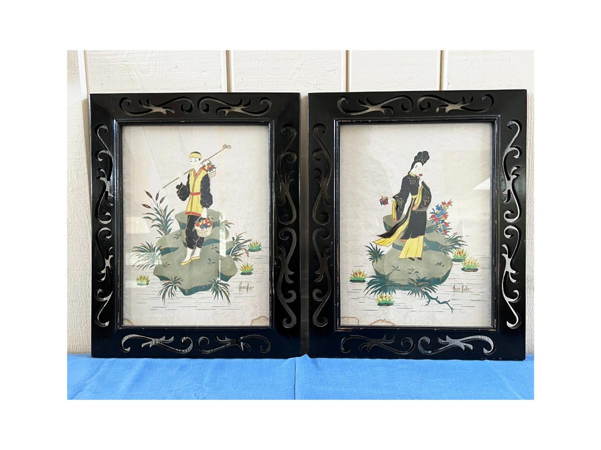 Pair of Vintage Mid Century Anne Hoke Asian Theme Lithograph Prints. Colorful prints in nice ornate frames.