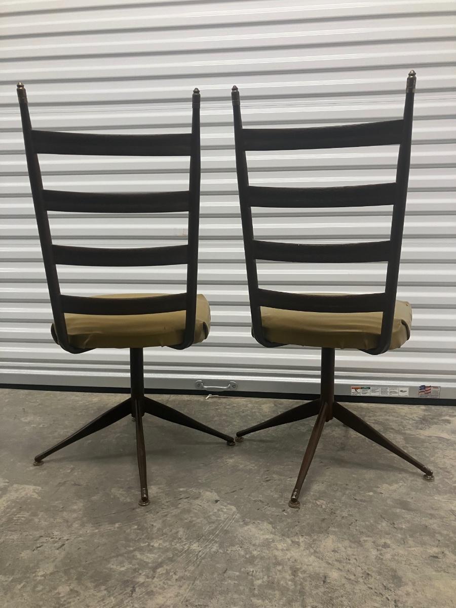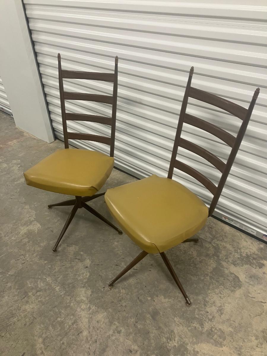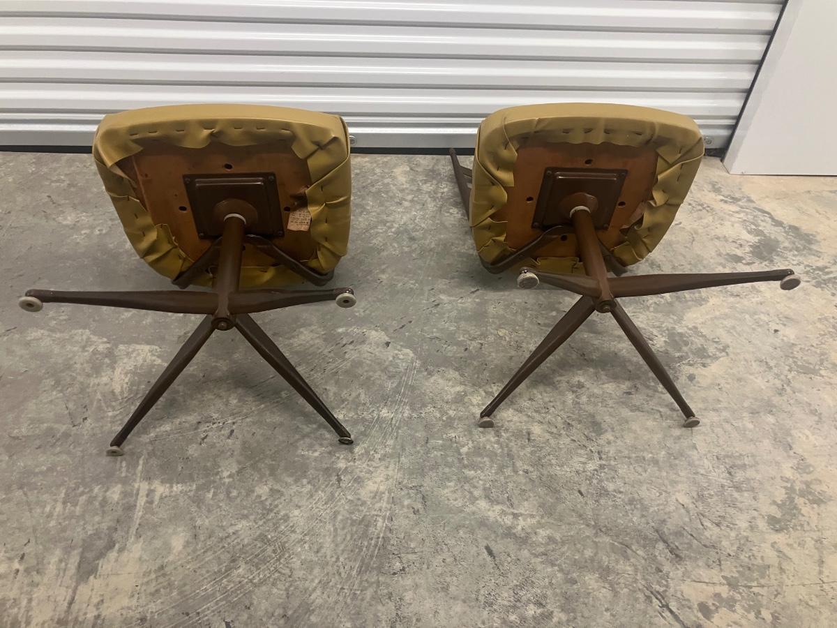 A stunning pair of authentic 1950s-1960s Viko by Baumritter swivel bucket chairs – classic mid-century modern design with iconic four-star metal bases, ladder-style wooden backs, and original mustard yellow vinyl upholstery in great vintage condition (no major tears, just light age-appropriate wear that adds to the retro charm).