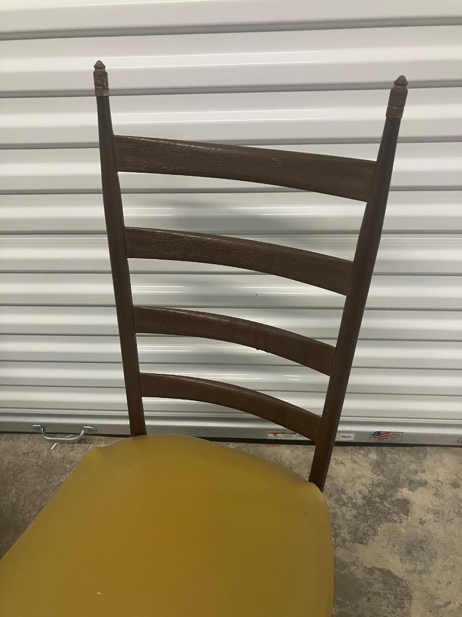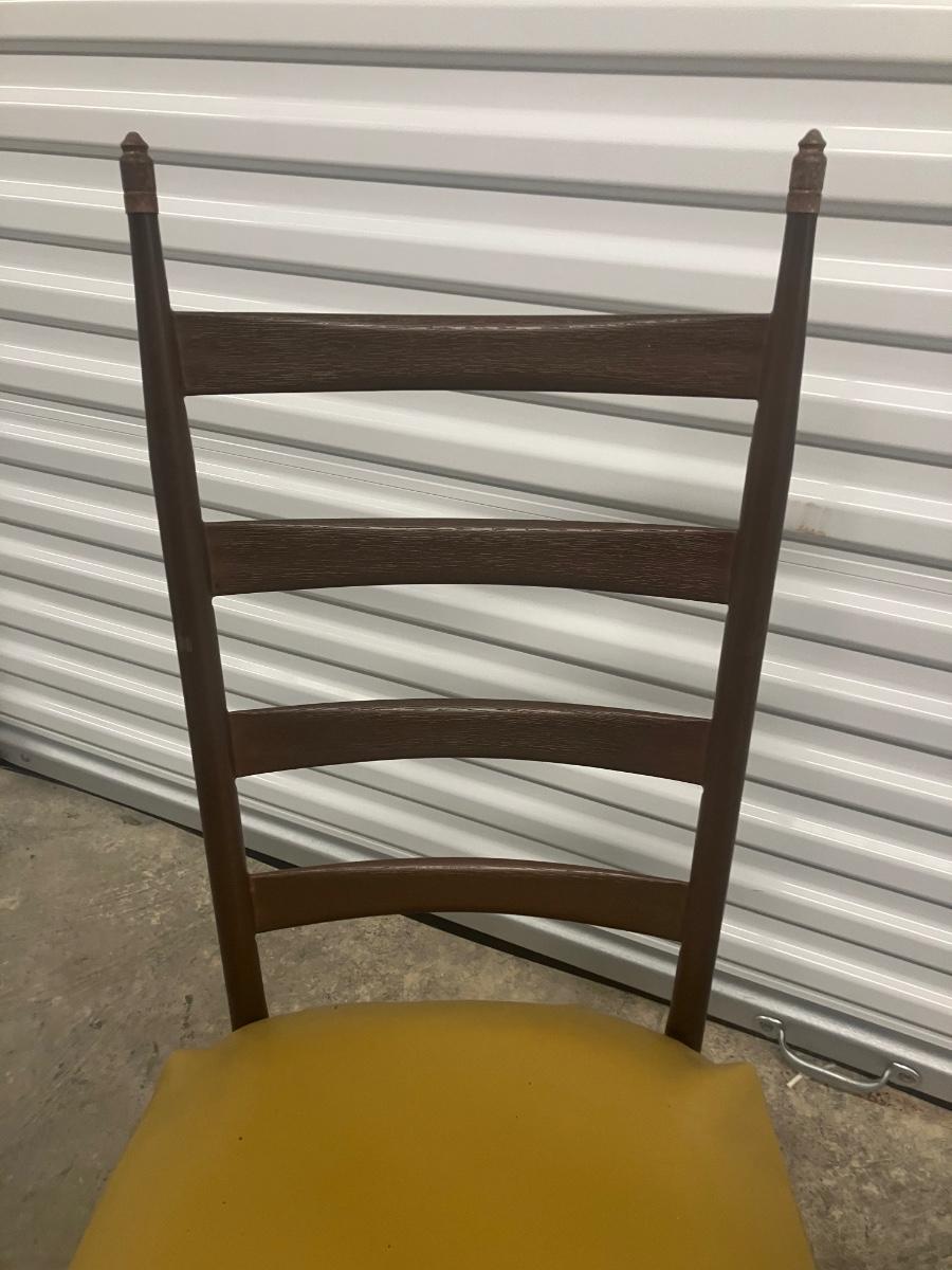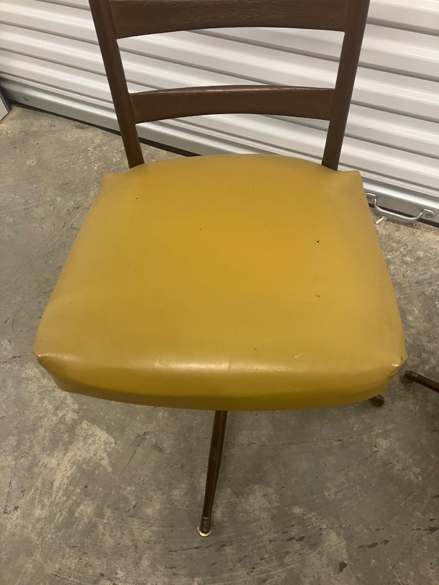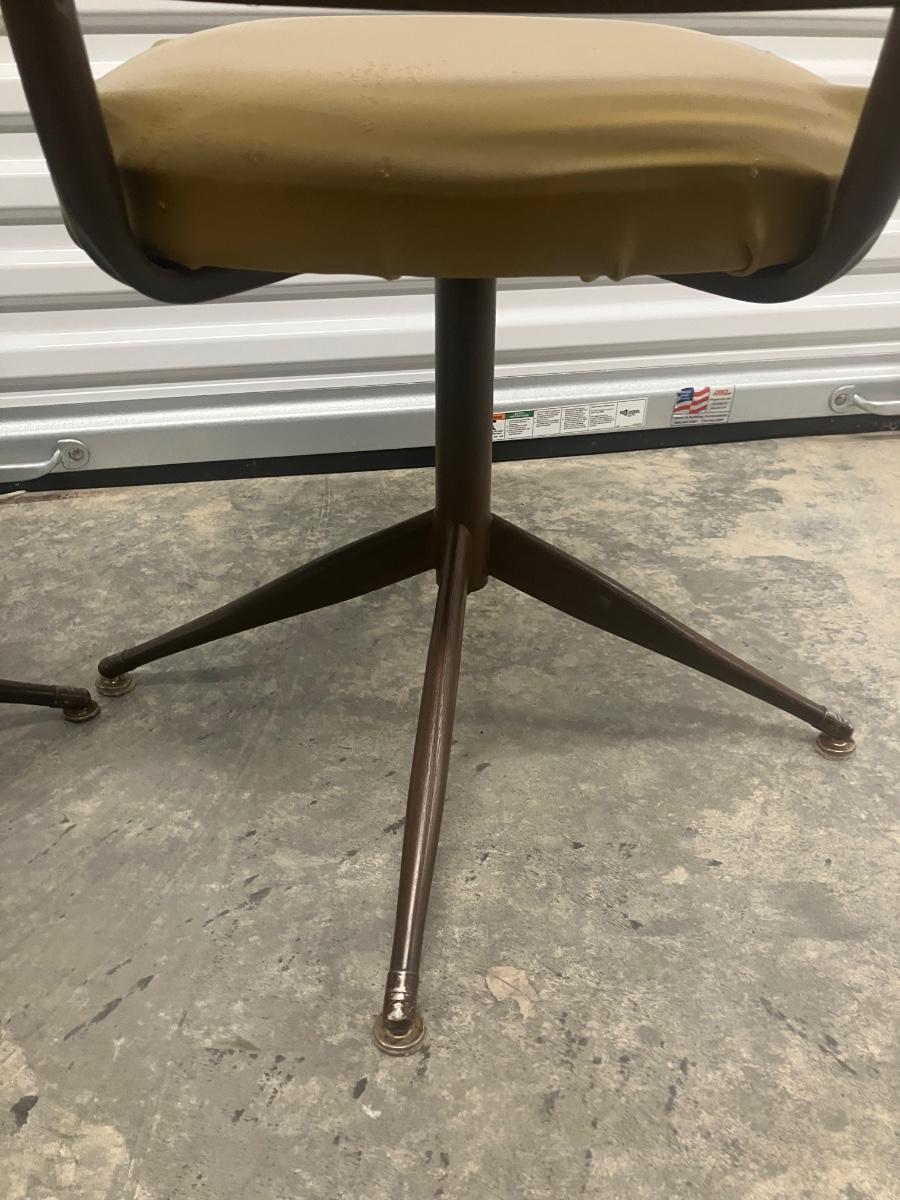 A stunning pair of authentic 1950s-1960s Viko by Baumritter swivel bucket chairs – classic mid-century modern design with iconic four-star metal bases, ladder-style wooden backs, and original mustard yellow vinyl upholstery in great vintage condition (no major tears, just light age-appropriate wear that adds to the retro charm).