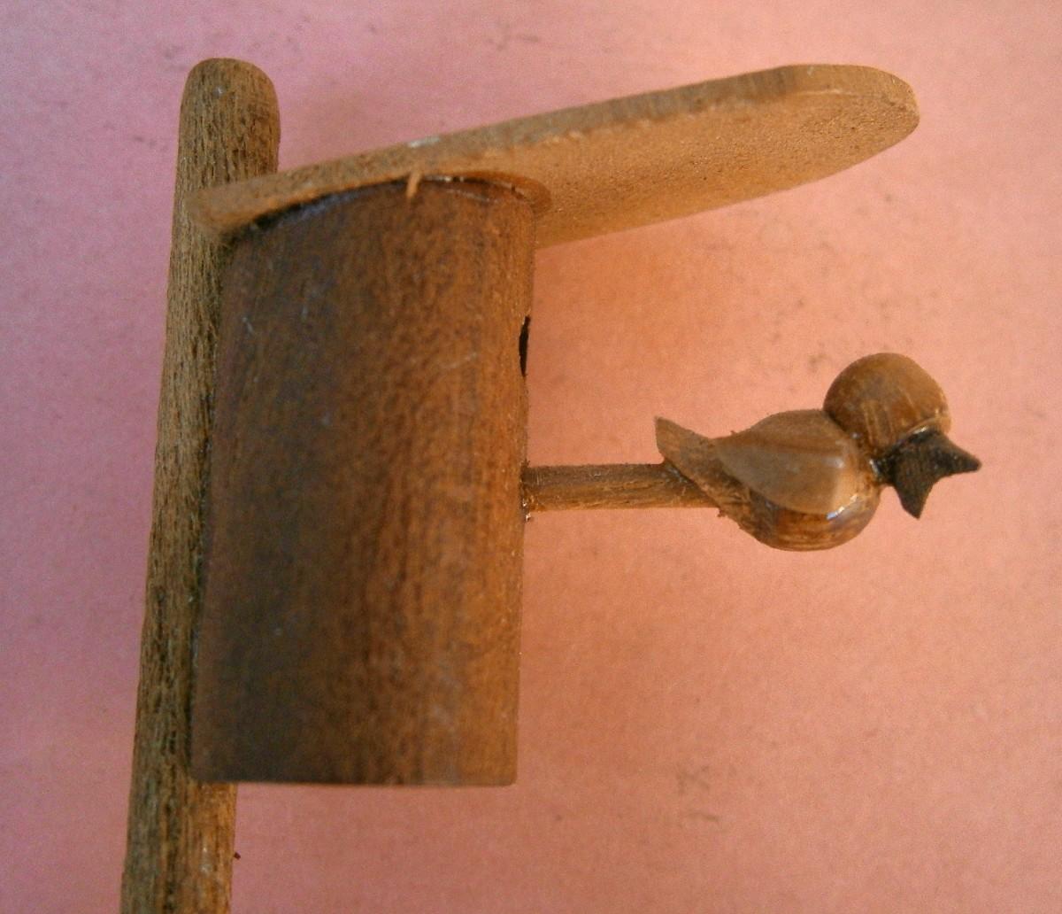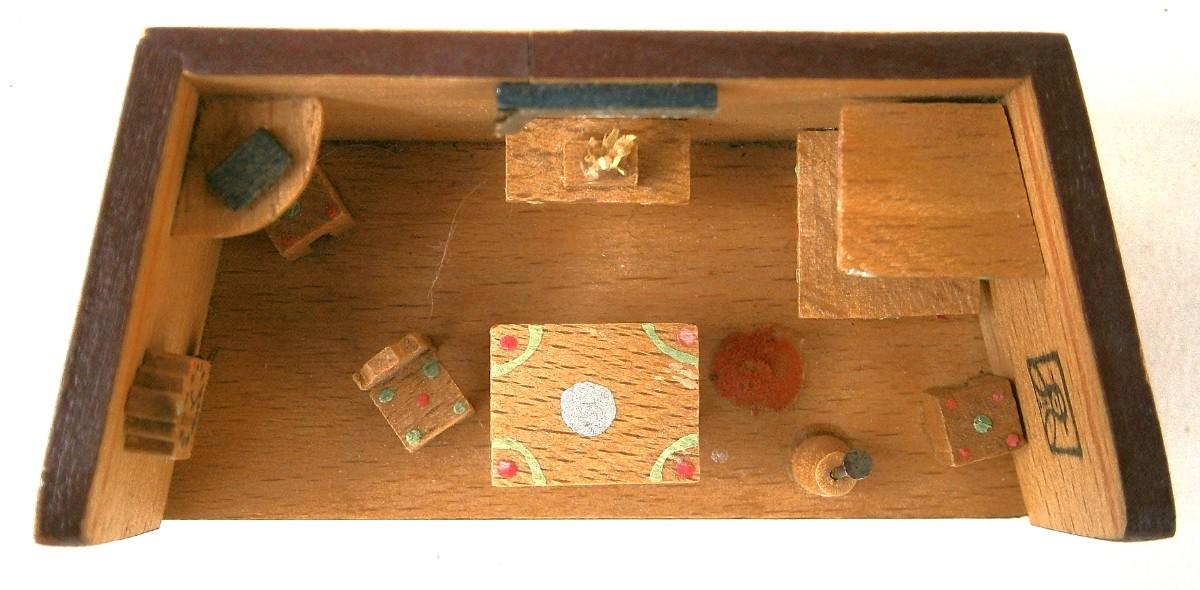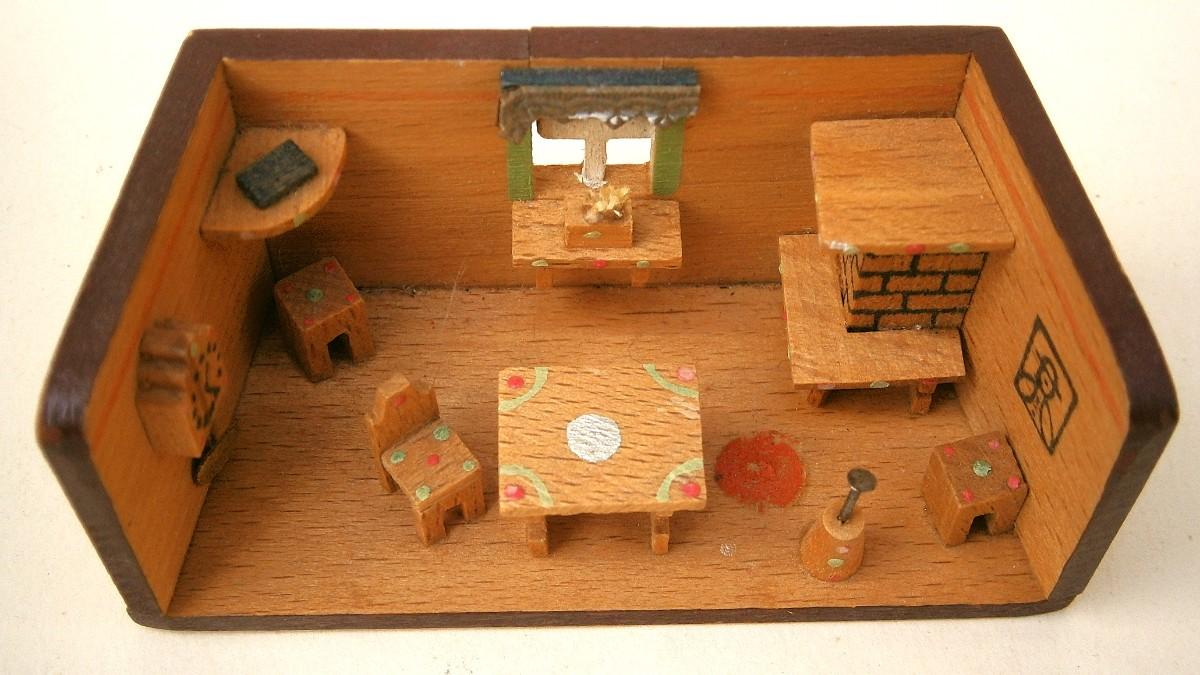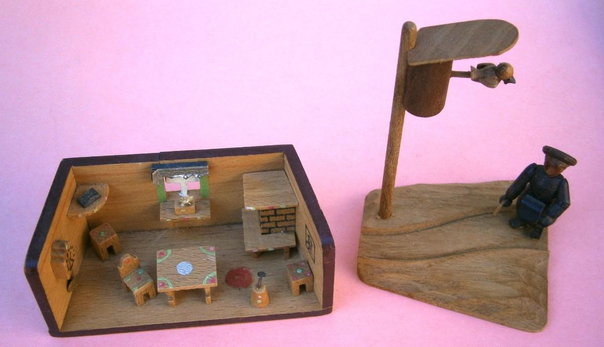 Pair of Vintage Miniature Dioramas, handmade wood carvings, kitchen is 3 in. wide x 1 3/8 in tall, Girl with Bird is 3 in. tall