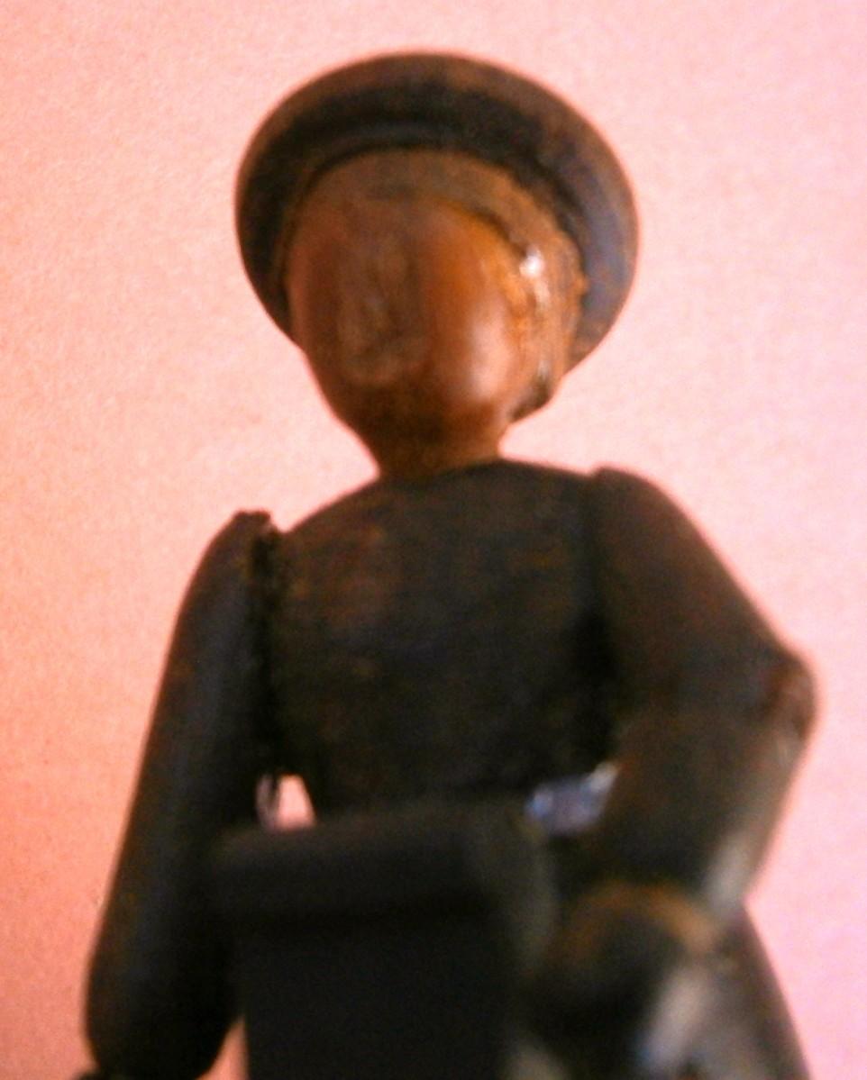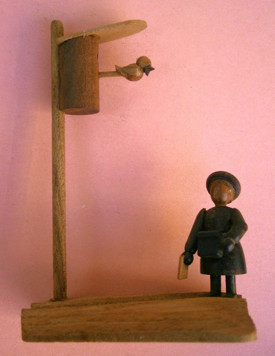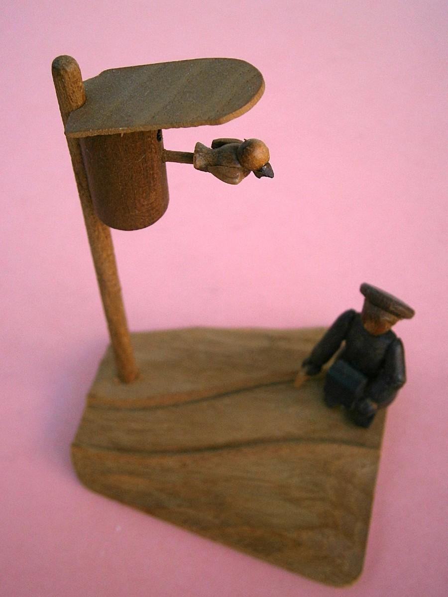 Pair of Vintage Miniature Dioramas, handmade wood carvings, kitchen is 3 in. wide x 1 3/8 in tall, Girl with Bird is 3 in. tall