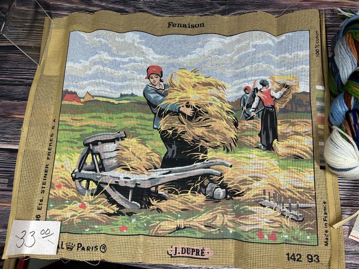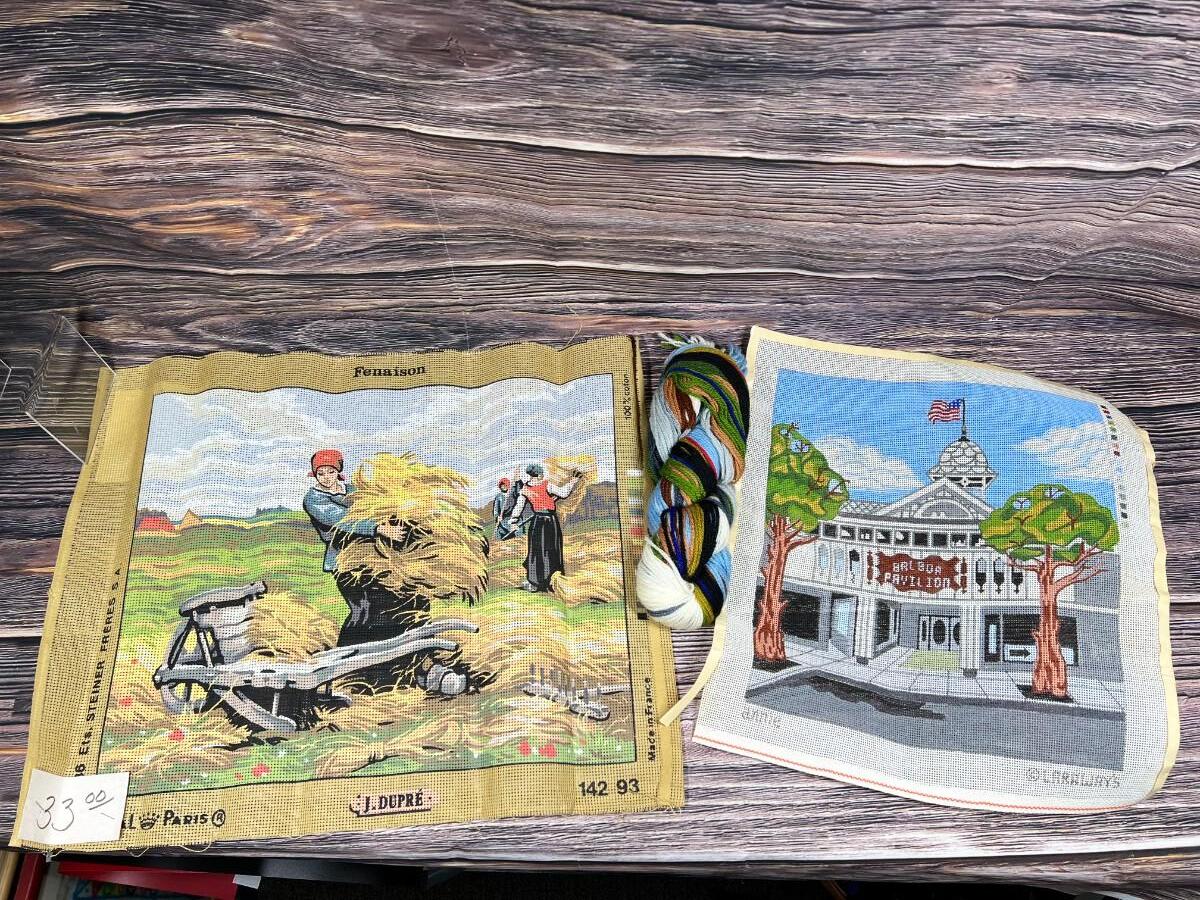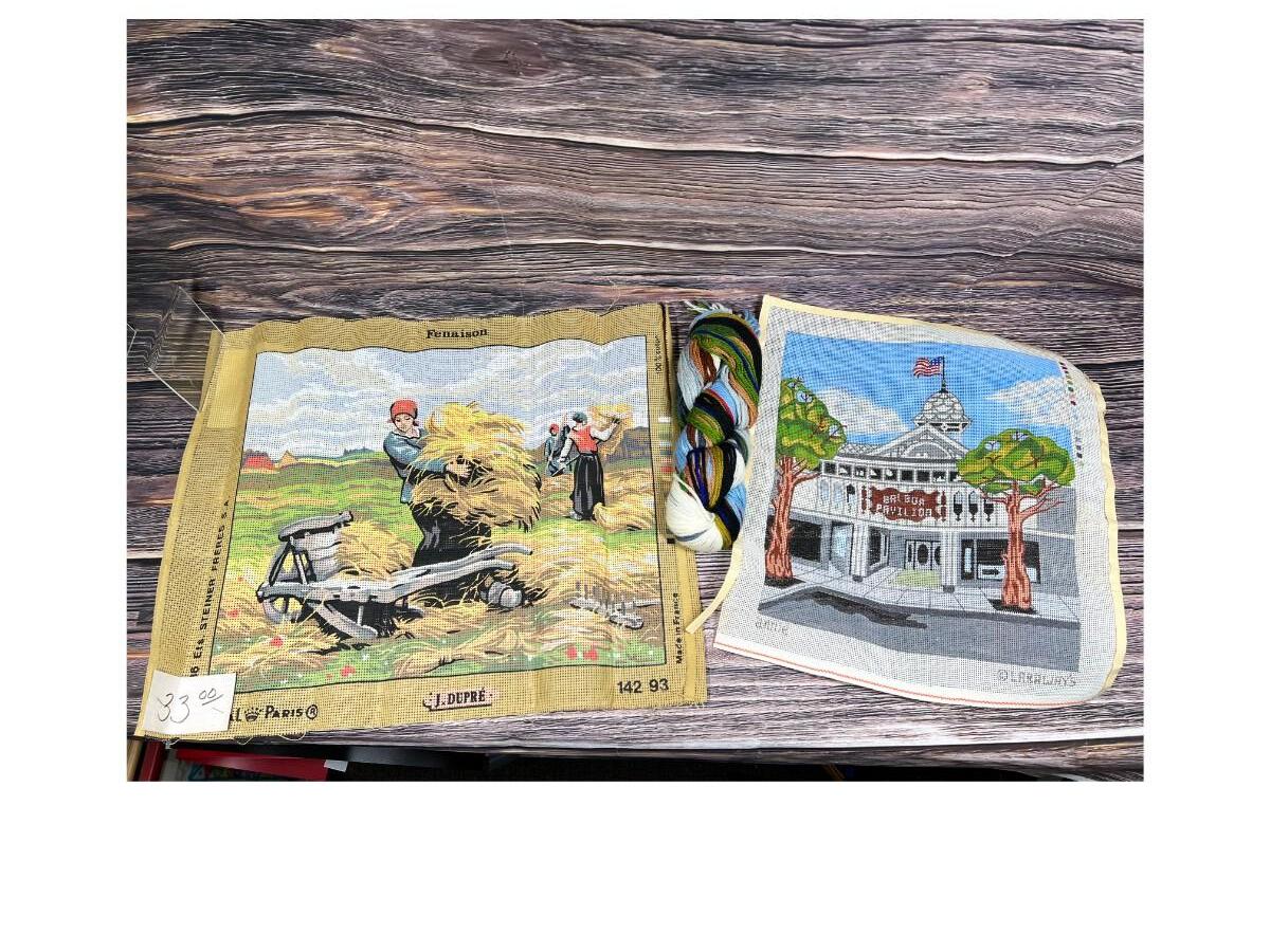 Pair of Vintage Needlepoint Canvas and Yarn Royal Paris Collectible Made in France Farm Workers & Laraways Balboa Pavilion