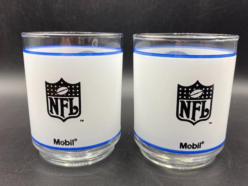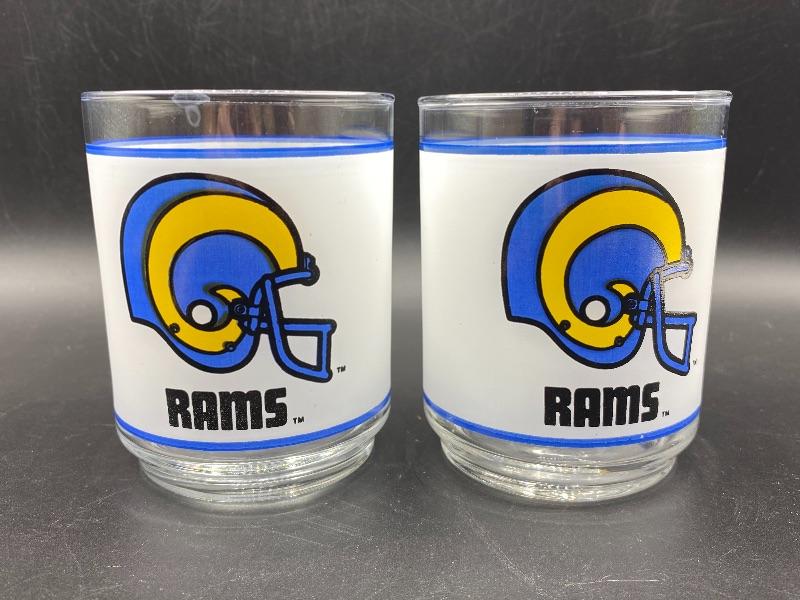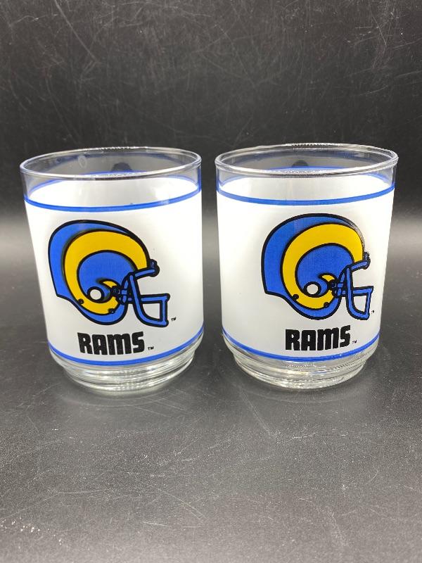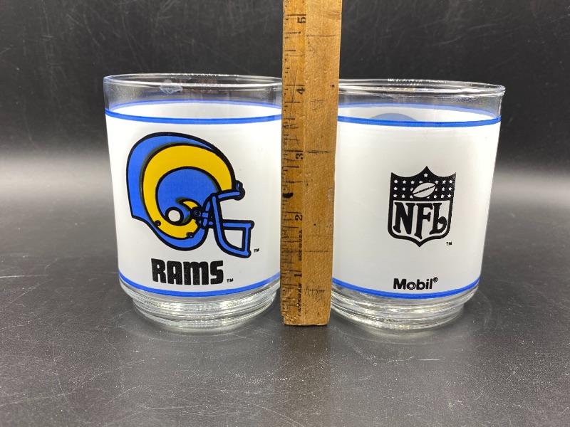 Pair of vintage Los Angeles Rams drink glasses. Tumbler/ rocks size at 4". Frosted glass with blue stripe and Rams helmet, These were released by Mobil gas in the 1980s. They do not say Los Angeles on them only Rams and NFL logo on backside.