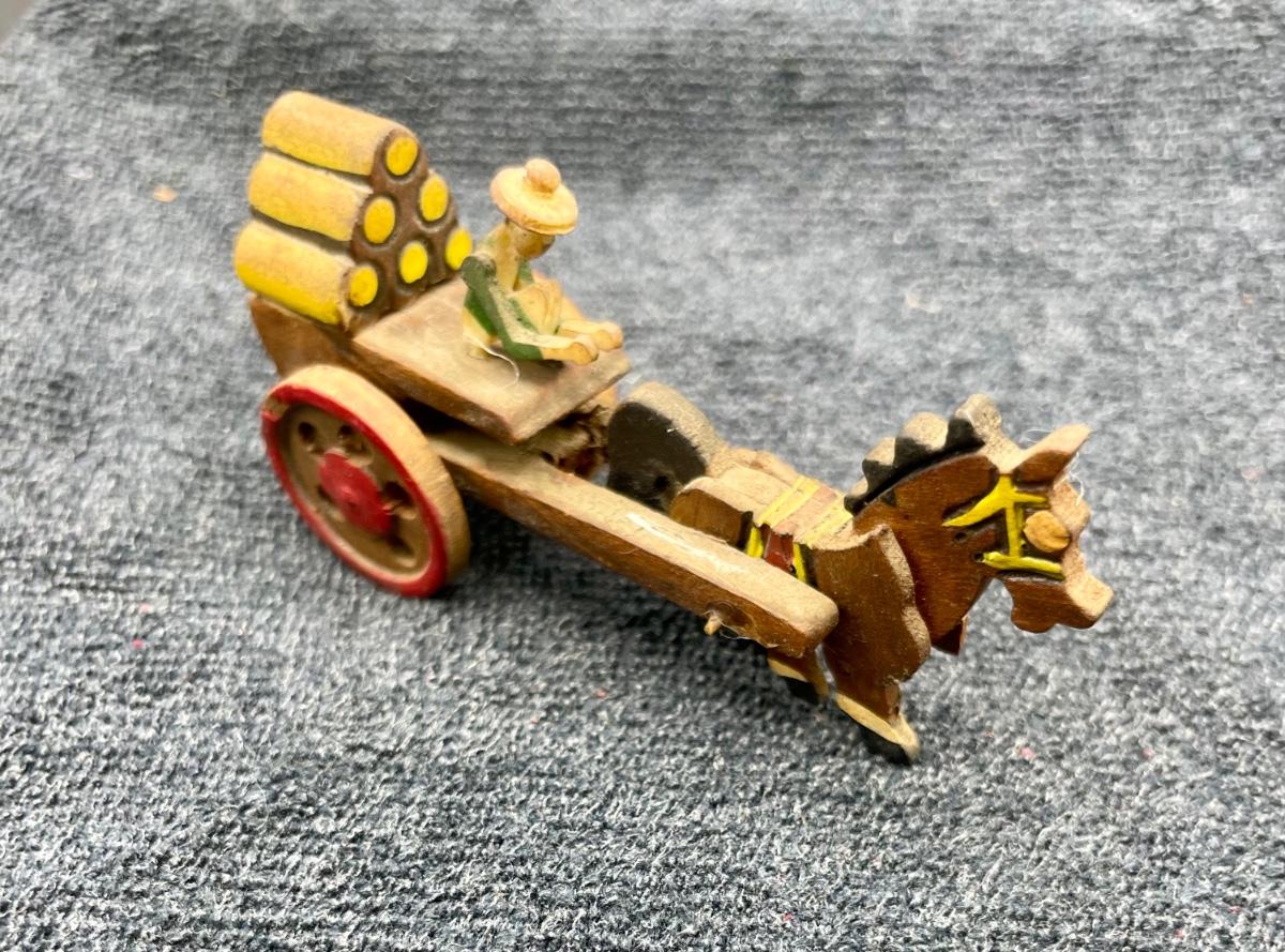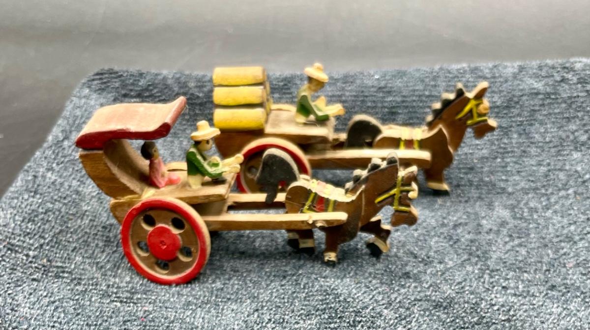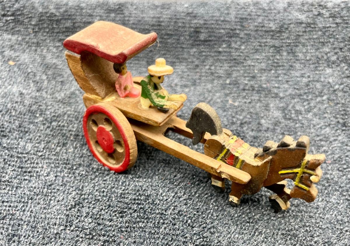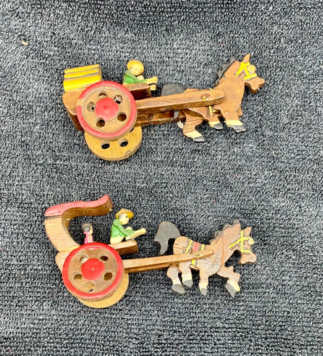 Pair of Vintage Painted Wood Horse and Cart Miniatures