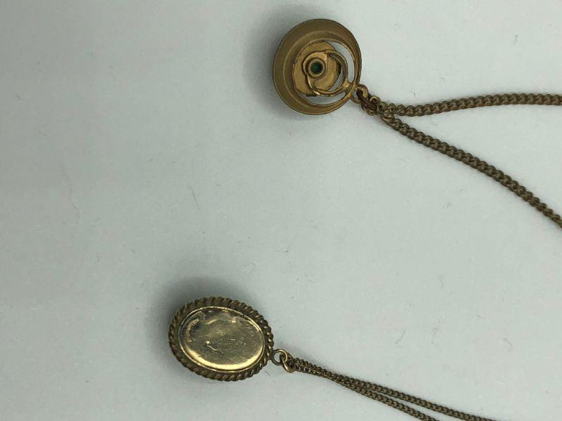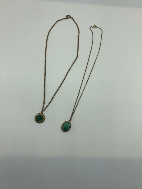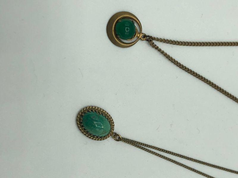 Pair of small pendant necklaces. Green cabochon centers. Both have about an 8" chain.
