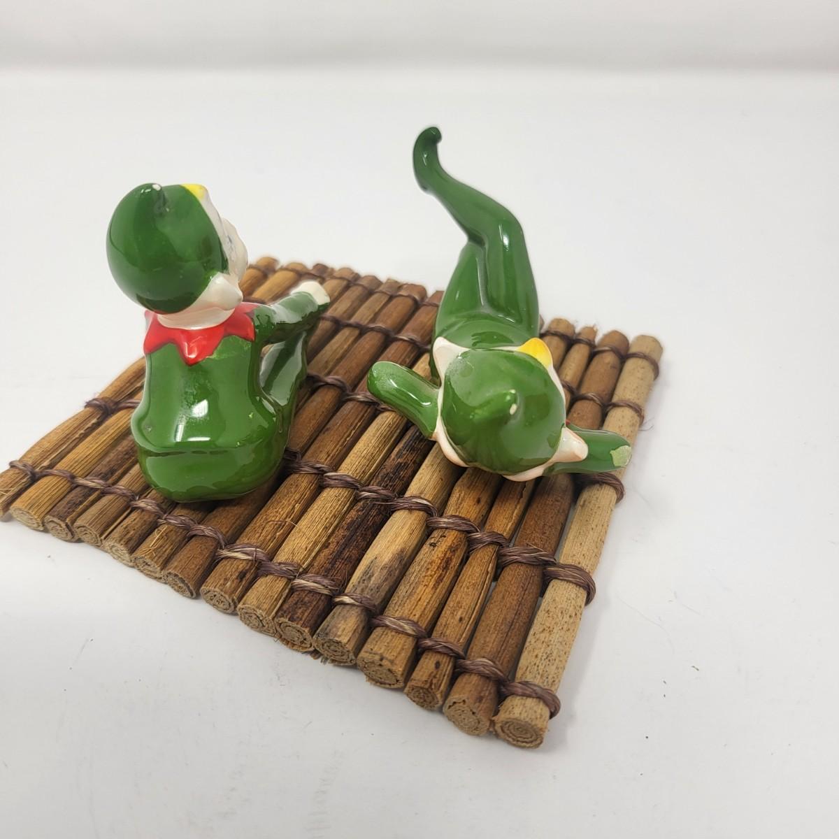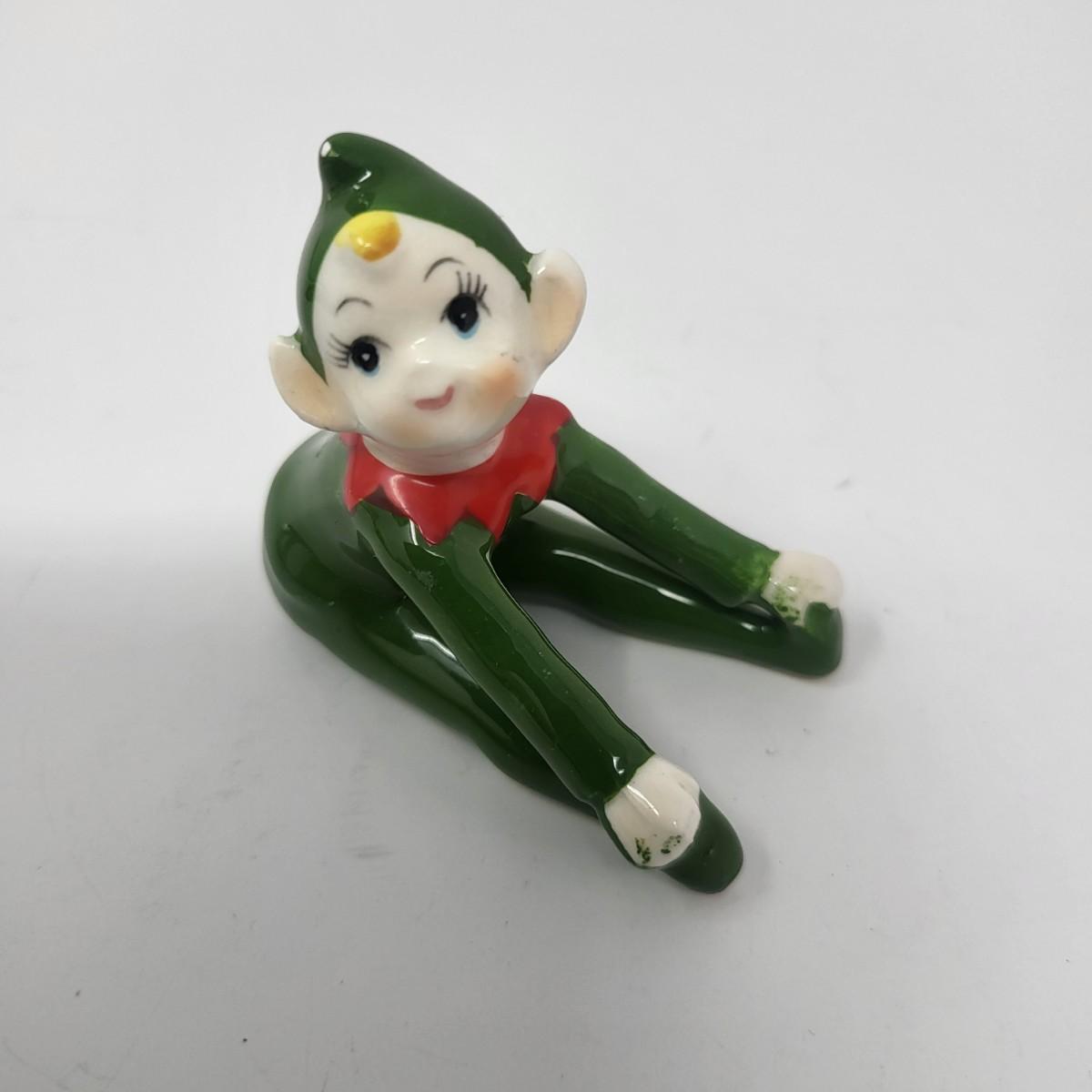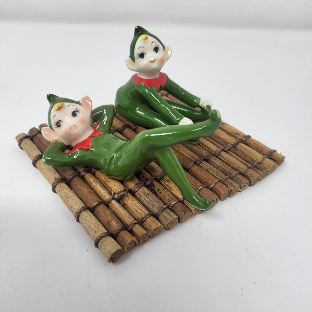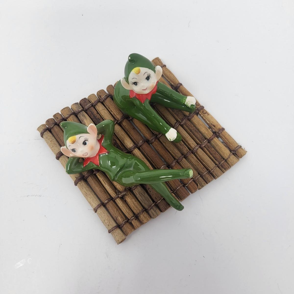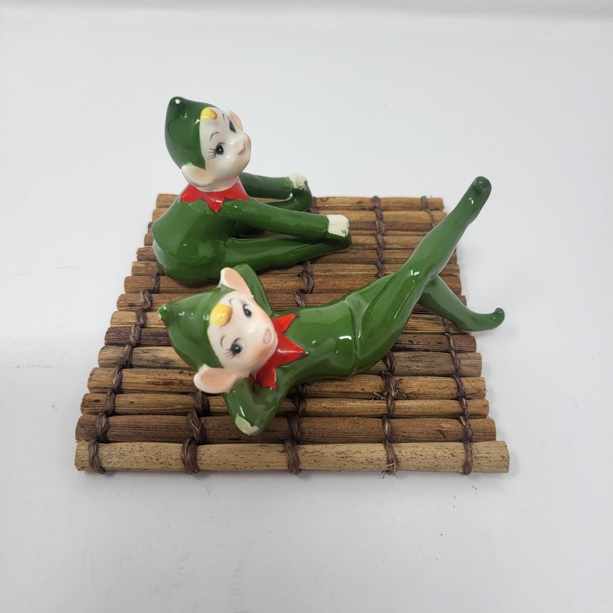 Sweetest pair of 3" vintage glaxed ceramic Elves/Pixies in green with red collars.
