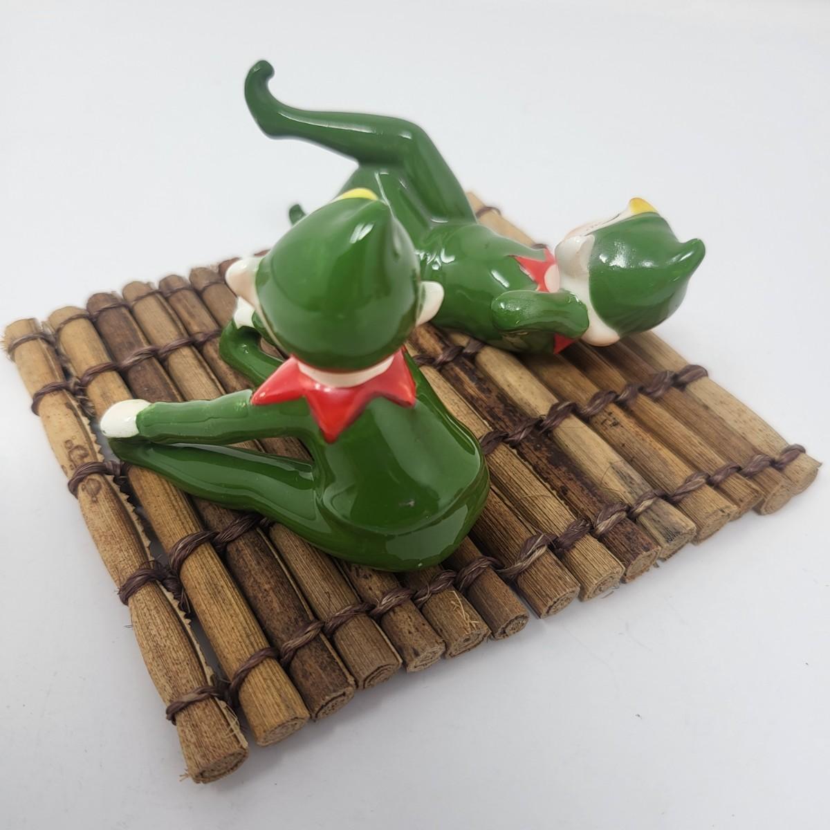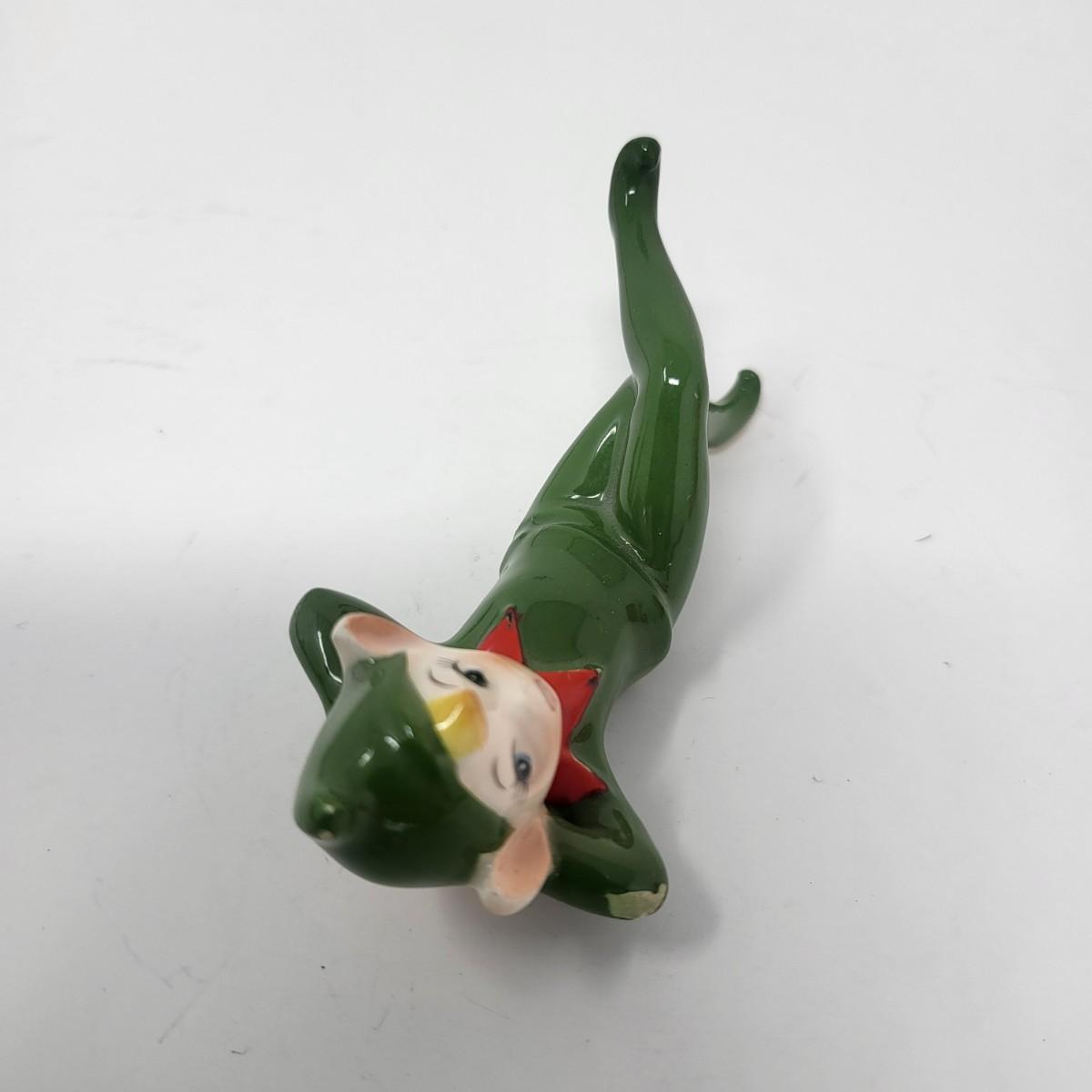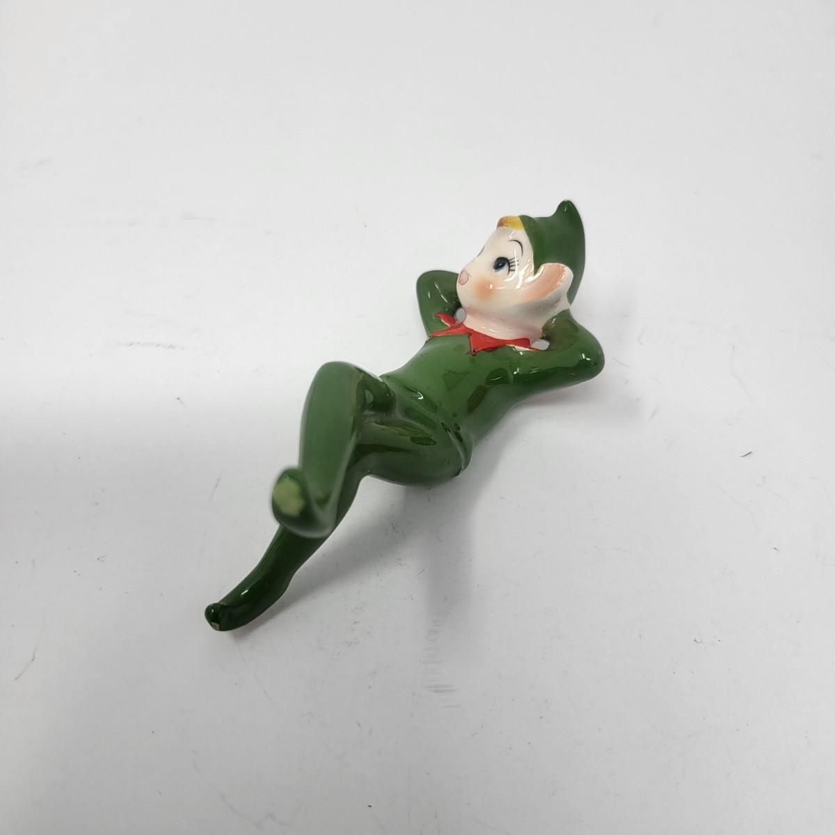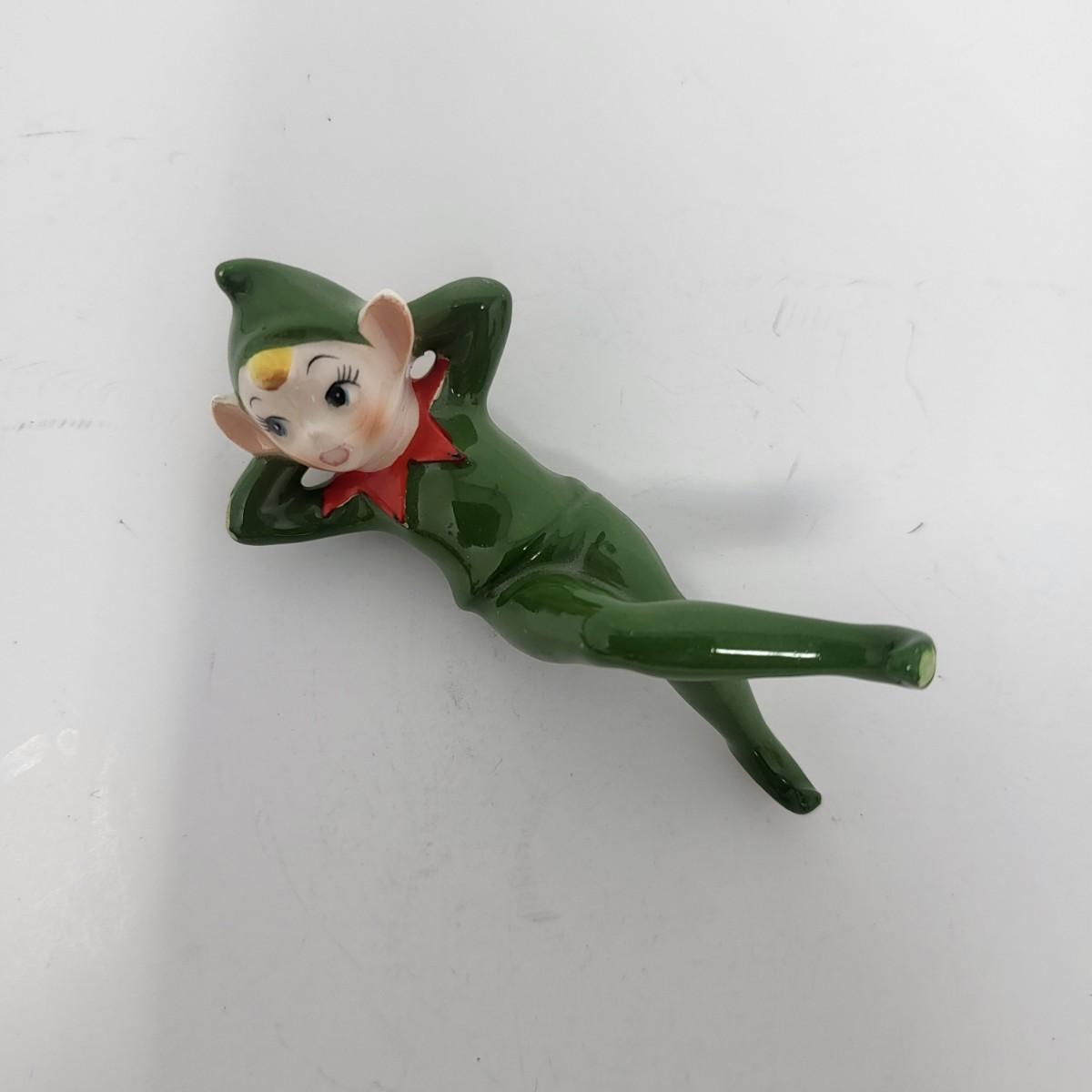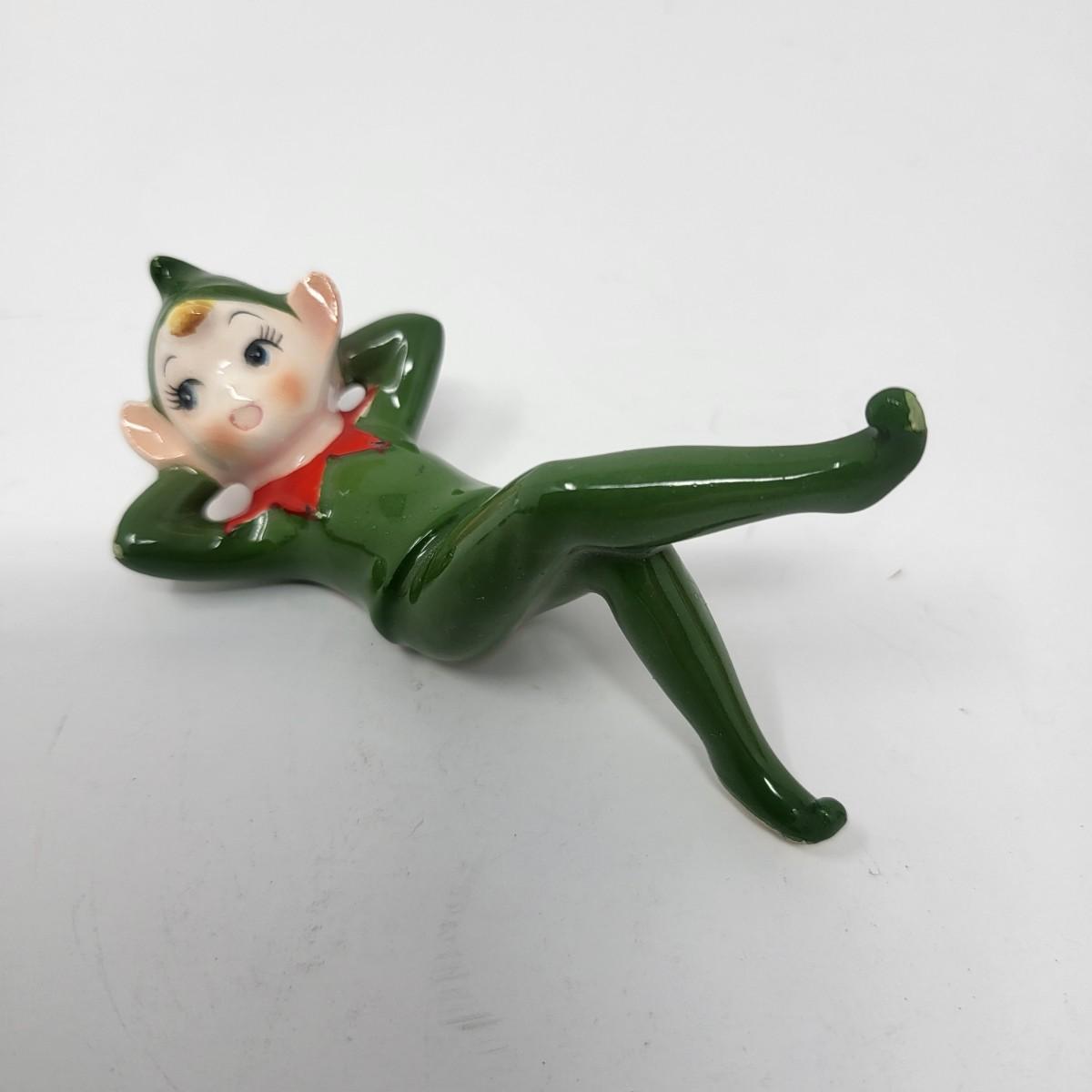 Sweetest pair of 3" vintage glaxed ceramic Elves/Pixies in green with red collars.