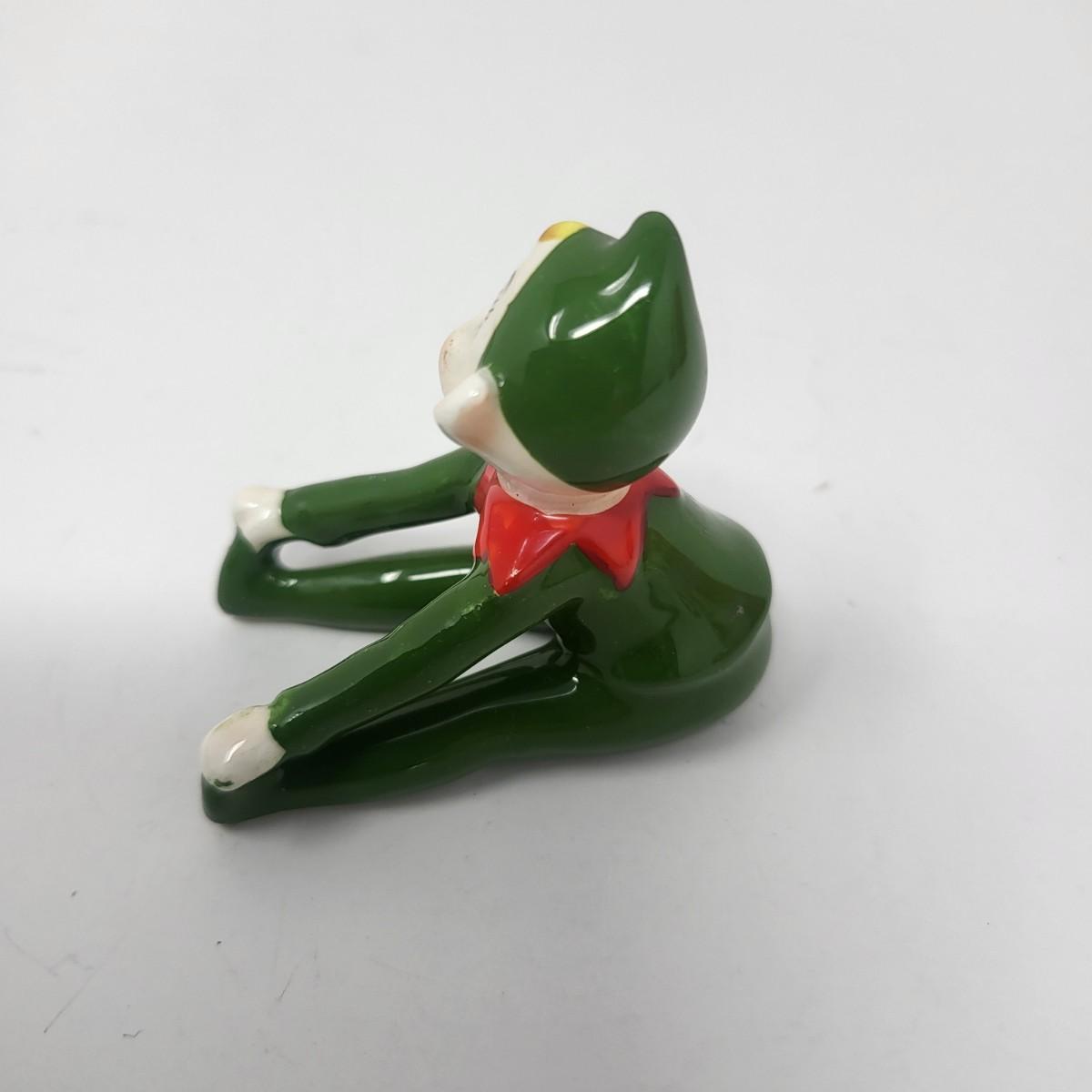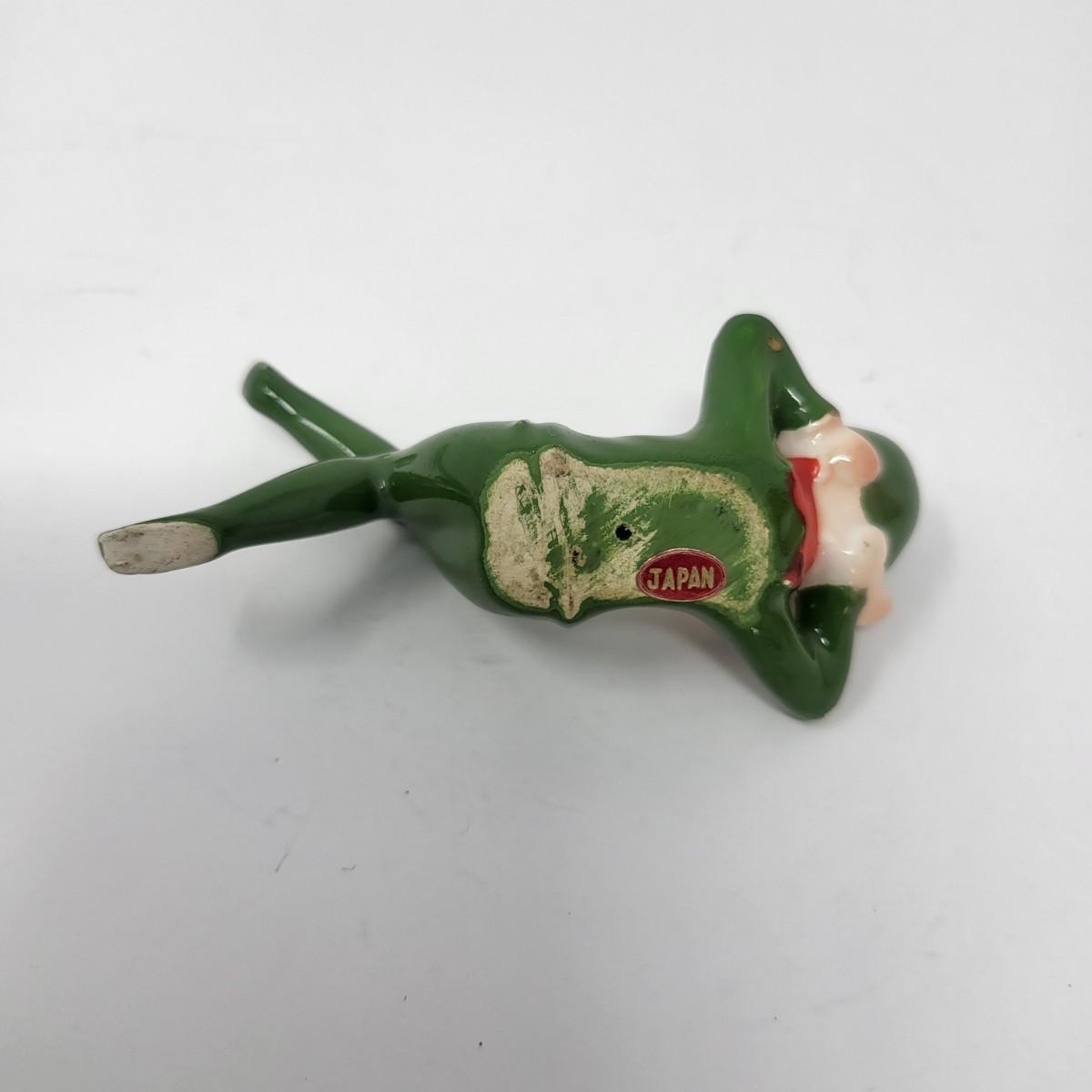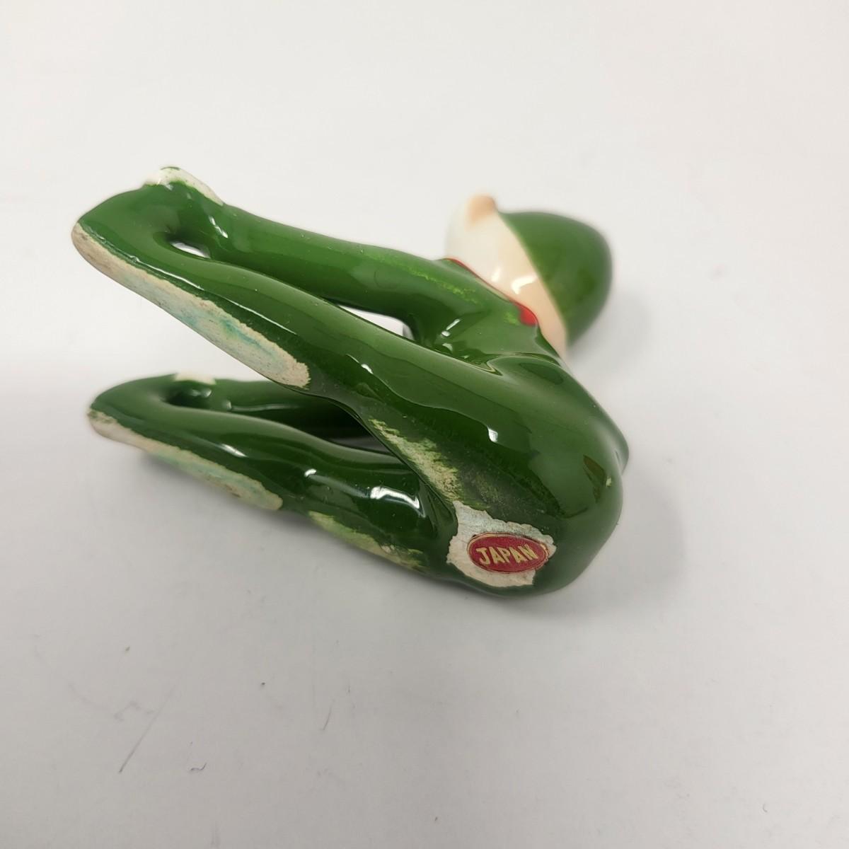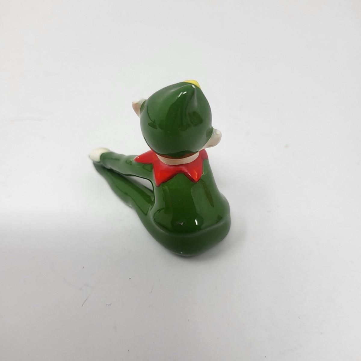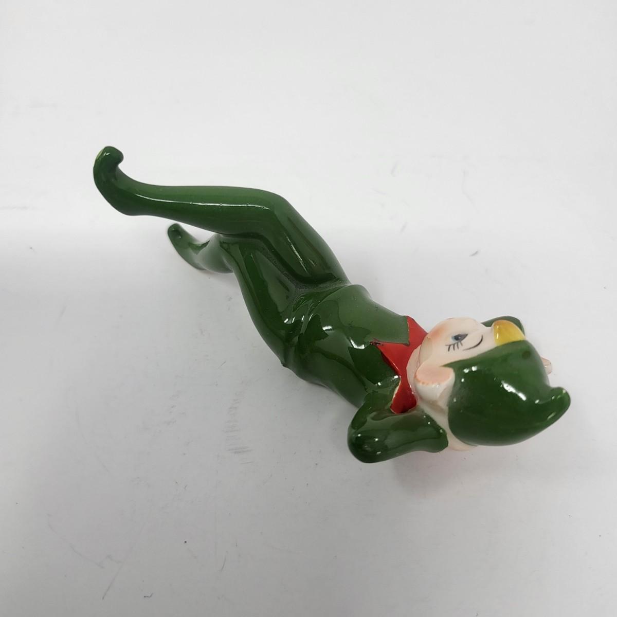 Sweetest pair of 3" vintage glaxed ceramic Elves/Pixies in green with red collars.