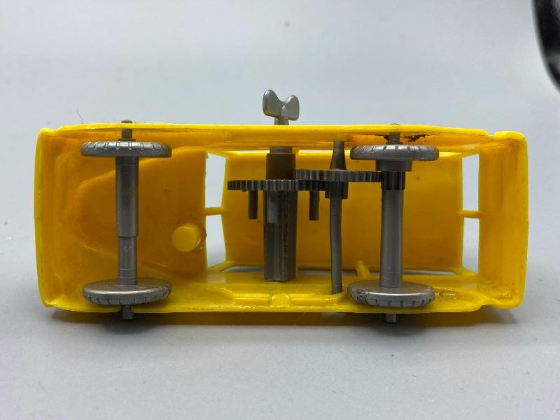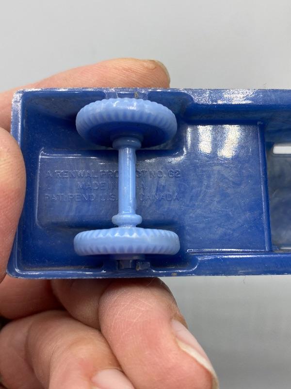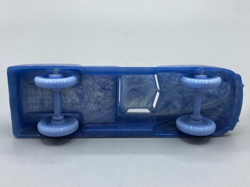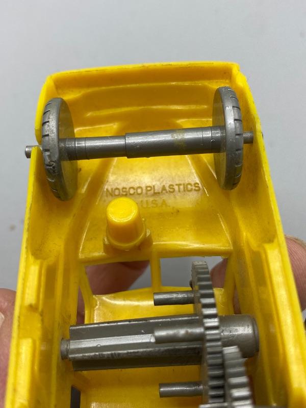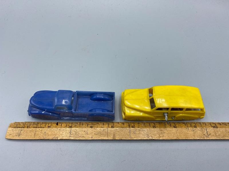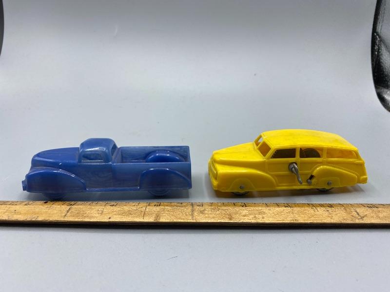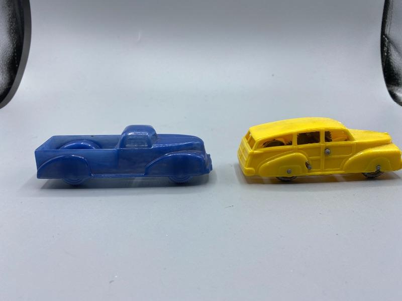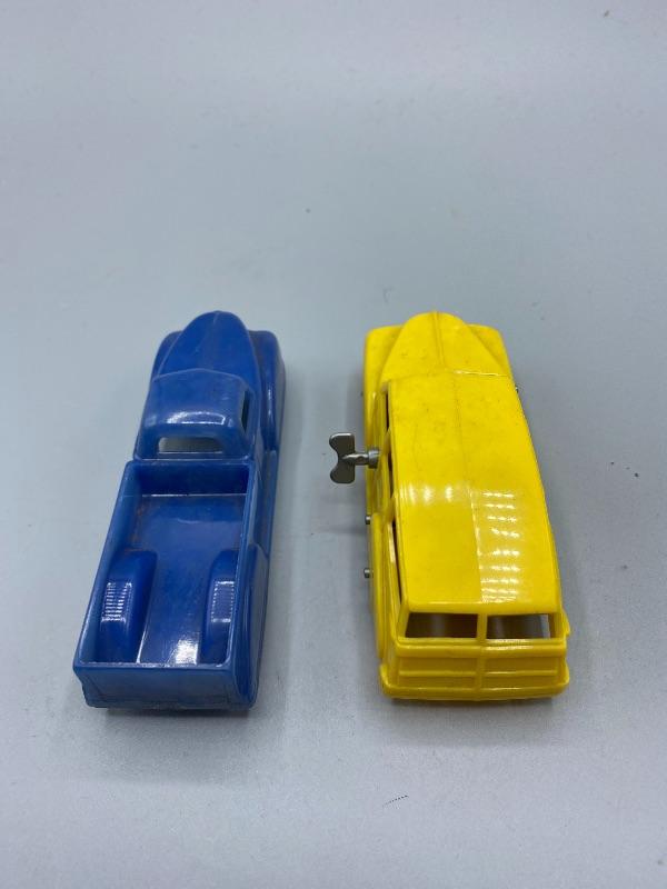 Pair of vintage toy cars. Both are made of plastic. The yellow car has a wind up mechanism but gears do not catch and I think it is missing maybe a rubber band or something to make it actually wind up. It is made by Nosco Plastics. The blue car is a truck, the plastic has an opaque swirl to the blue plastic. Made by A Renewal Product. The car bodies on both are in good condition. Display great.