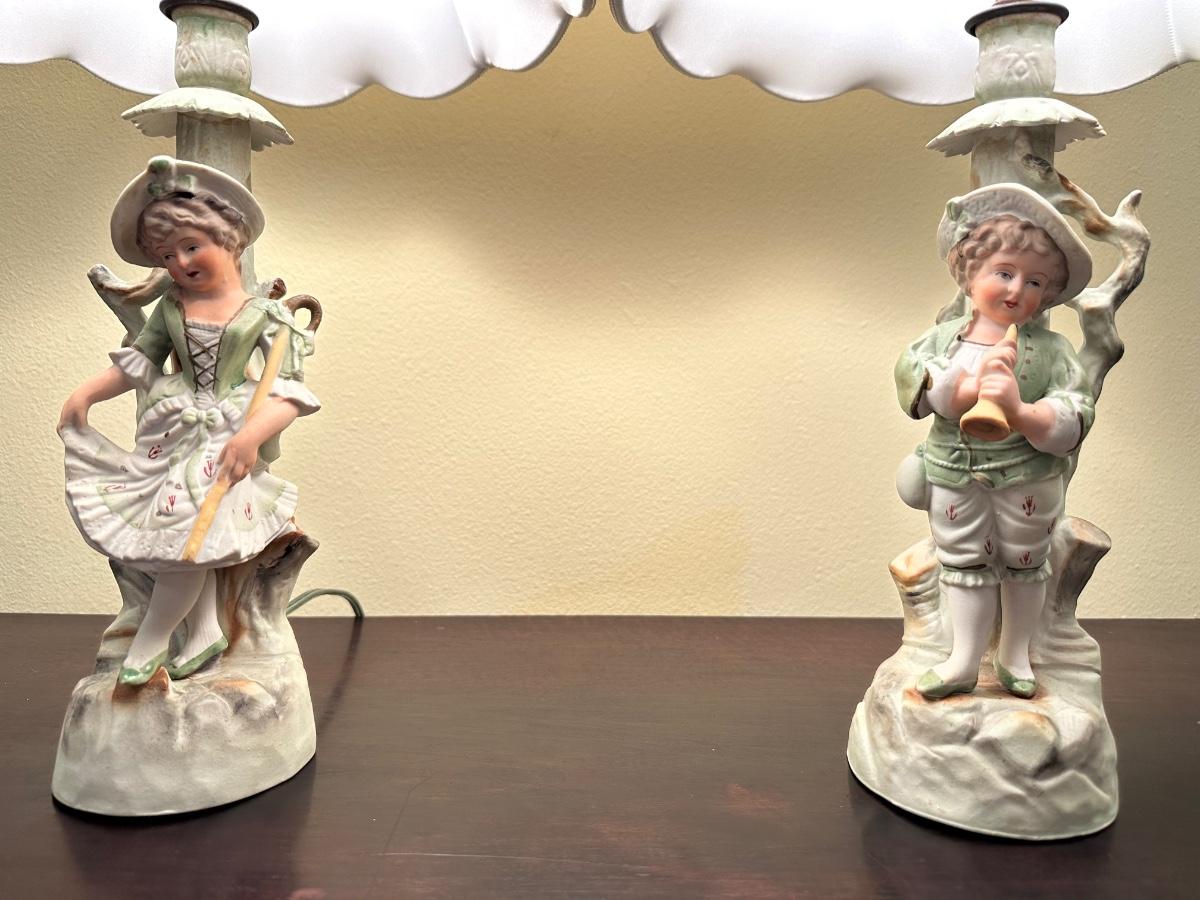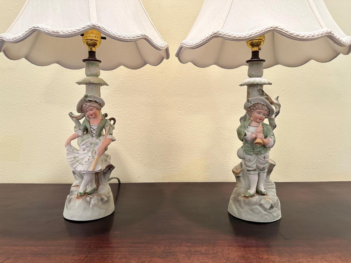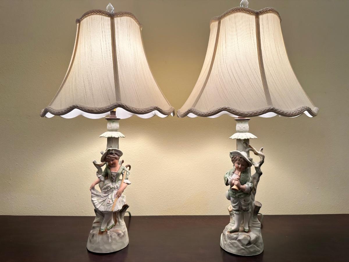 Pair of Vintage Porcelain Figural Lamps – Boy & Girl in Pastoral Dress