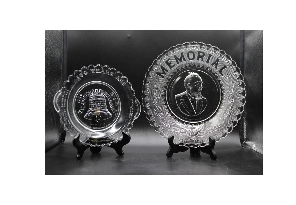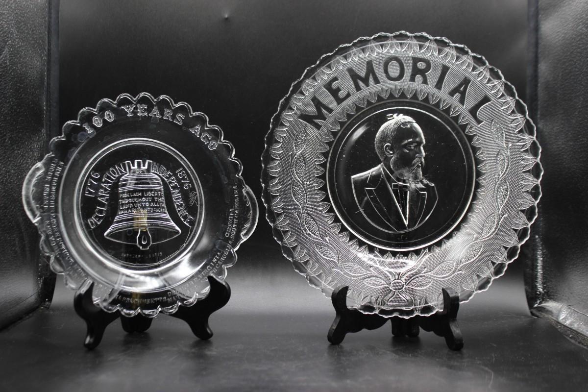 Pair of Vintage President James Garfield Memorial & Declaration of Independence Liberty Bell Commemorative Americana Glass Plates