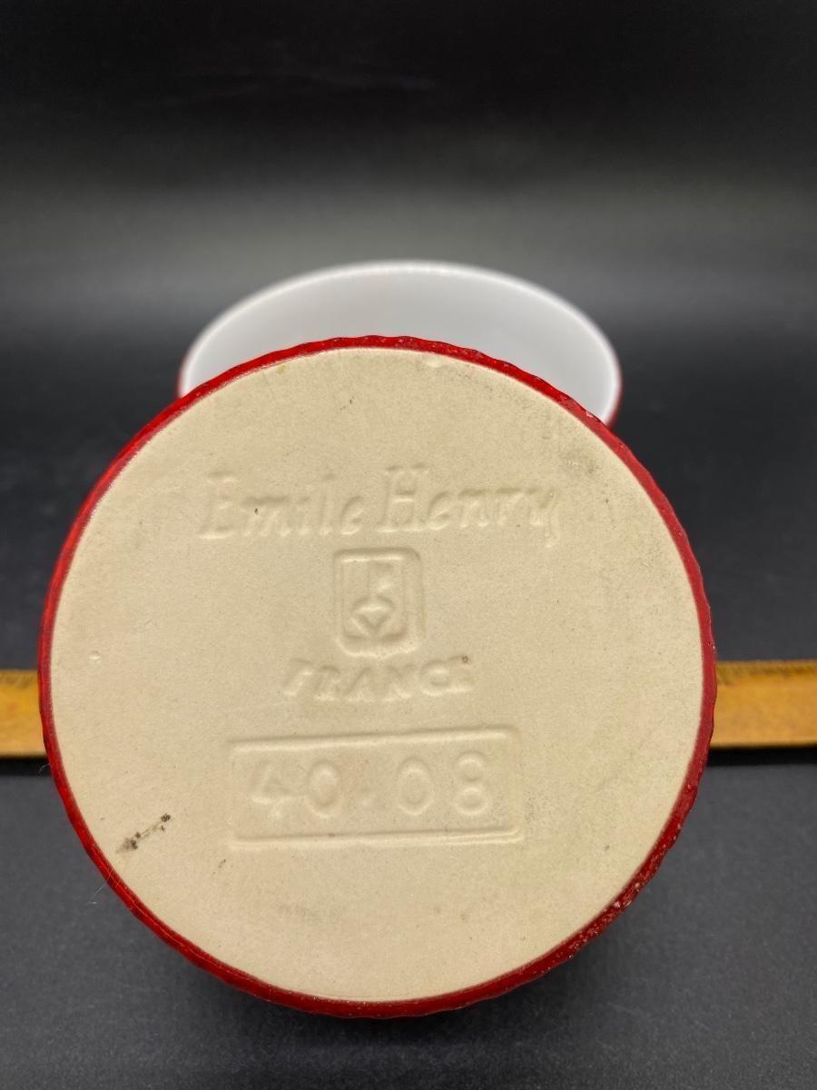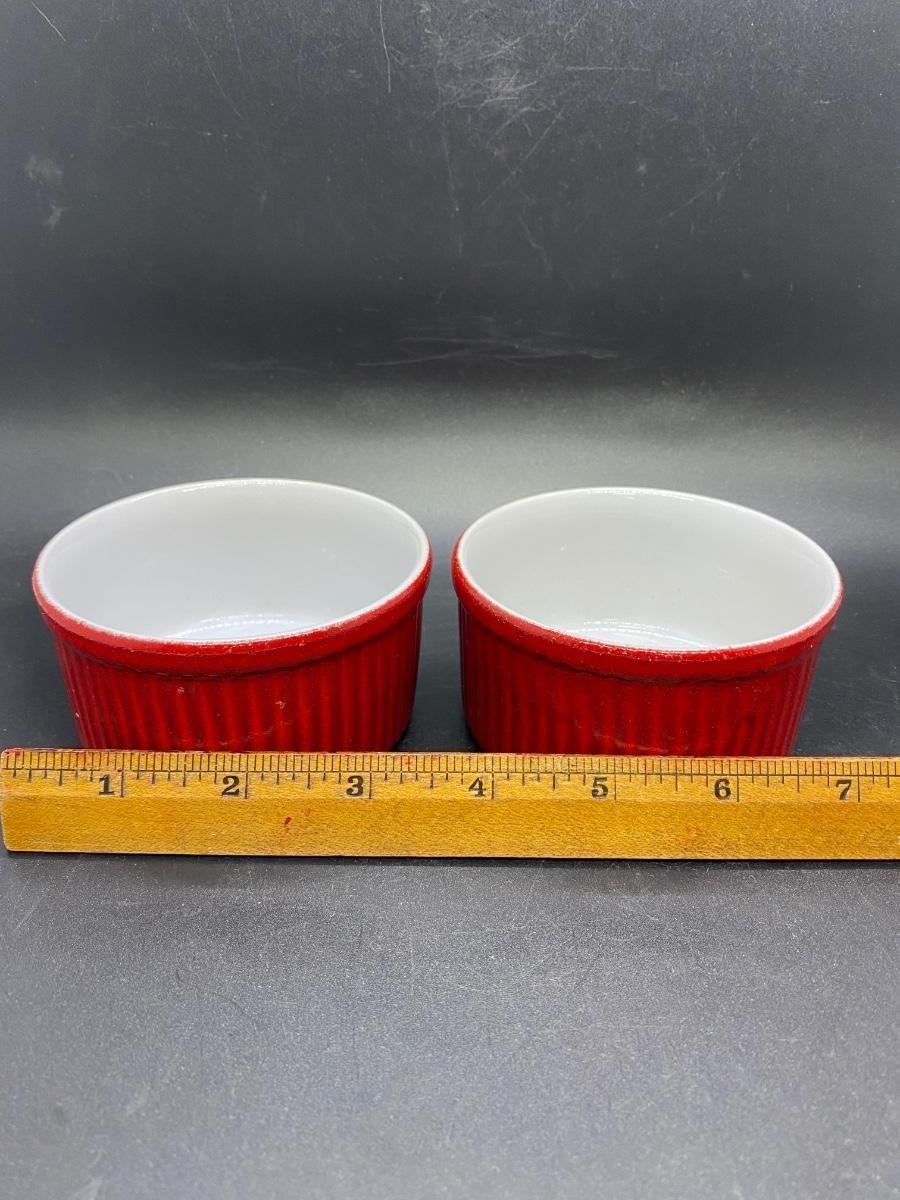 Pair of red Emile Henry ramekin dishes. Good condition. Ceramic, about 3" diameter.