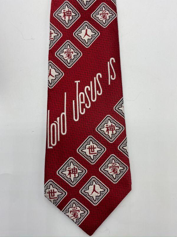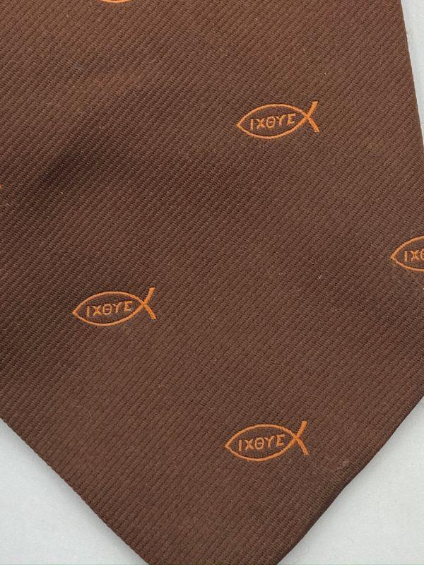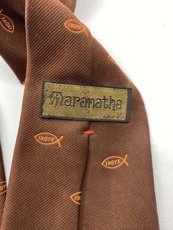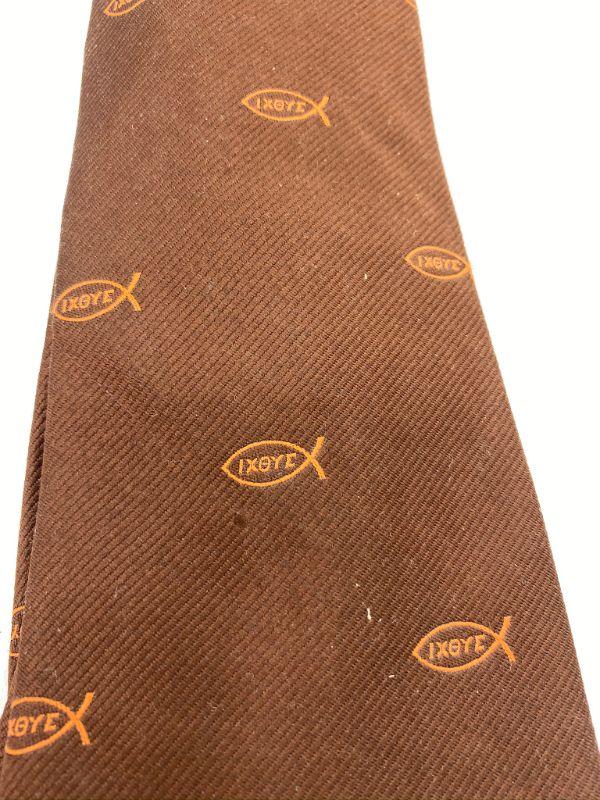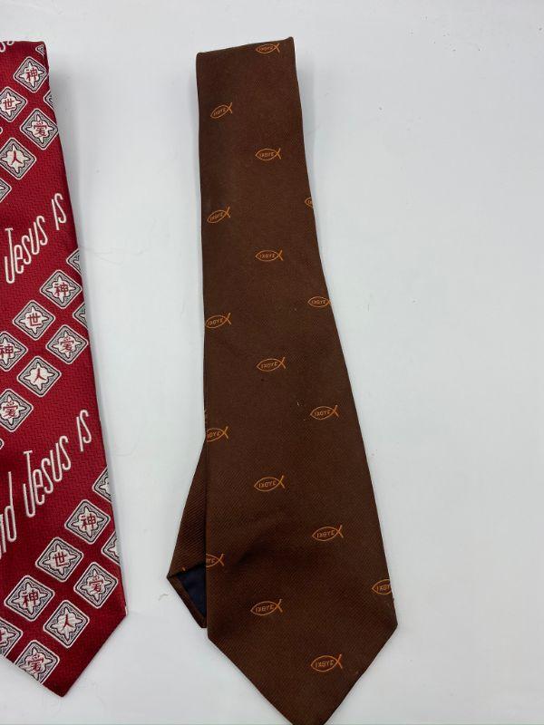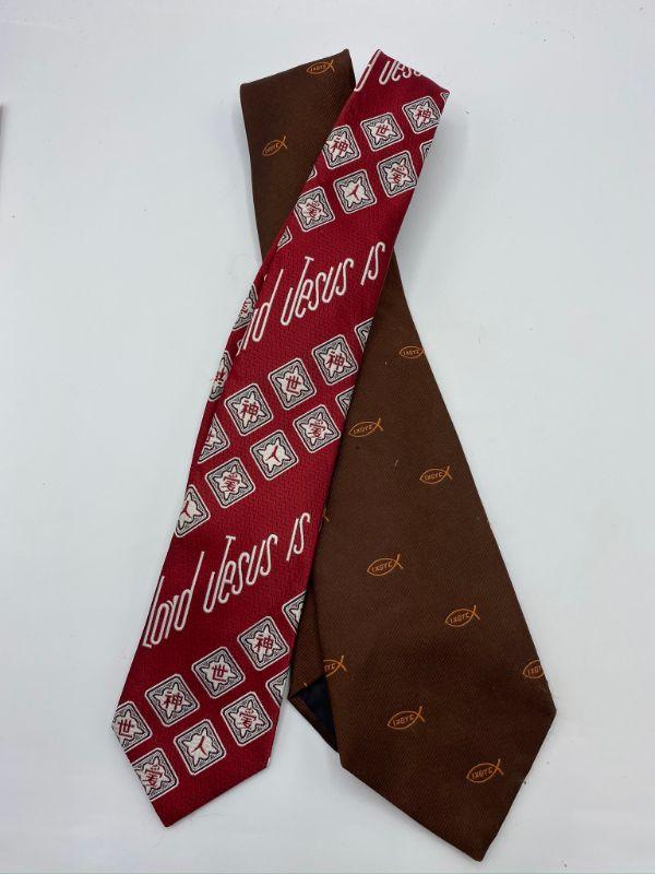 Pair of vintage religious themed neck ties. One is red and has Jesus is Lord on it, the other is brown with fish emblem on it. Previously used. There is a very small snag on the brown one, possibly from maybe a tie tack.