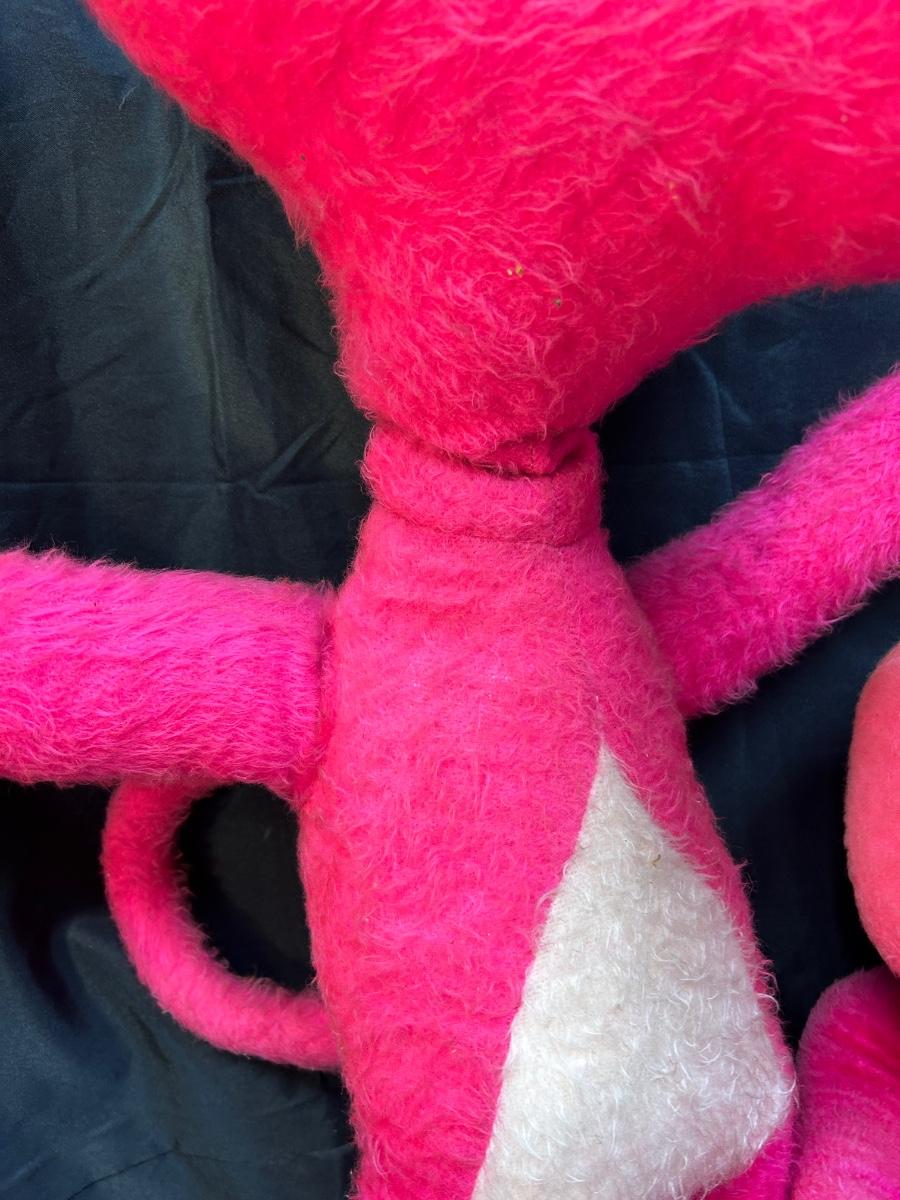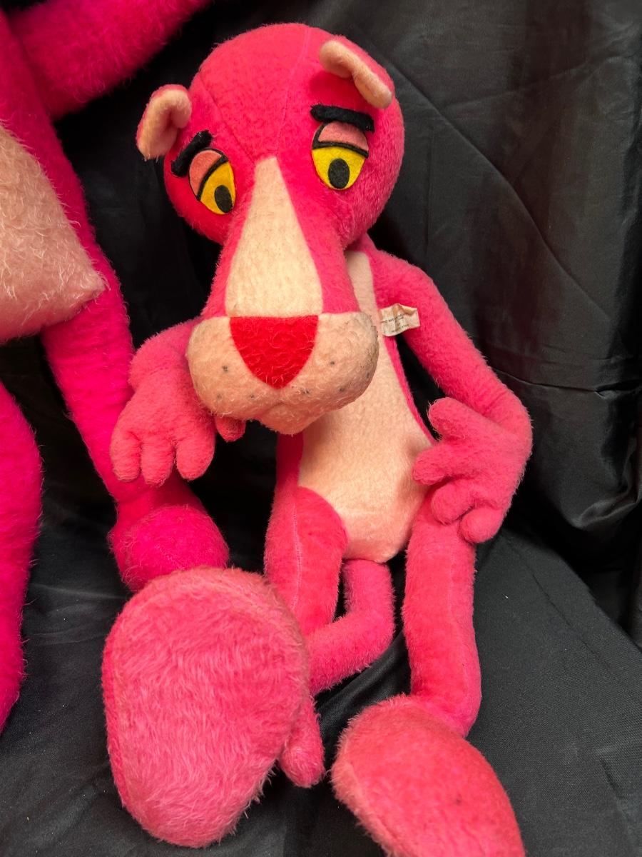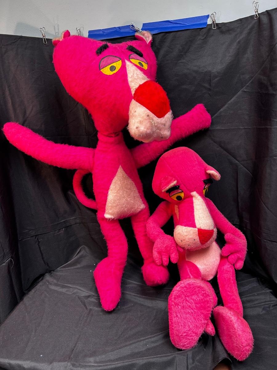 Pair of Vintage Retro Plush Stuffed Pink Panther Dolls. Both have been well loved. They have wire inside to help with posing but the fur and stuffing is a little worn. May have spots, smudges, repairs. The smaller has a small hole on back of neck. The larger has a loose neck. See photos. Both are of good size.
