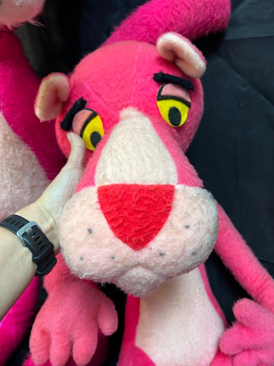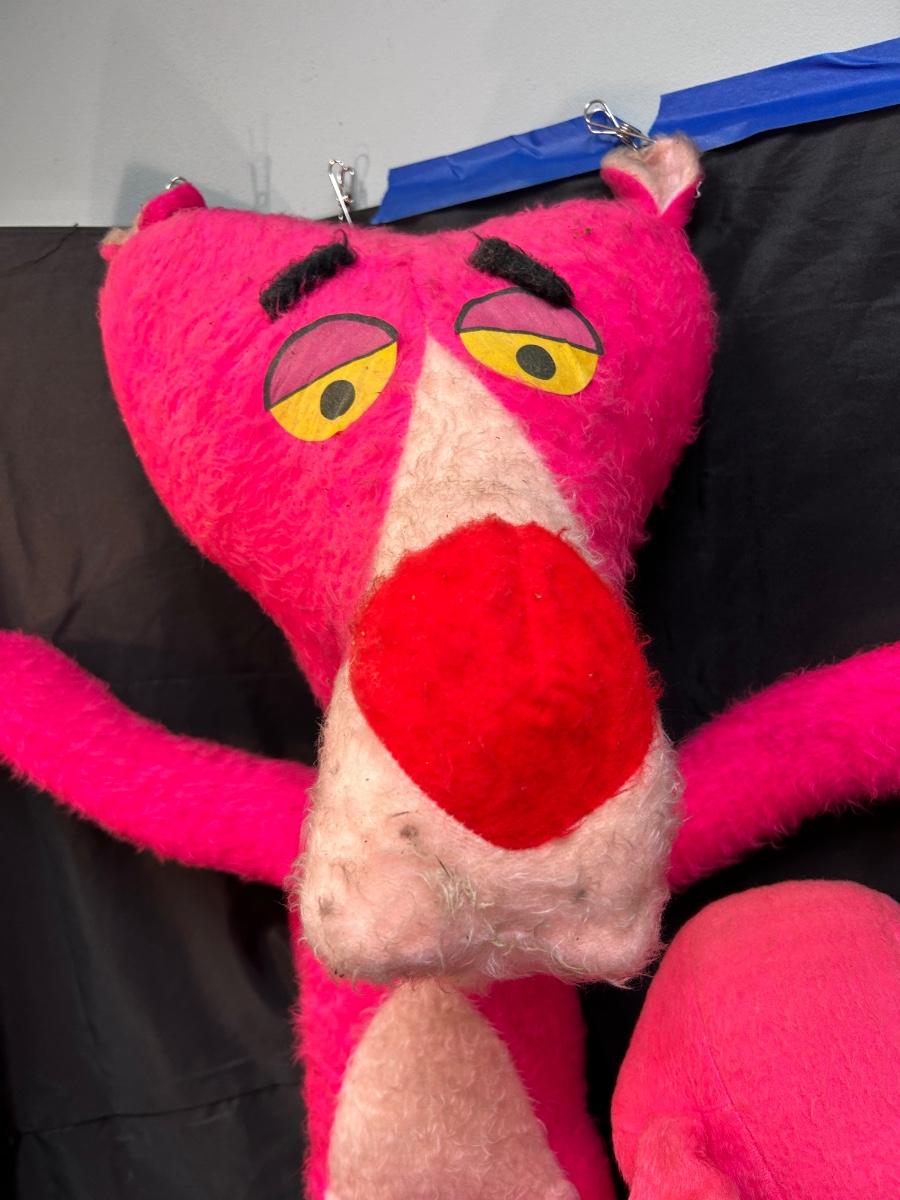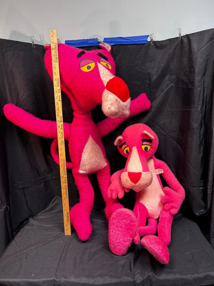 Pair of Vintage Retro Plush Stuffed Pink Panther Dolls. Both have been well loved. They have wire inside to help with posing but the fur and stuffing is a little worn. May have spots, smudges, repairs. The smaller has a small hole on back of neck. The larger has a loose neck. See photos. Both are of good size.