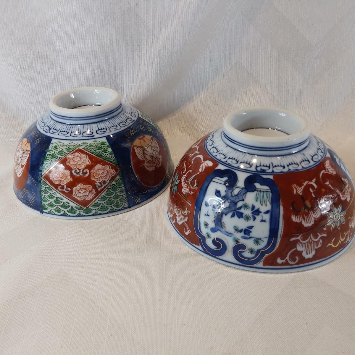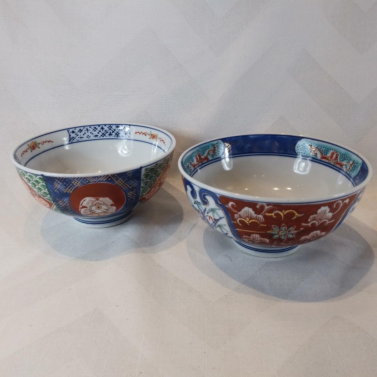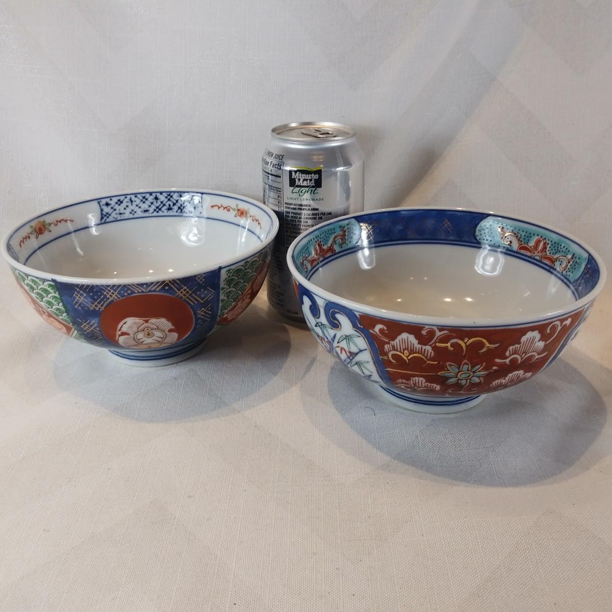 This auction lot is for a Pair of Vintage Asian Bowls. This offering is a sweet pair of two different motif Asian bowls. They are unmarked but seem to have some age based on the feel and thickness of their base.- early import ware (?) They are in very good condition and measure about 6.25-inches in diameter.