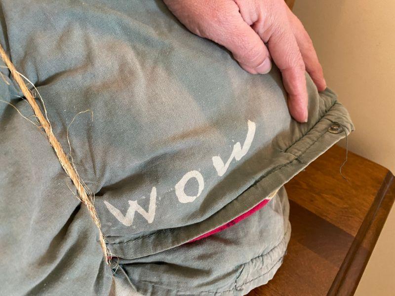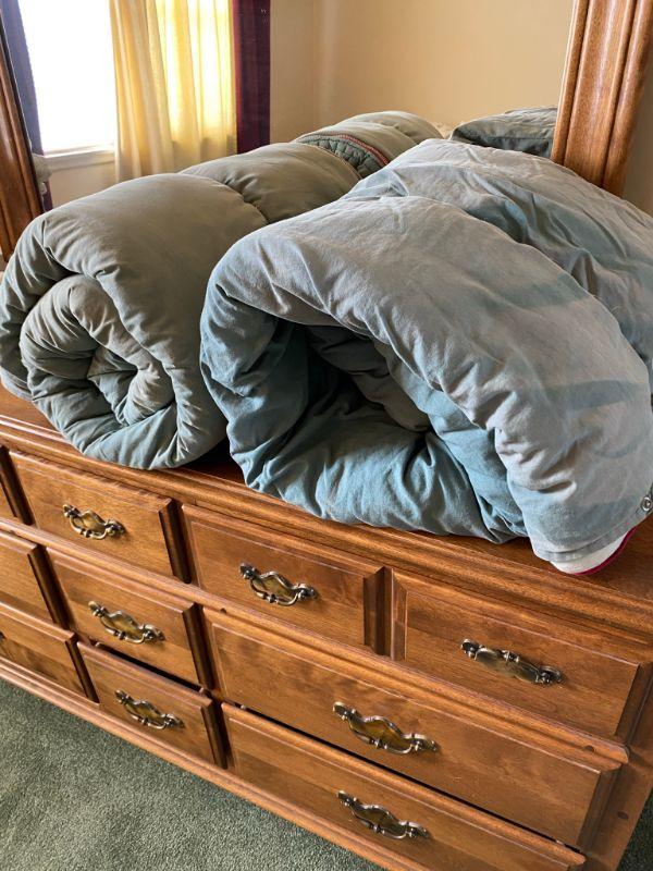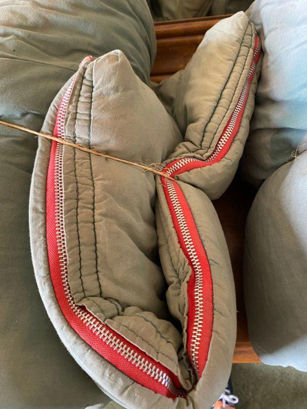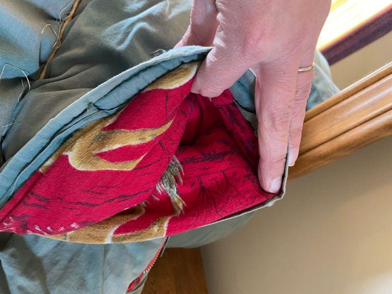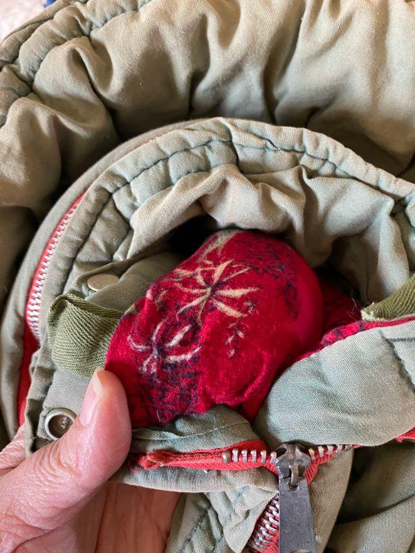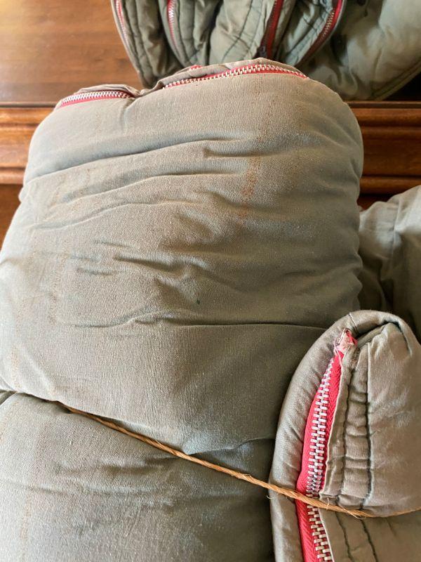 Pair of vintage sleeping bags. Olive green outside, red flannel pattern inside. One has the name "Mom" along the edge. Did not unroll, but these were up in a closet.