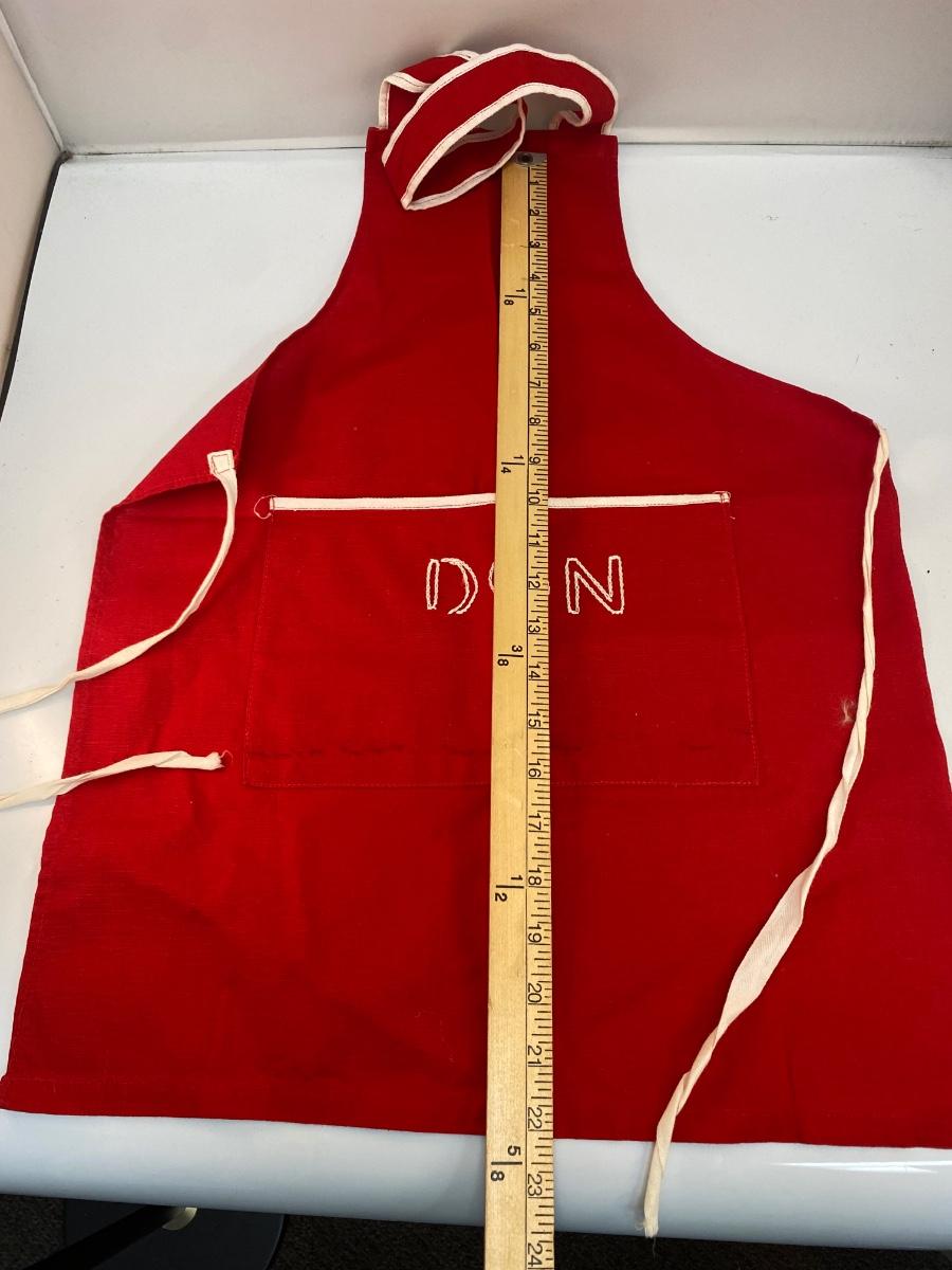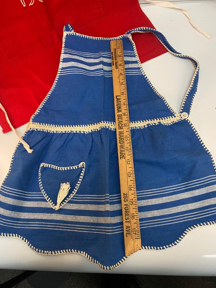 Pair of Vintage Small Child Childrens Cooking Aprons Red & Blue. In good vintage condition. The red one is personalized with the name Don. The blue one is in the better condition of the two. These are both child/teen size.