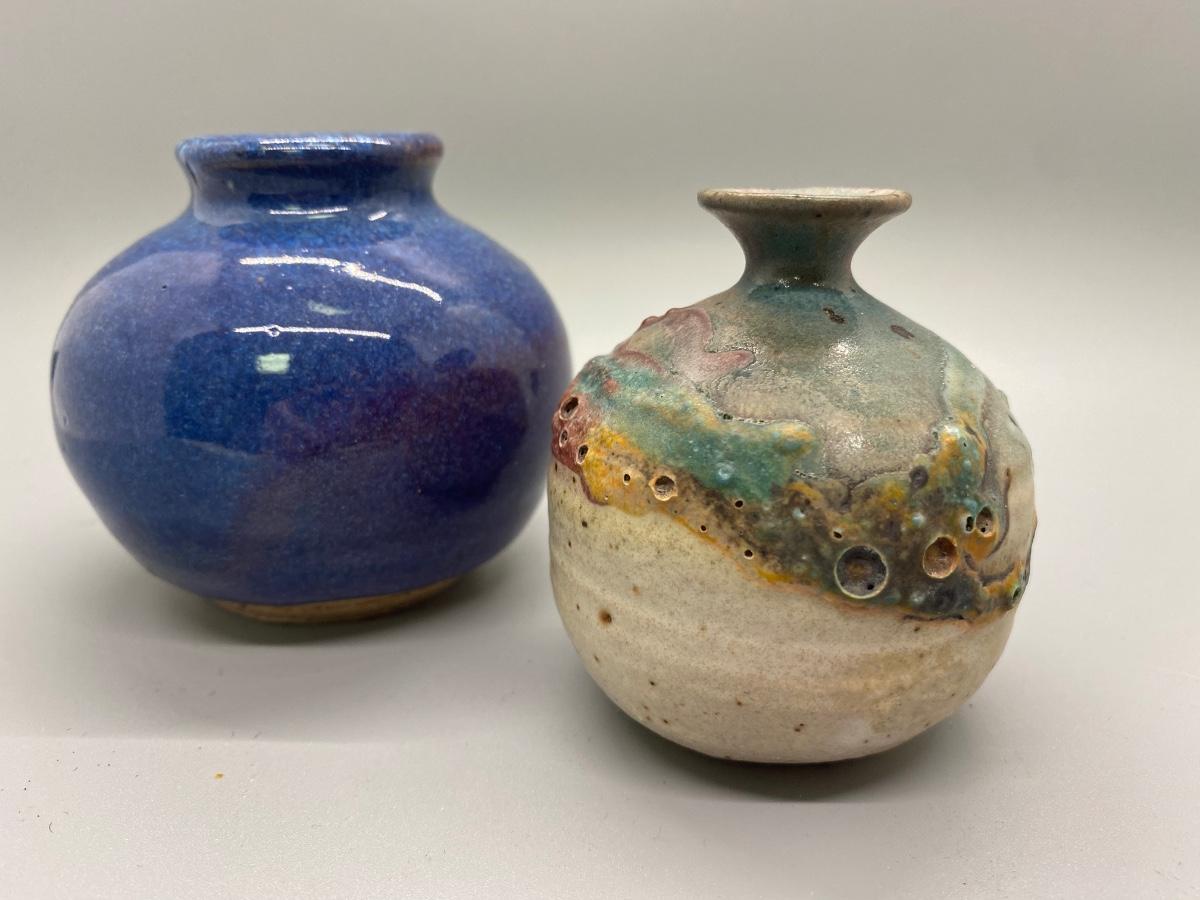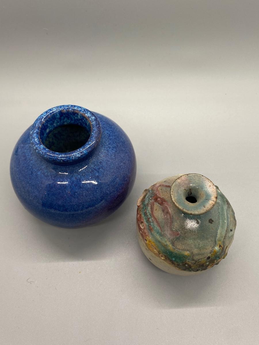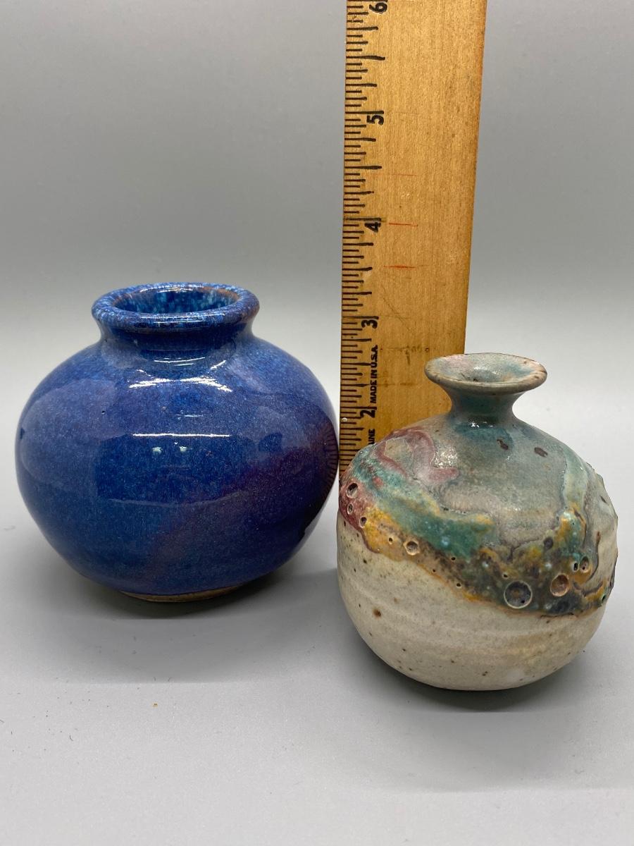Pair of hand thrown pottery vessels. Small planter pot bud vases. Glazed blue purple piece is artist signed. Both in good condition, about 3" size.