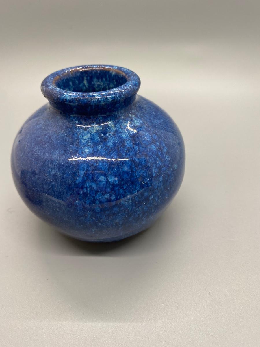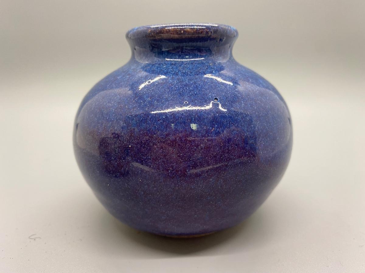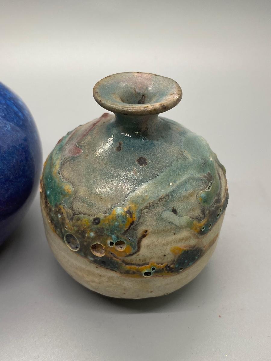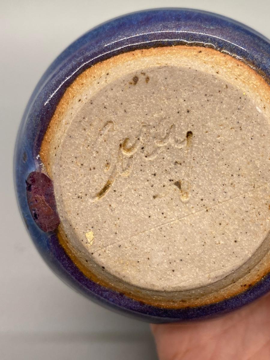 Pair of hand thrown pottery vessels. Small planter pot bud vases. Glazed blue purple piece is artist signed. Both in good condition, about 3" size.