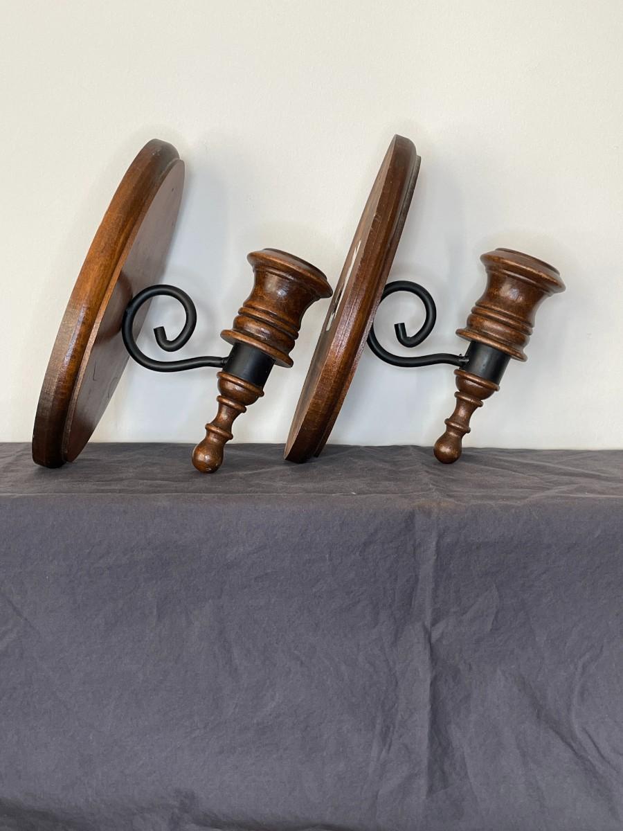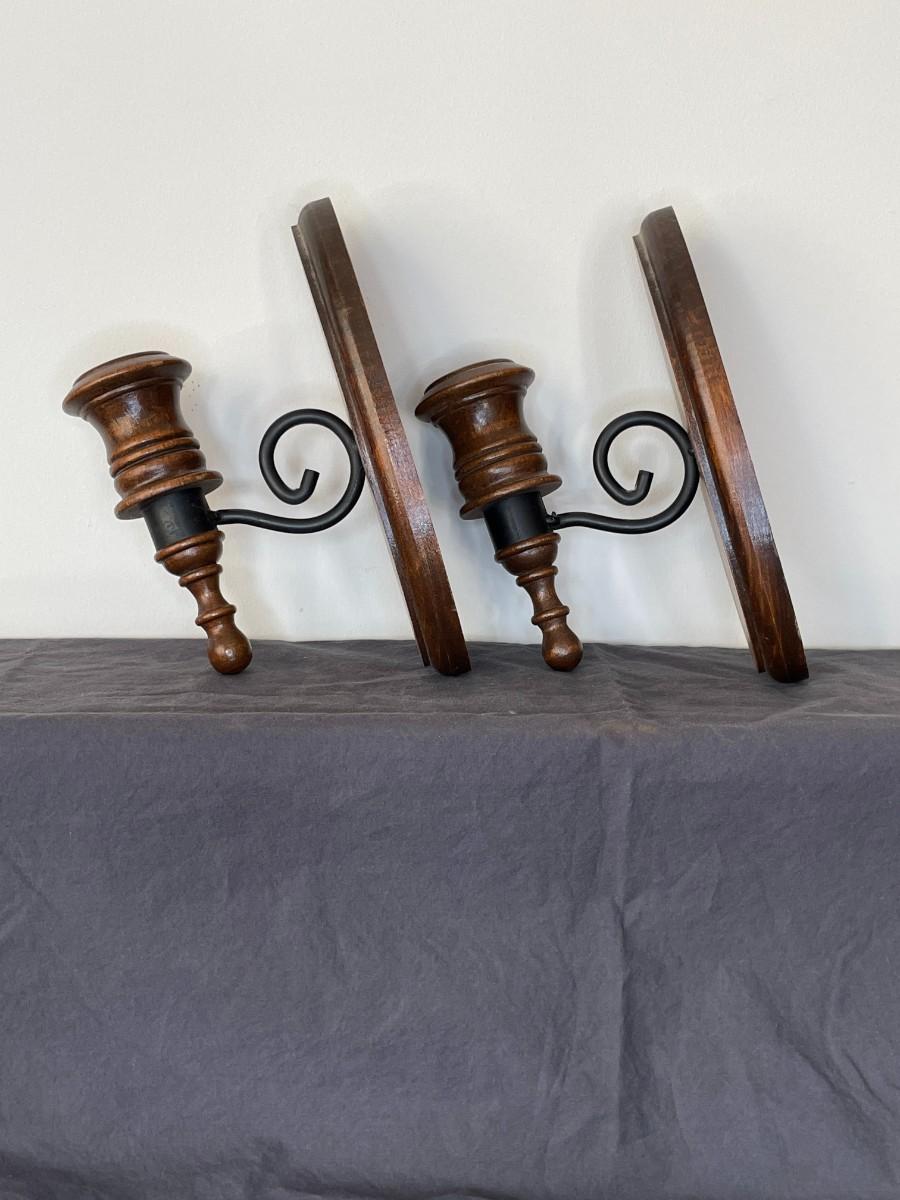 Pair of Vintage Solid Wood Black Metal Candle Holders
