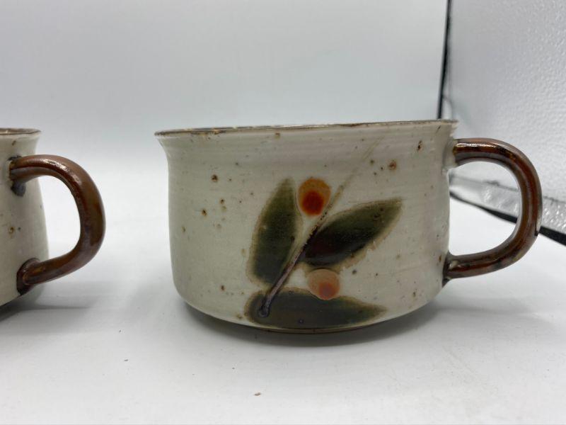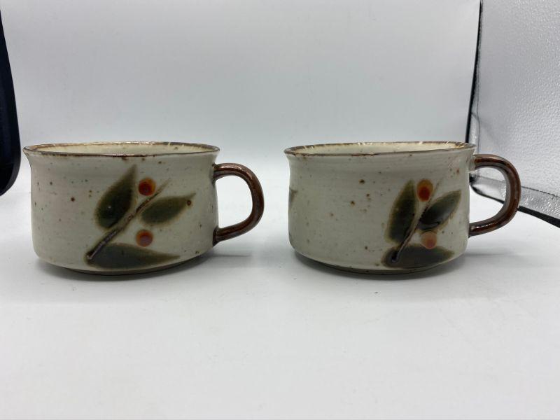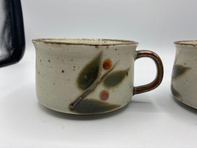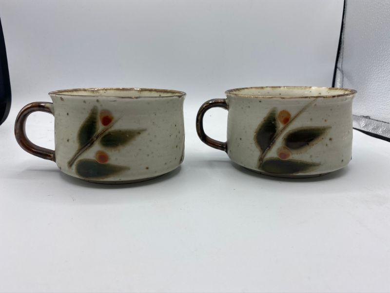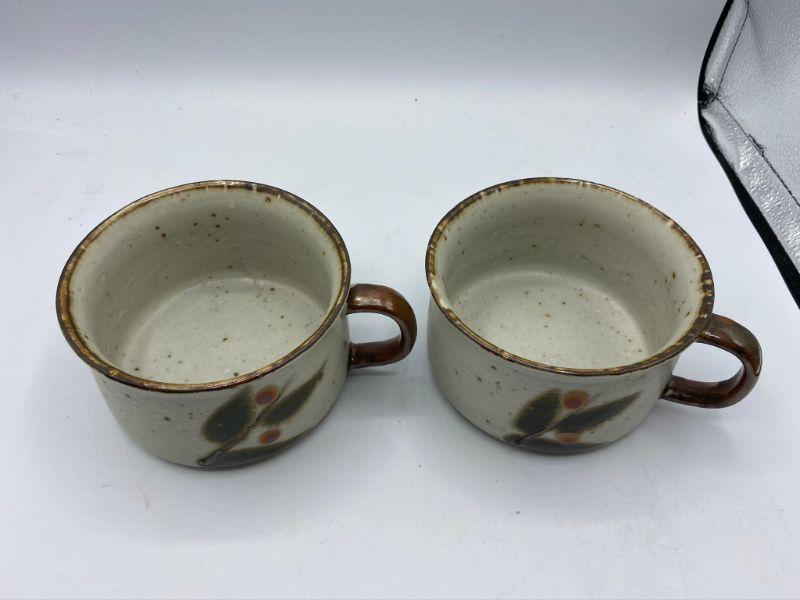 Vintage stoneware soup mugs. Leaf and berry pattern on speckled background. Good condition.