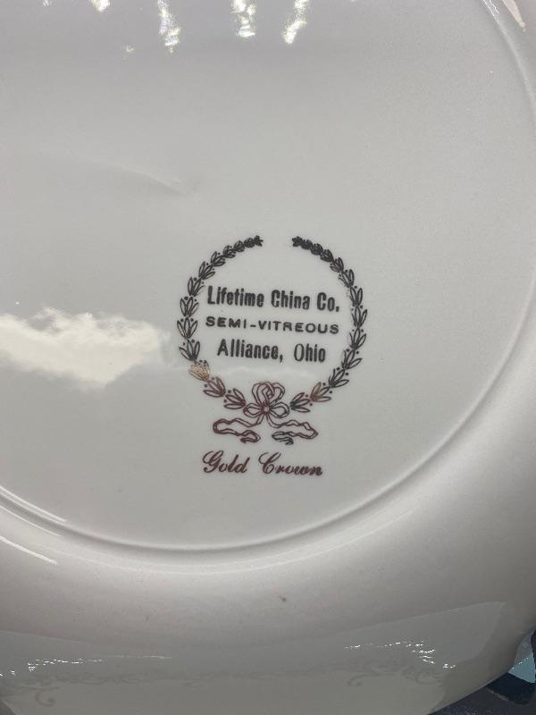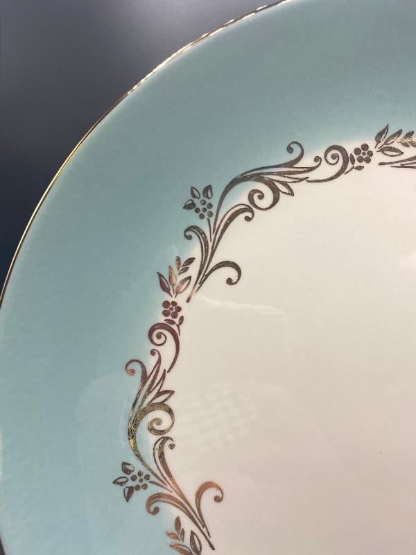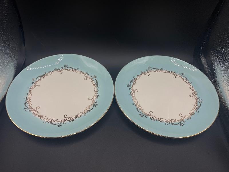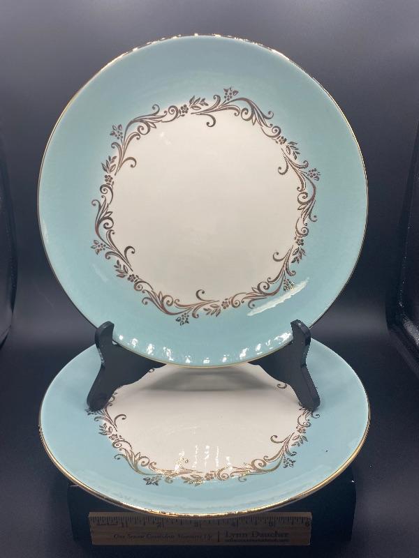Beautiful Teal & White Dinner plates. Gold vine accent. Gold Crown pattern. Made by Lifetime China Co. in Ohio. Good condition.