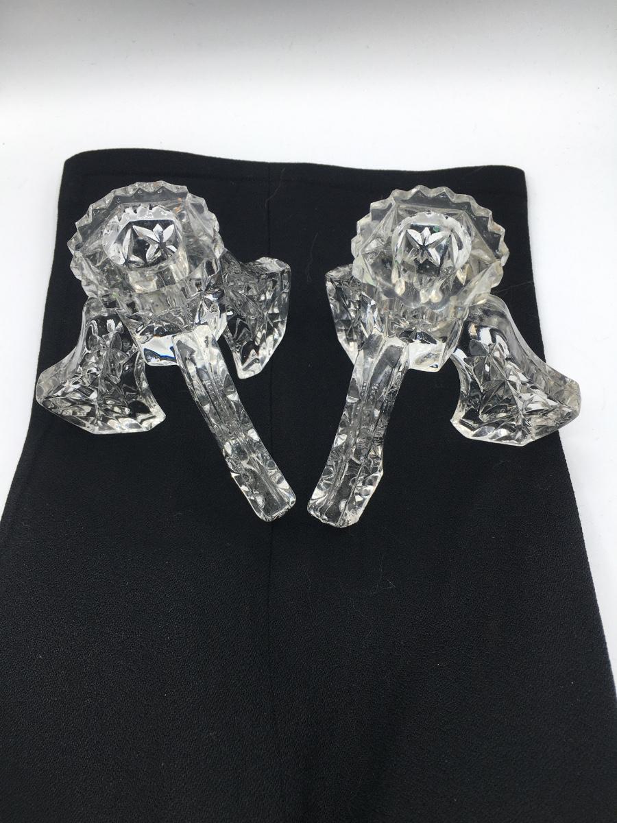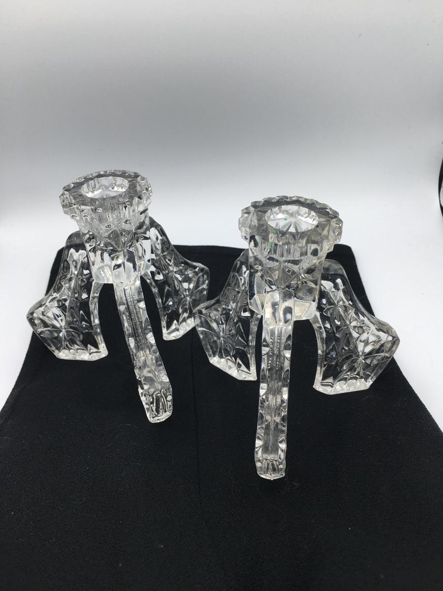 Gorgeous Vintage three leg/ tripod look pressed glass candleholders. 4 1/2 inches tall with no chips or cracks. Great for the holiday season