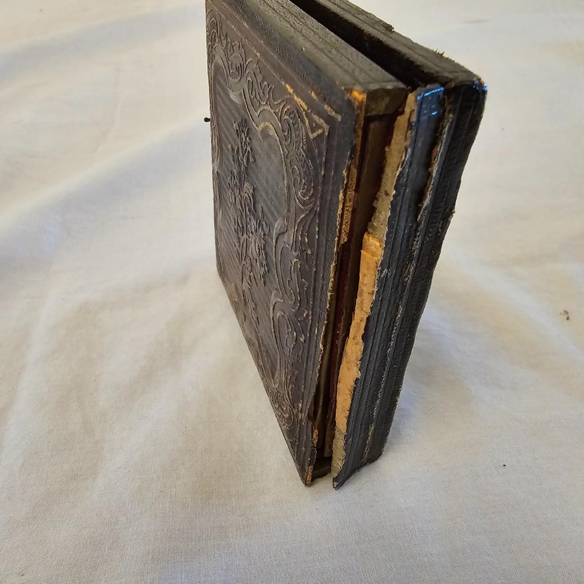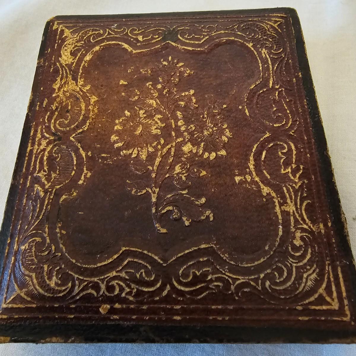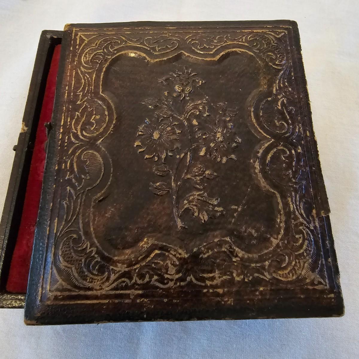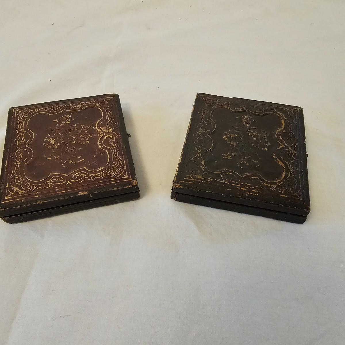 Two very old tintype portraits, one male one female. Possibly over 100 years old, these folks are dressed in the period style. Stamped designs in outside cases, inside fronts have velour like pieces with design as well. Pieces measure 3" x 3.5" x 1/2" thick. One case has broken spine. See photos for details. Shipping available.