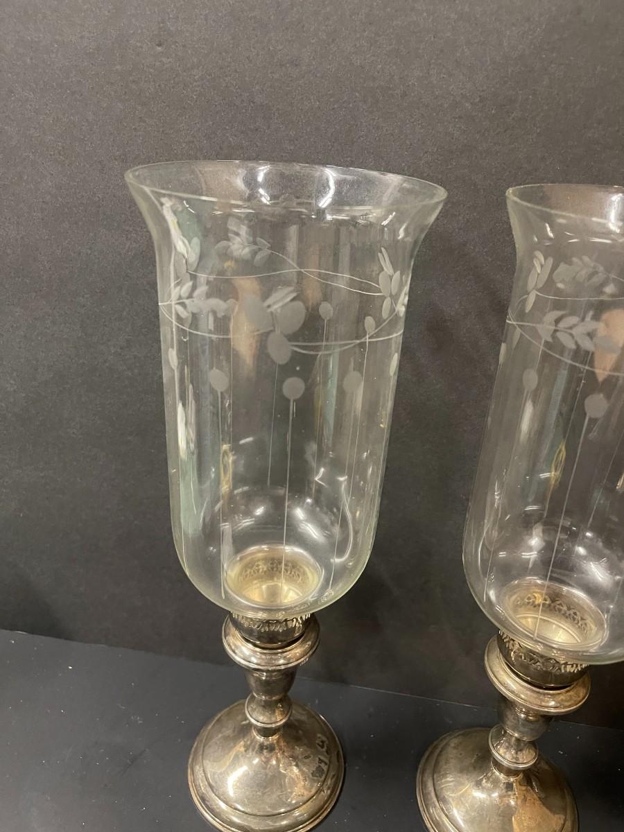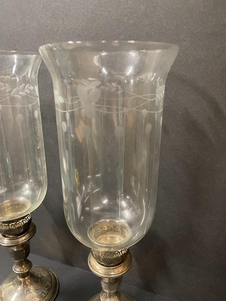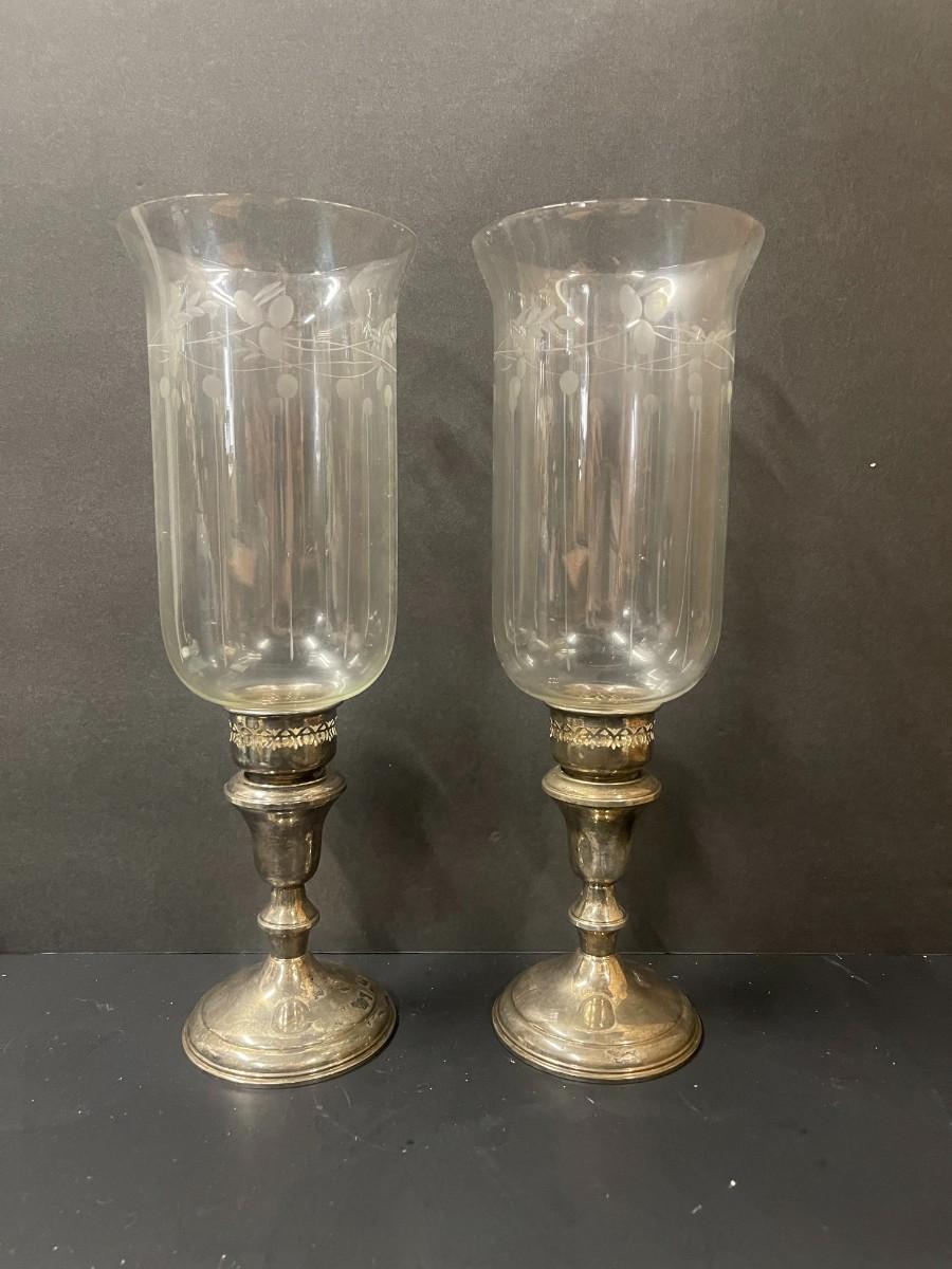Pair of vintage Towle weighted sterling silver candlesticks with etched crystal hurricane globes. Very good condition. 12 1/2" high.