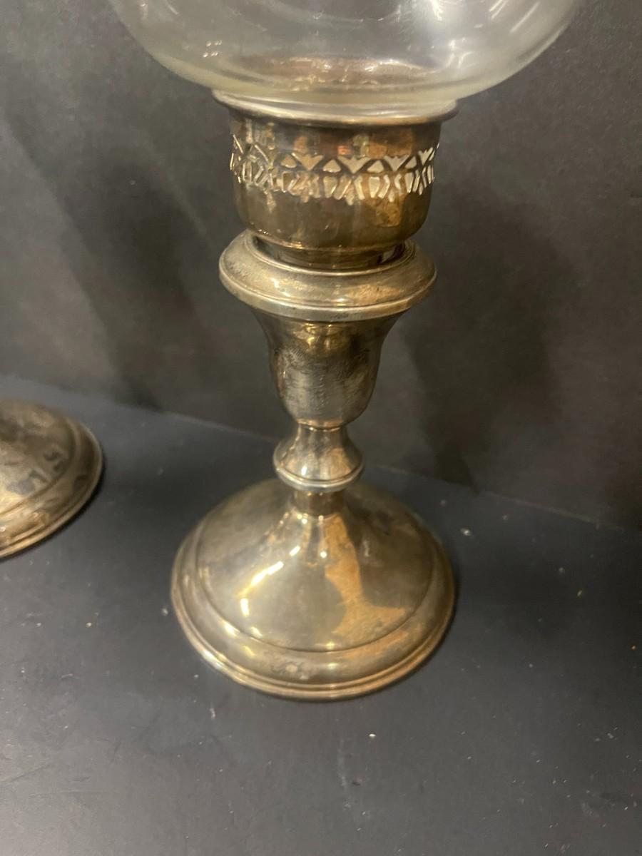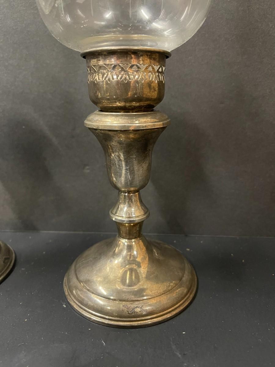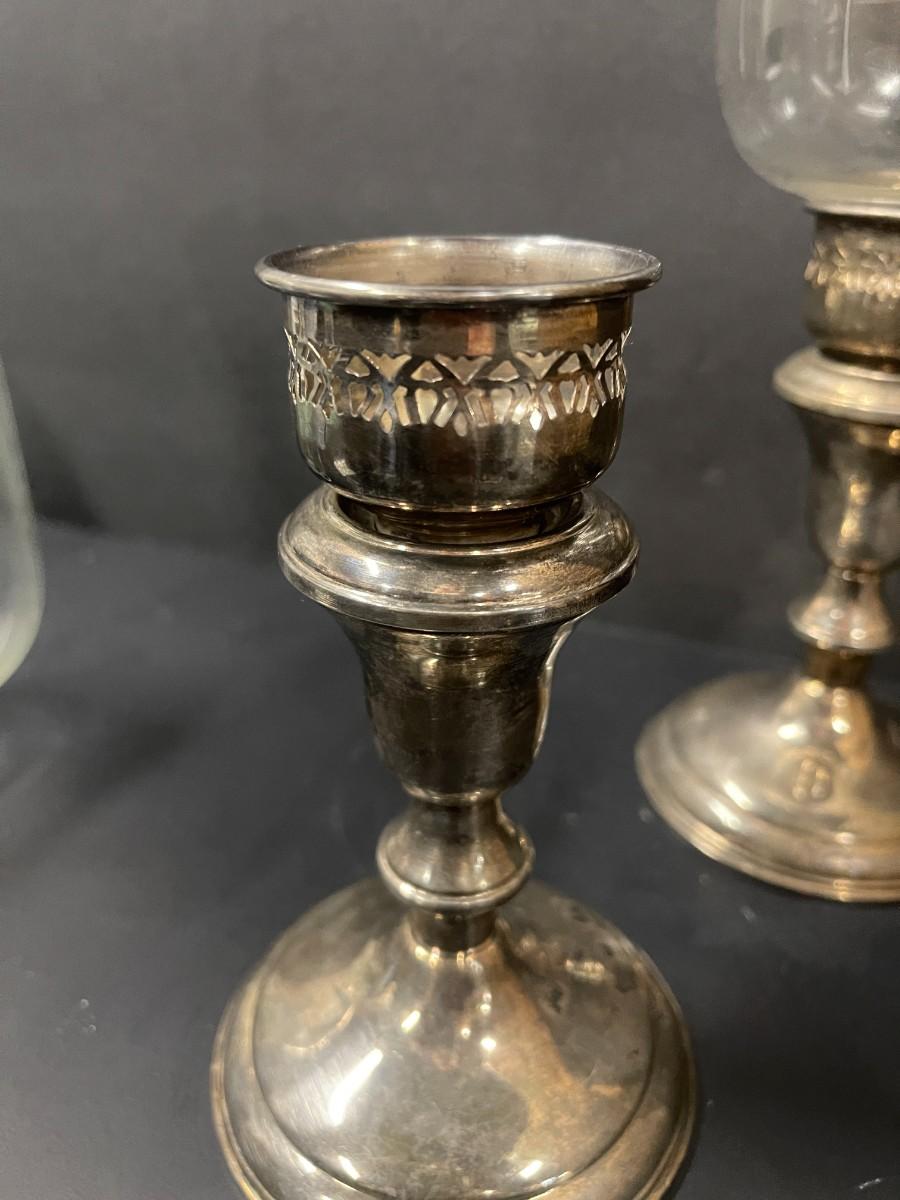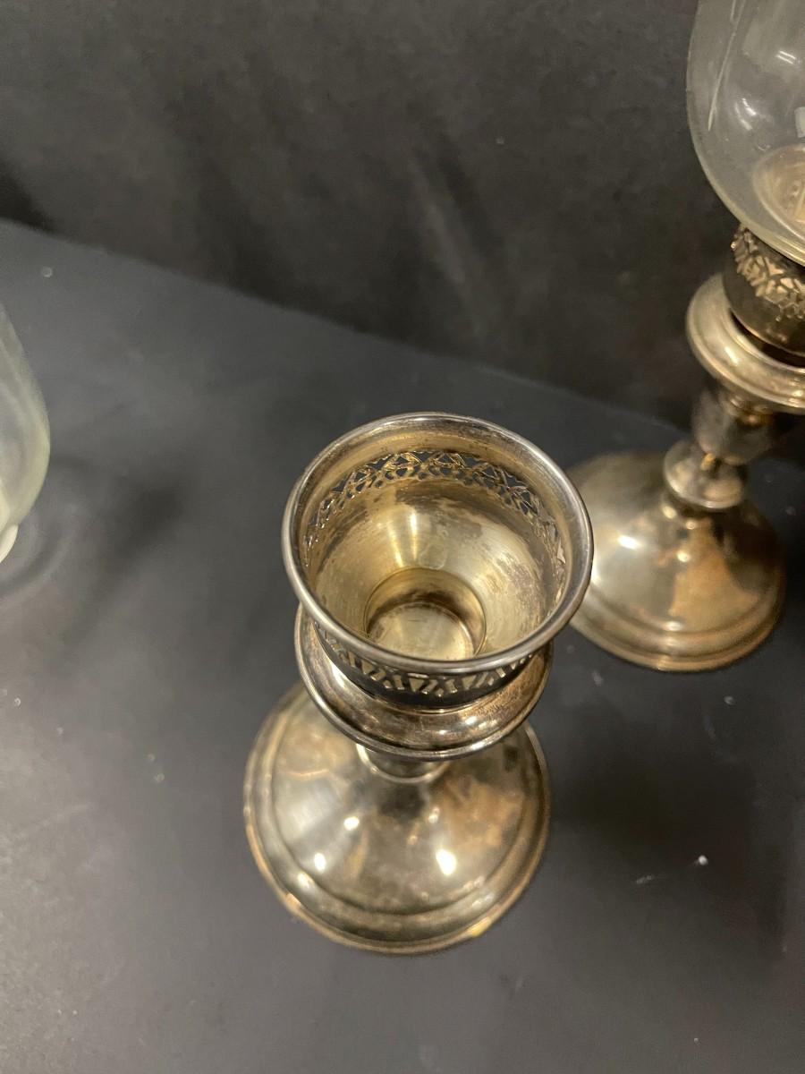 Pair of vintage Towle weighted sterling silver candlesticks with etched crystal hurricane globes. Very good condition. 12 1/2" high.
