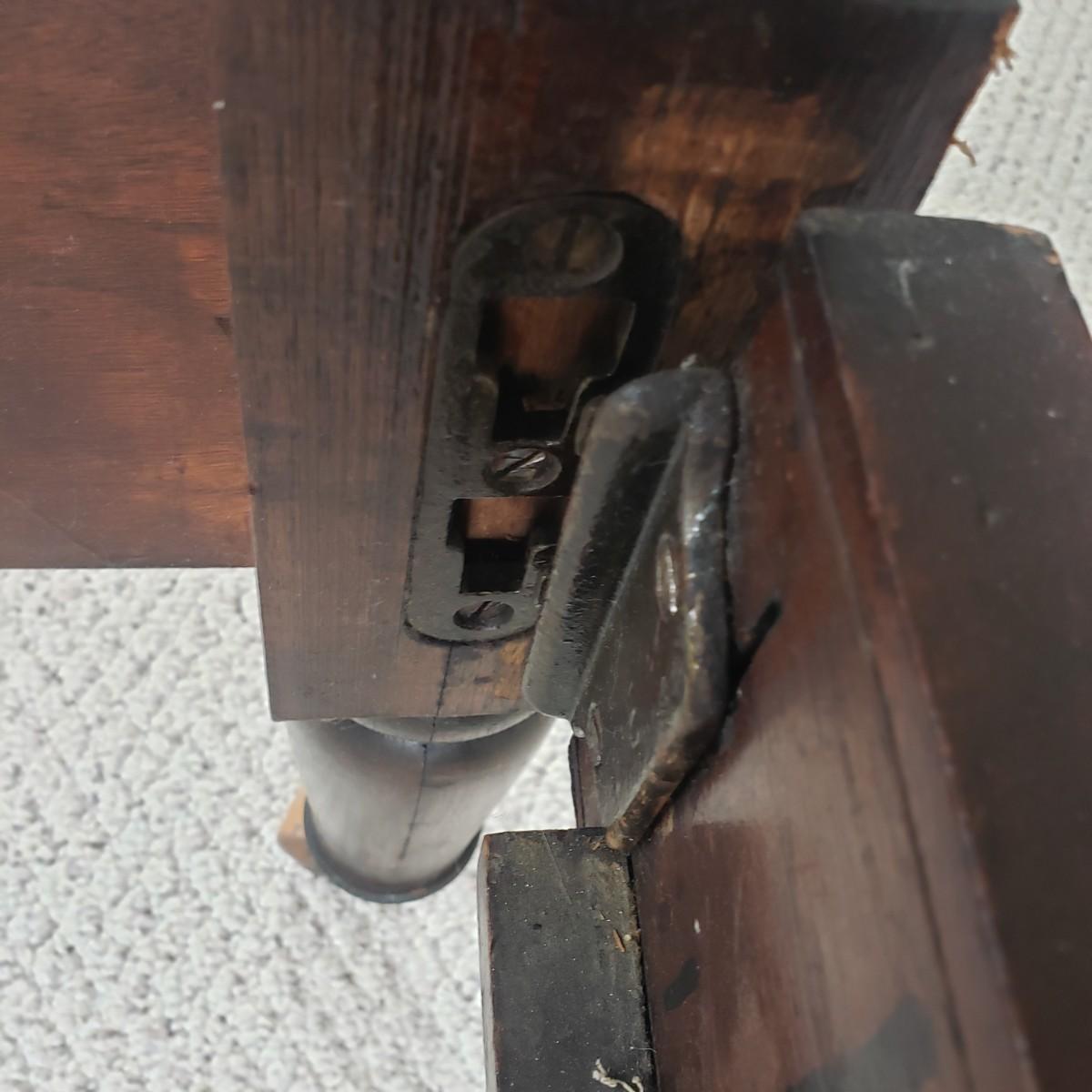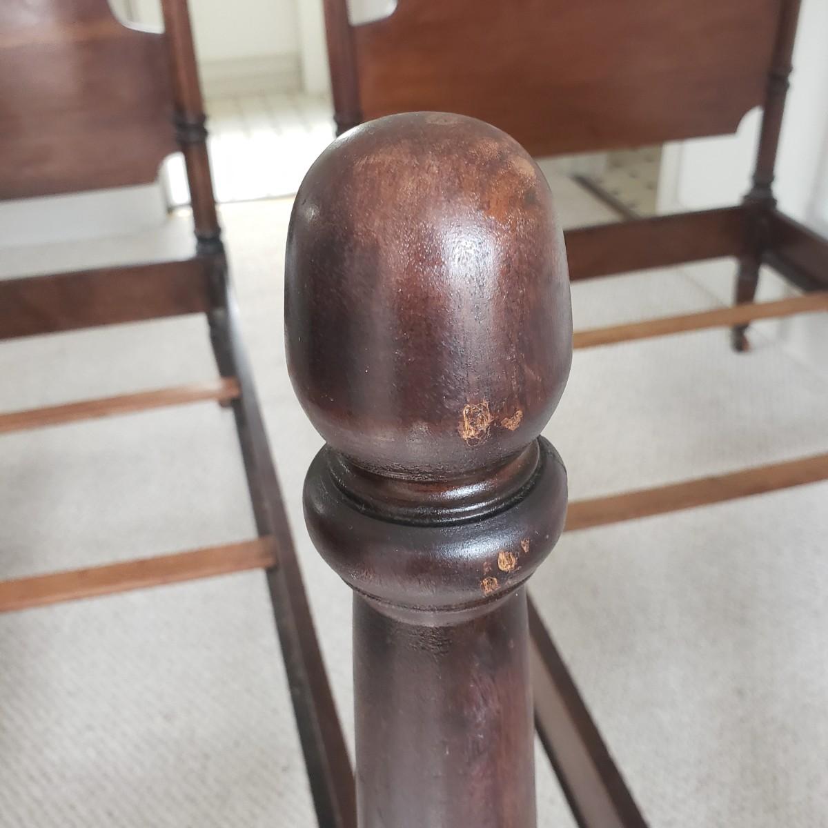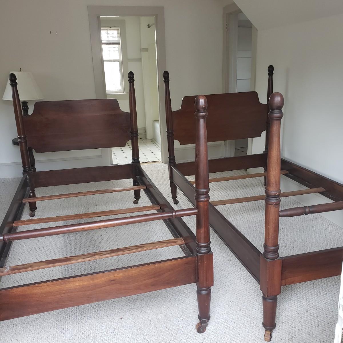 This matching pair of wooden twin bed frames are just stunning! They easily break down for transport. The sidebars fit into a metal latch system. Appears sturdy. No tools needed, the bracket just slips out. Each bed measures 80" x 43" x 52"H. Beds show minimal wear given their suspected ages. Frames are located in a garage apartment, so you will need to carry down to the driveway.
