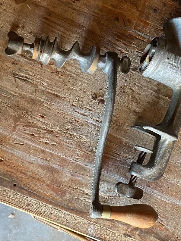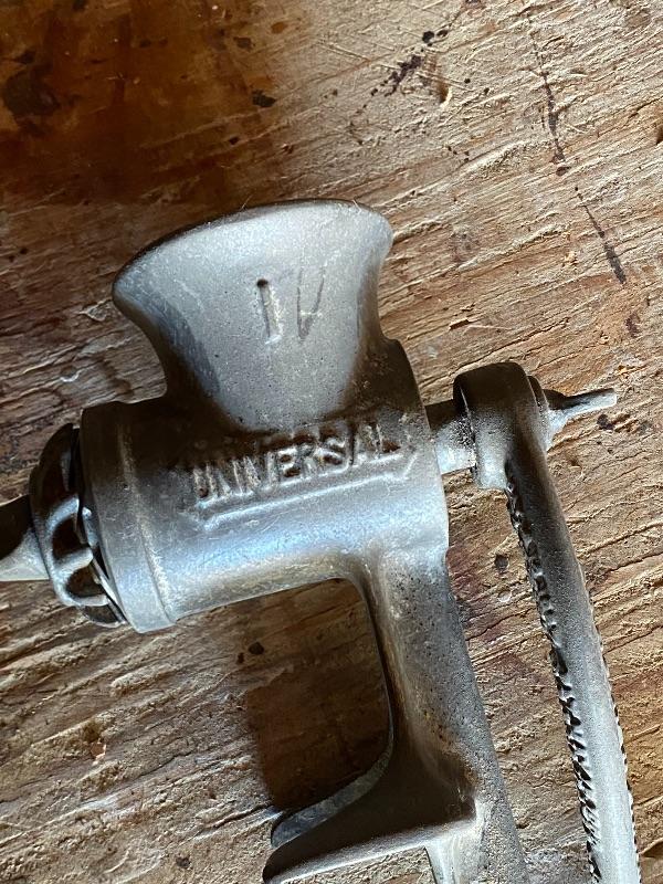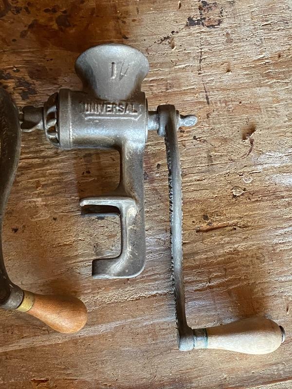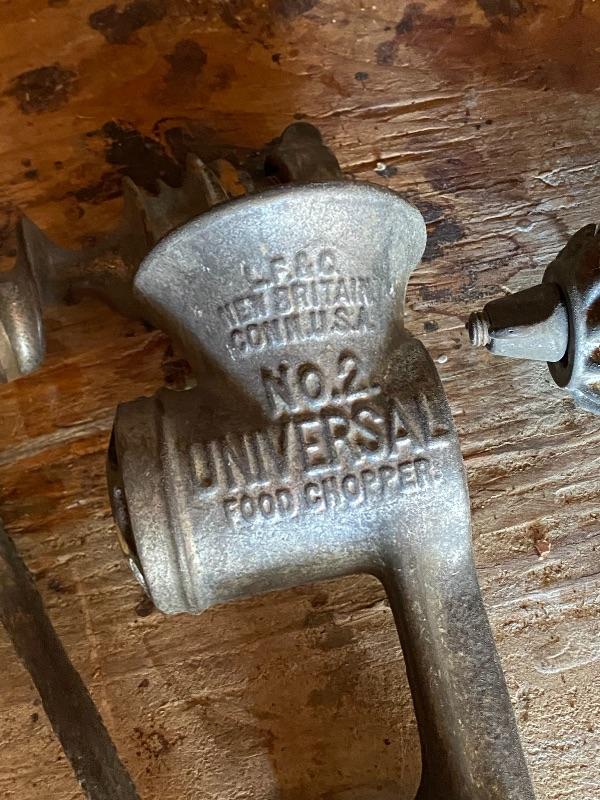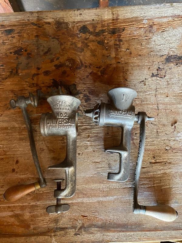 Pair of Universal meat grinders. Countertop mount. Great for display. Both are incomplete, missing parts.