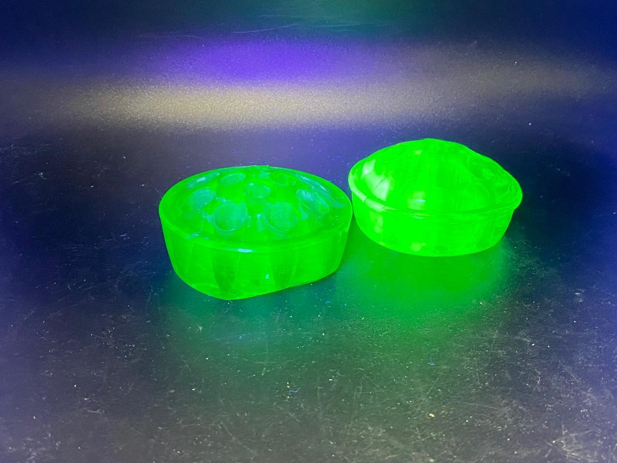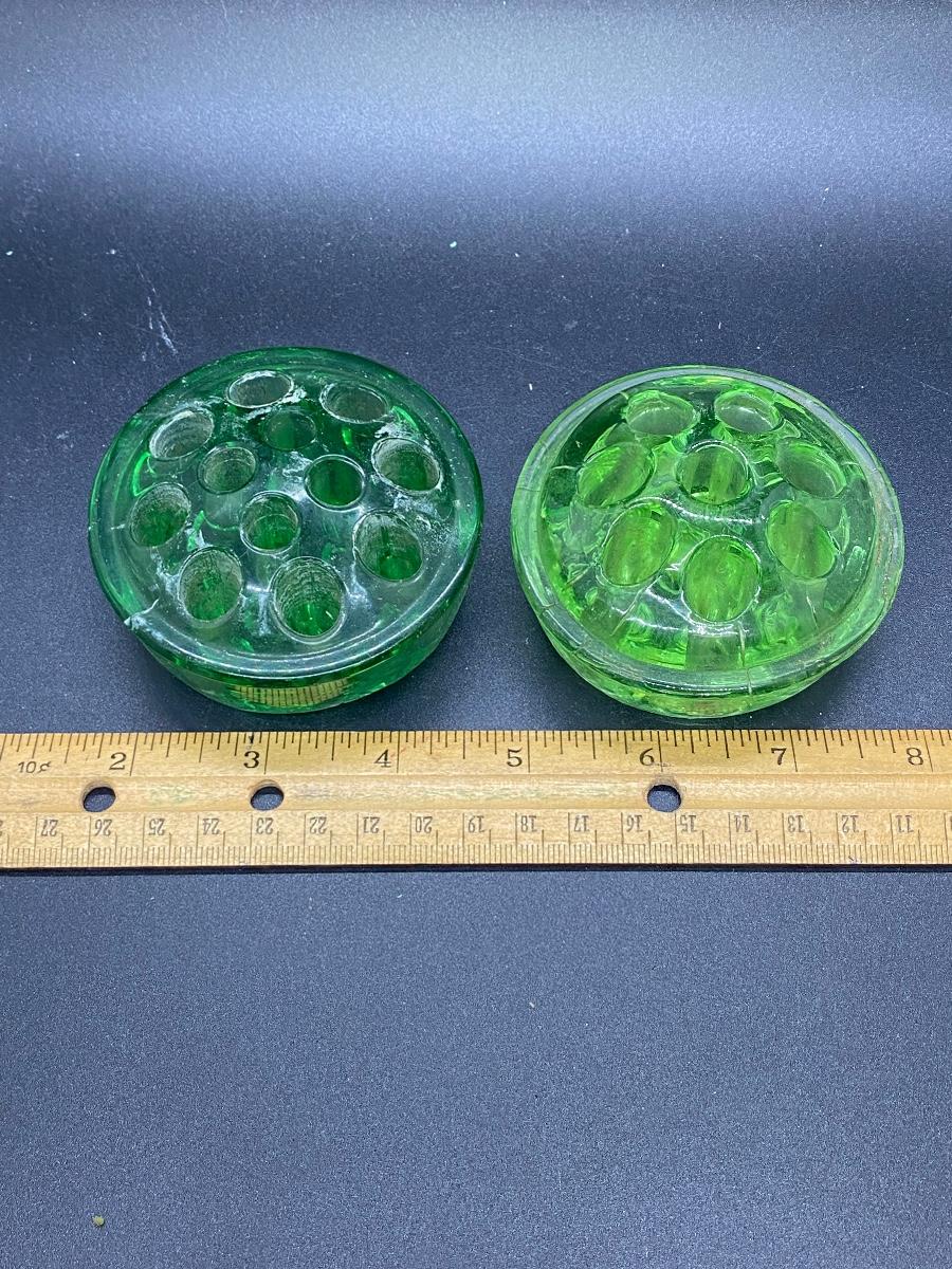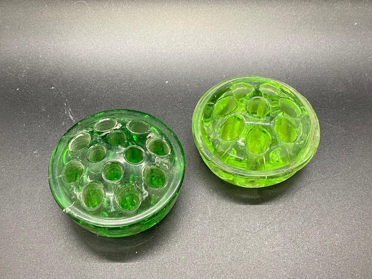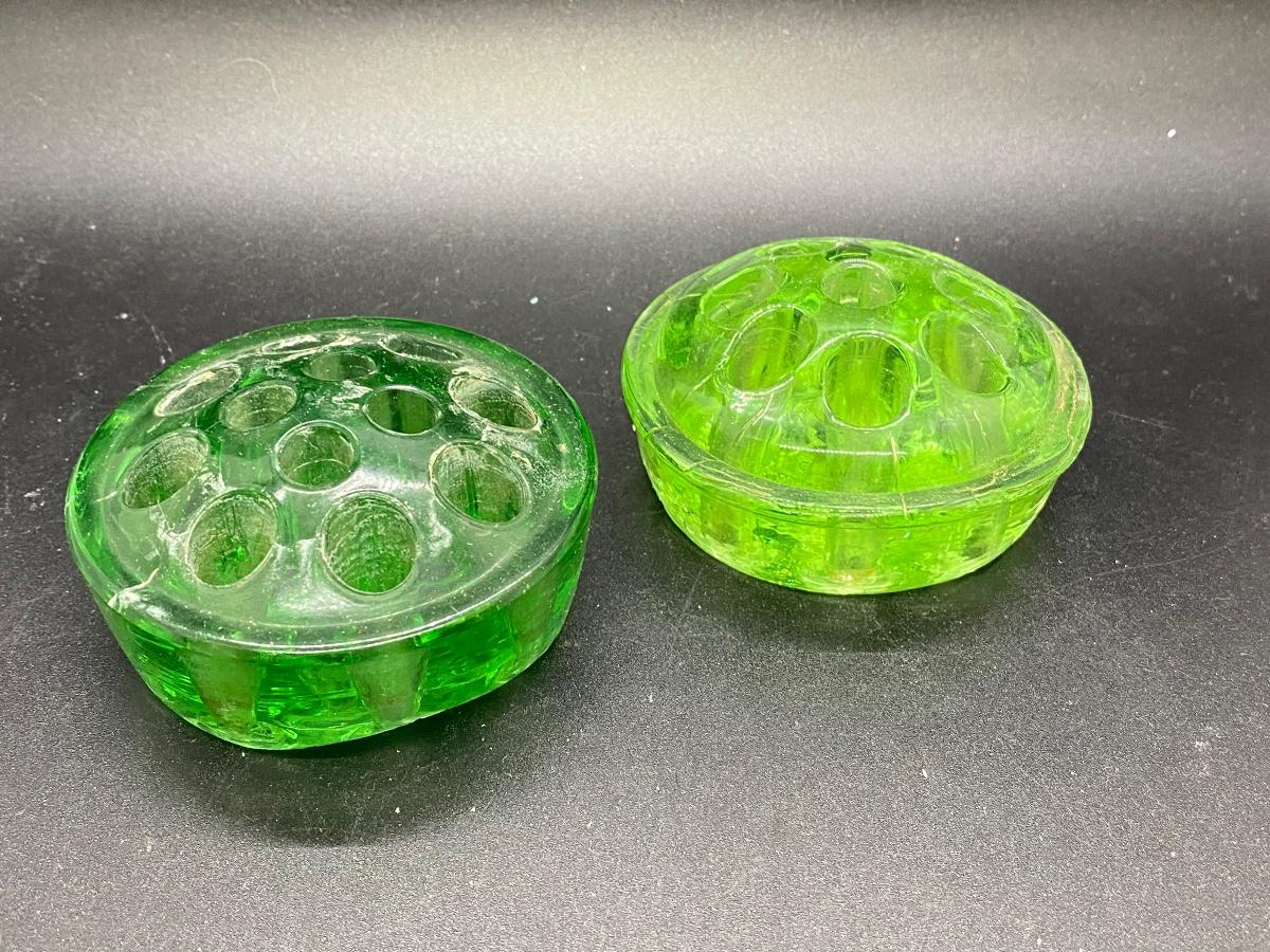 Pair of vintage Vaseline glass floral frogs. Green glowing uranium glass, one with 12 holes, the other with 8. Some rough edges, no major chips or damage noticed. About 3" size.